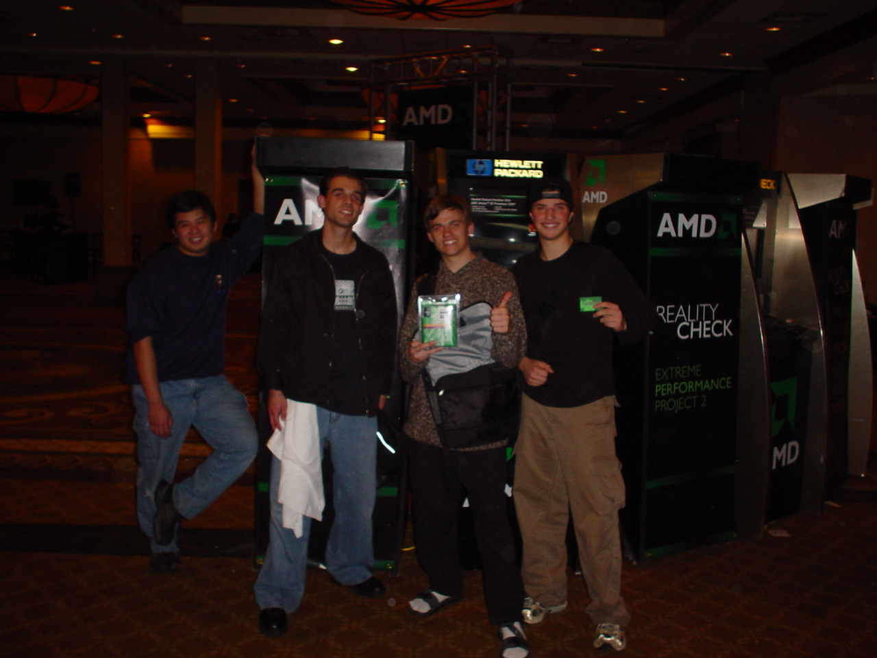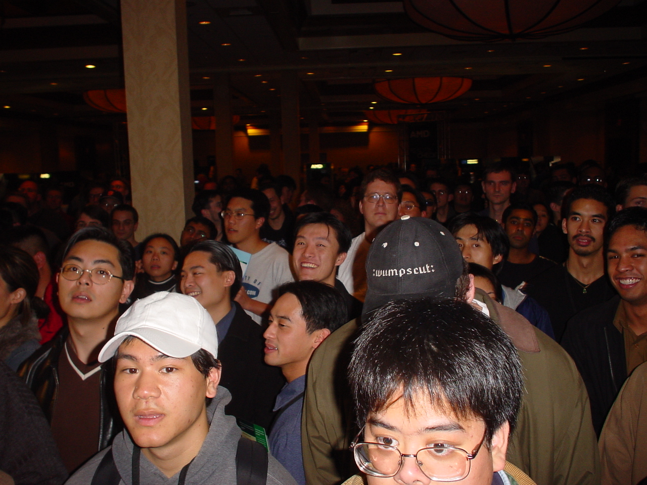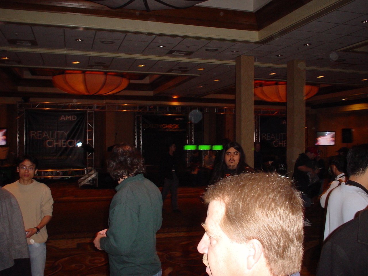 Jen went to work obtaining an AMD shoulder bag, and some of us grabbed some snacks off the food table before the non-VIP mobs were let in. QueMine was able to tweak the P4 so that it was playable on UT 2k3 and then proceeded to kick everyone else's butt.