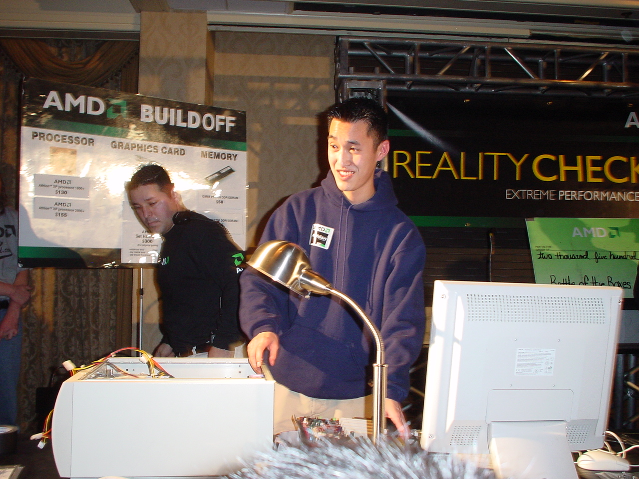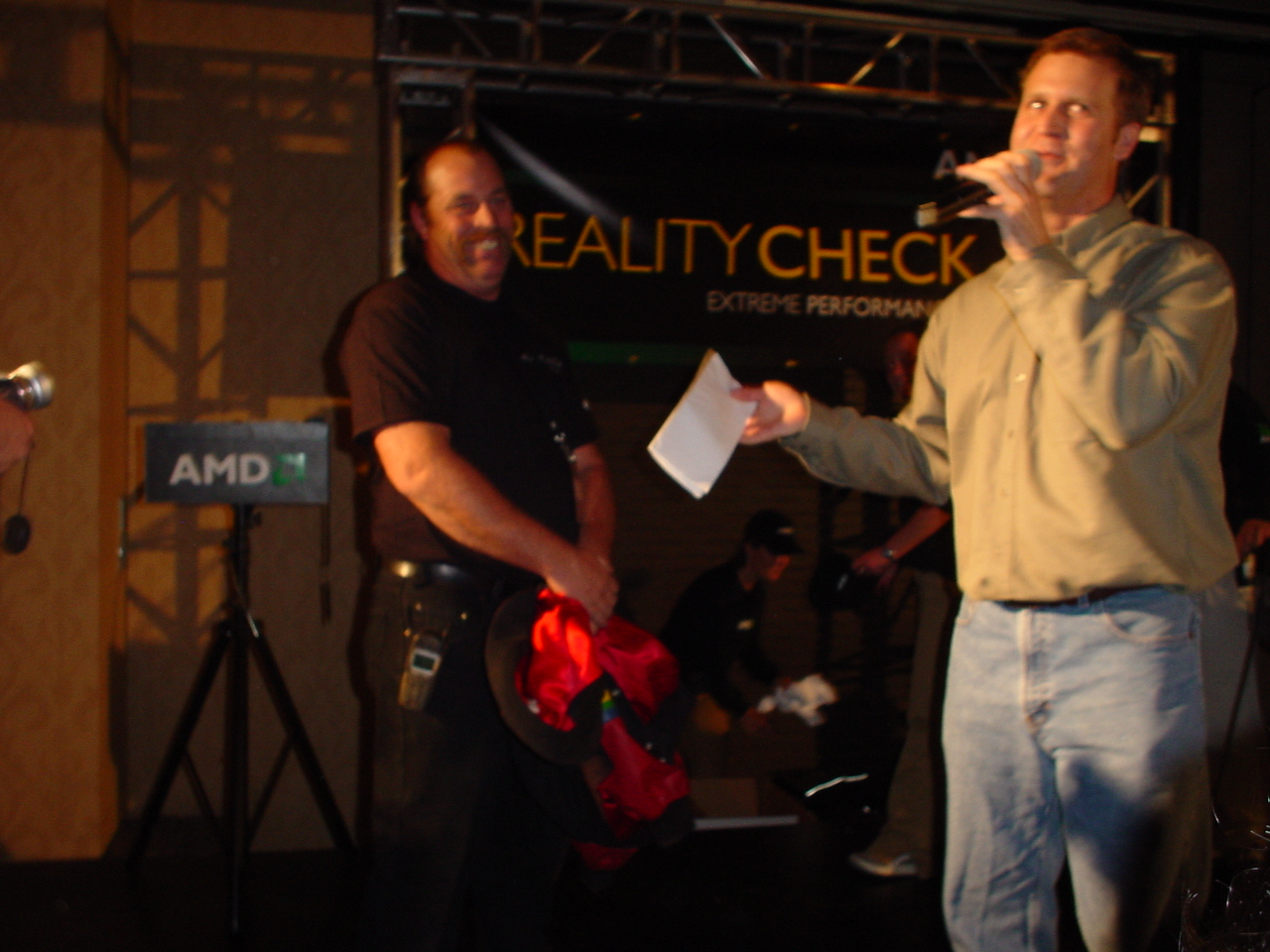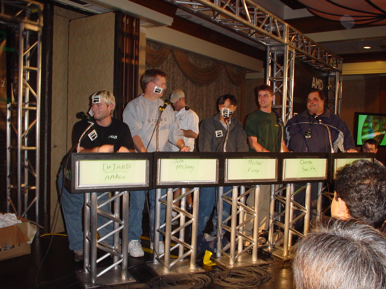 Some free stuff was thrown out into the crowd and a few processors were raffled off. Jen happened to be one of the lucky winners of an AMD XP 2400+ processor. Next, contestants were taken out of the audience to compete in a game show like event where they had to answer questions about AMD products in order to be eligible for the "Battle of the Boxes" (which I will discuss later). Unfortunately, most of the contestants chosen didn't know a great deal about computers and many of the nerds in the audience were shaking their head saying "I can't BELIEVE they didn't know the answer to that!"