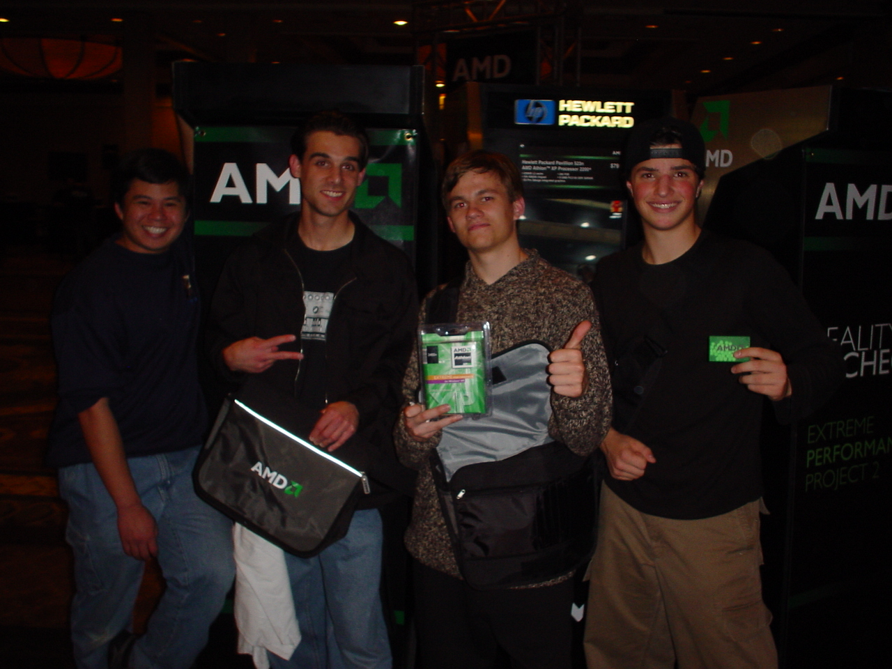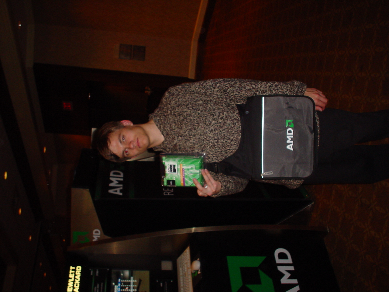 In one corner an AMD representative was describing the thermal characteristics of the AMD processor. His explanation was very basic and we quickly decided we could easily get more info on this from Tom's Hardware Guide or [H]ard OCP. We moved on to the kiosks where the gaming systems were set up. Each kiosk featured a game like UT 2k3 or Jedi Knight 2 on either an AMD or an Intel based system. All the AMD systems were running on the Nvidia Nforce motherboards (with built in GeForce 2 MX graphics cards), while the Intel based systems were running on Intel boards with built in Intel graphics. Needless to say Intel's built in graphics are extremely inferior to any GeForce based graphic solution (even an MX). Un-surprisingly the P4 was very choppy when running graphic intensive games. There was an AMD representative standing nearby the kiosks whose job it was to say, "See! Look at how slow Pentium 4s are compared to AMD processors!" Most of the people that saw this seemed impressed, and nodded in approval as if to say, "if only my Intel buying friends could see THIS!" I then came to the conclusion that most of the people there were either totally ignorant, or where there to brown-nose with the AMD people. It doesn't take a rocket scientist to figure out that this was an unfair comparison of processors. This comparison was really only useful for comparing the graphics solution and not the performance of the processor. After seeing this we knew we were in for one big giant AMD propaganda fest. Once we found out we were being intentionally deceived and weren't even going to be seeing any demos of upcoming technology; our focus quickly shifted to finding as much free stuff as possible.