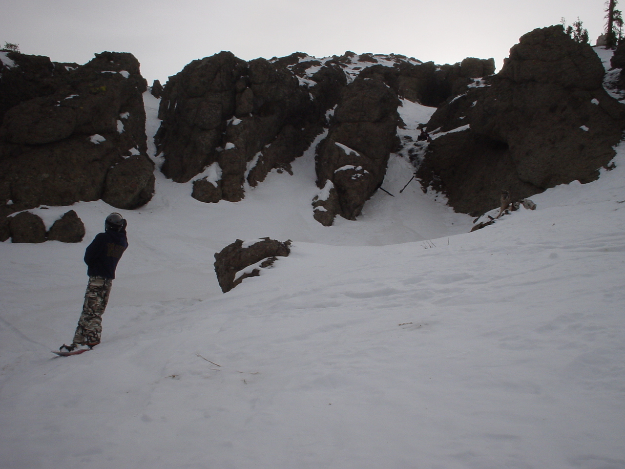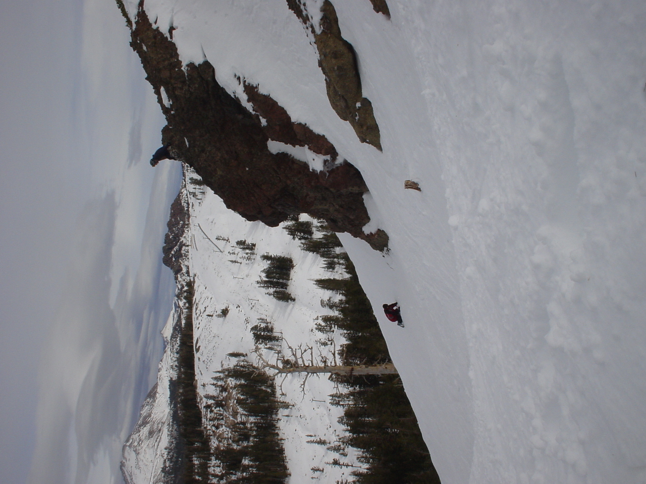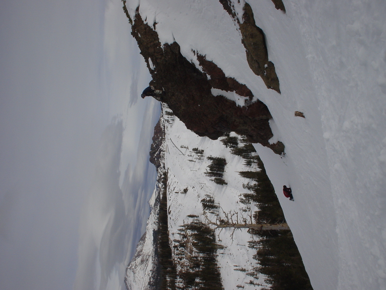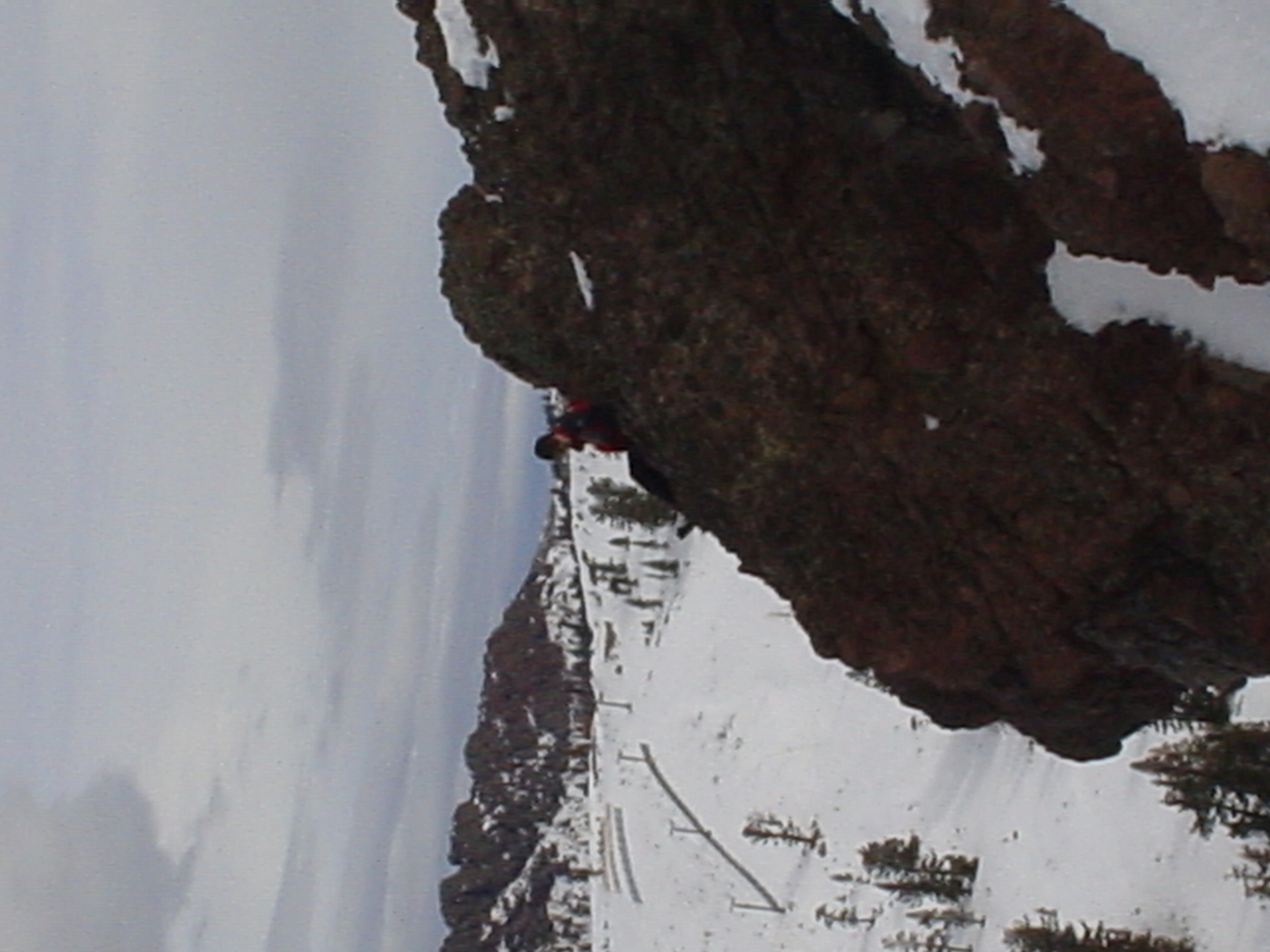 This day turned out to be even better than the first day. We did a lot of traversing off the marked trails in search of good powder. We ended up finding more rocks than powder (as the scrapes on the bottom of my new board can attest too) but we had a lot of fun anyway. A couple of times we ended up getting a bit stuck out in the rocks. We had to convince Dima not to jump off of a large rock that had instant injury written all over it. Finally we were able to talk him out of it. A few minutes later he got himself stuck behind another large rock. He was unwilling to hike up and around it, so instead he was faced with jumping and sliding down a small ravine that went through the rock. This time, instead of trying to convince him not to jump we did the opposite. Spiderman climbed up the rock and slid down the middle of it, just for fun and to show the now apprehensive Dima that it was safe to jump. Finally Dima made the jump and slid down the middle of the rock.