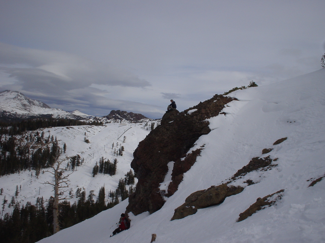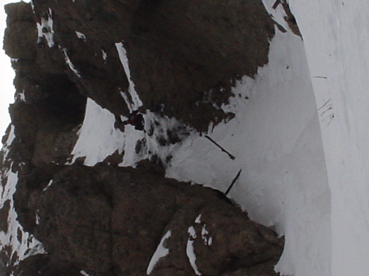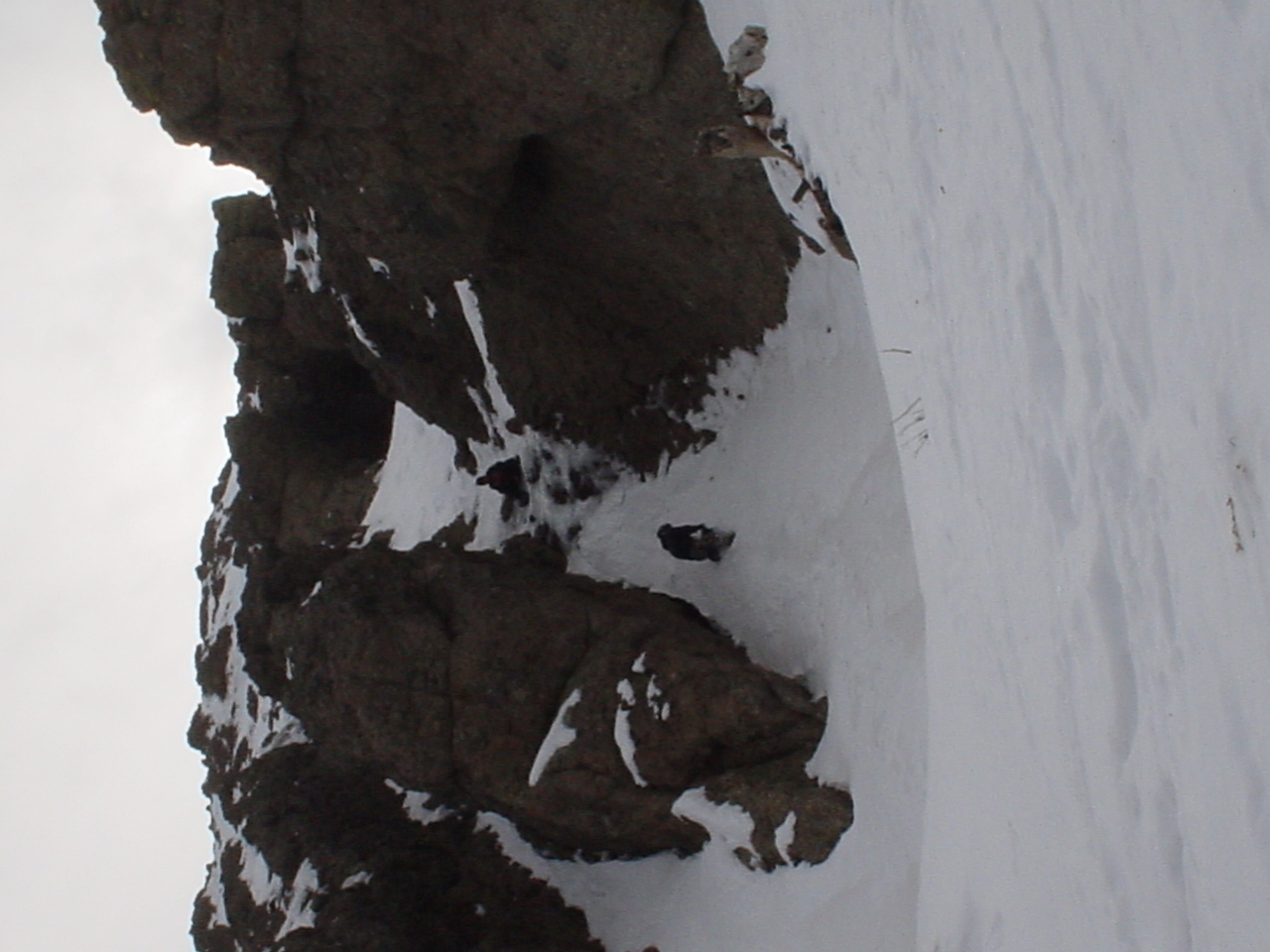 This day turned out to be even better than the first day. We did a lot of traversing off the marked trails in search of good powder. We ended up finding more rocks than powder (as the scrapes on the bottom of my new board can attest too) but we had a lot of fun anyway. A couple of times we ended up getting a bit stuck out in the rocks. We had to convince Dima not to jump off of a large rock that had instant injury written all over it. Finally we were able to talk him out of it. A few minutes later he got himself stuck behind another large rock. He was unwilling to hike up and around it, so instead he was faced with jumping and sliding down a small ravine that went through the rock. This time, instead of trying to convince him not to jump we did the opposite. Spiderman climbed up the rock and slid down the middle of it, just for fun and to show the now apprehensive Dima that it was safe to jump. Finally Dima made the jump and slid down the middle of the rock.