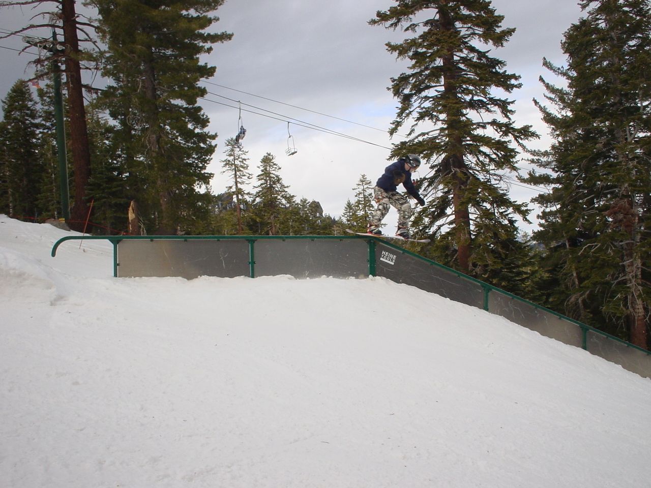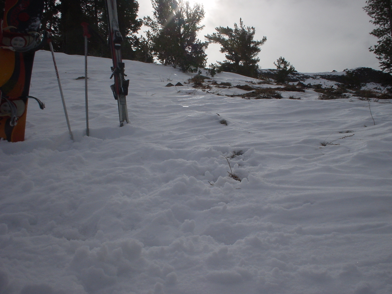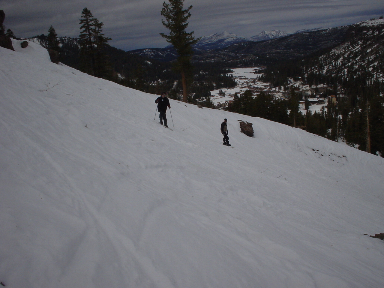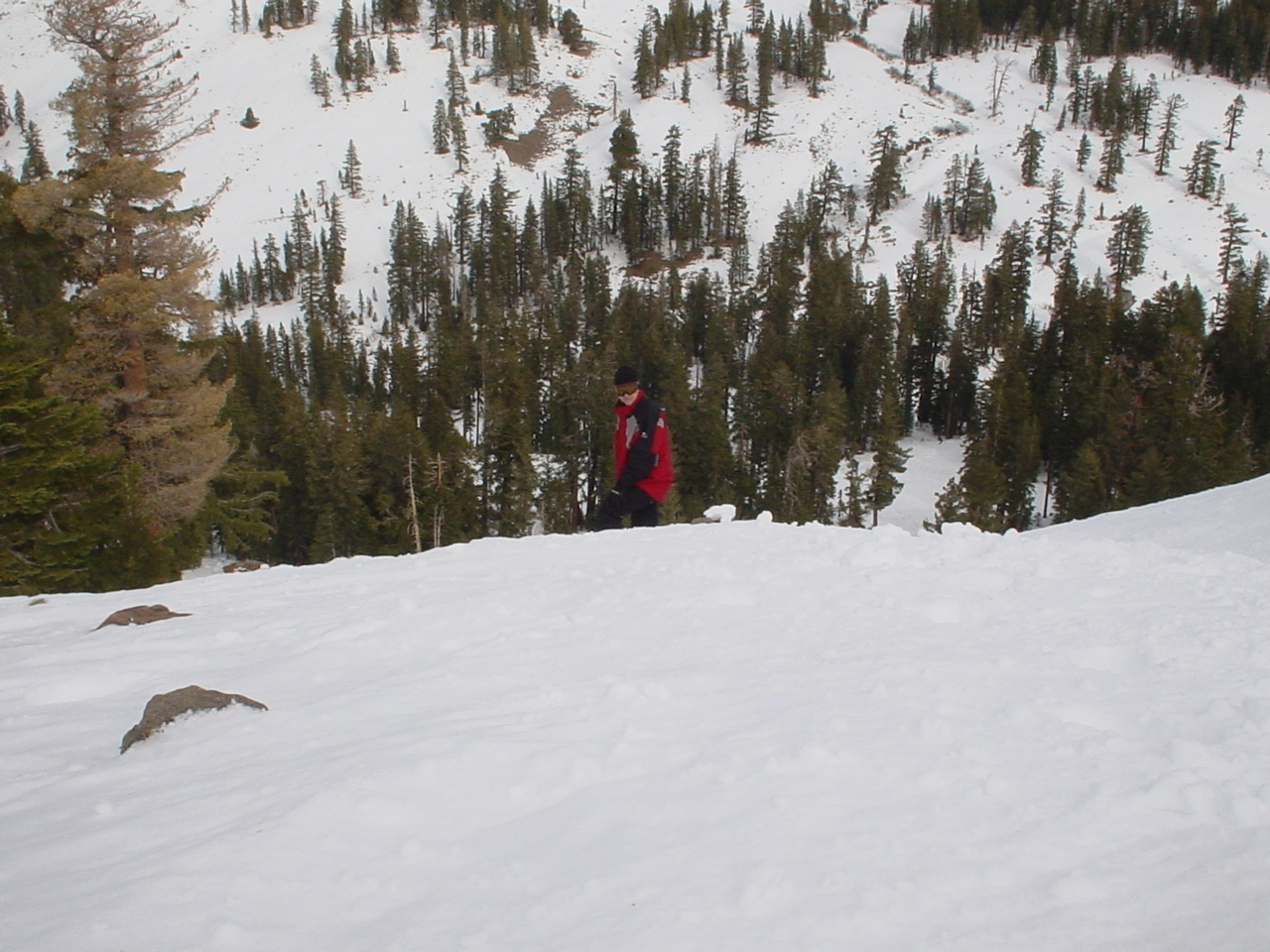 This day turned out to be even better than the first day. We did a lot of traversing off the marked trails in search of good powder. We ended up finding more rocks than powder (as the scrapes on the bottom of my new board can attest too) but we had a lot of fun anyway. A couple of times we ended up getting a bit stuck out in the rocks. We had to convince Dima not to jump off of a large rock that had instant injury written all over it. Finally we were able to talk him out of it. A few minutes later he got himself stuck behind another large rock. He was unwilling to hike up and around it, so instead he was faced with jumping and sliding down a small ravine that went through the rock. This time, instead of trying to convince him not to jump we did the opposite. Spiderman climbed up the rock and slid down the middle of it, just for fun and to show the now apprehensive Dima that it was safe to jump. Finally Dima made the jump and slid down the middle of the rock.
