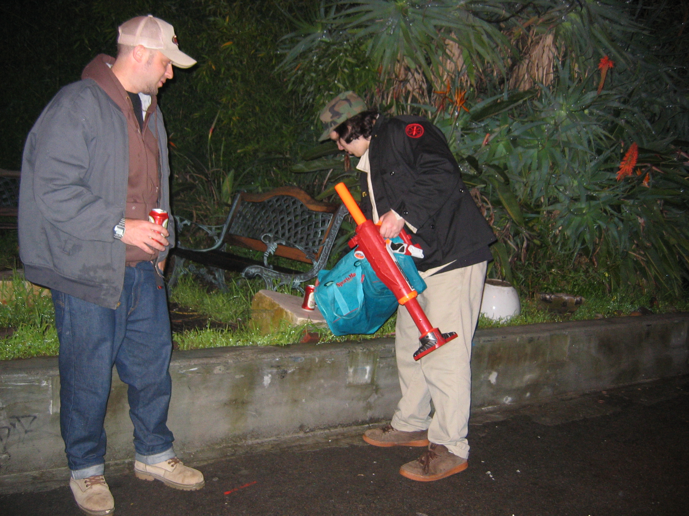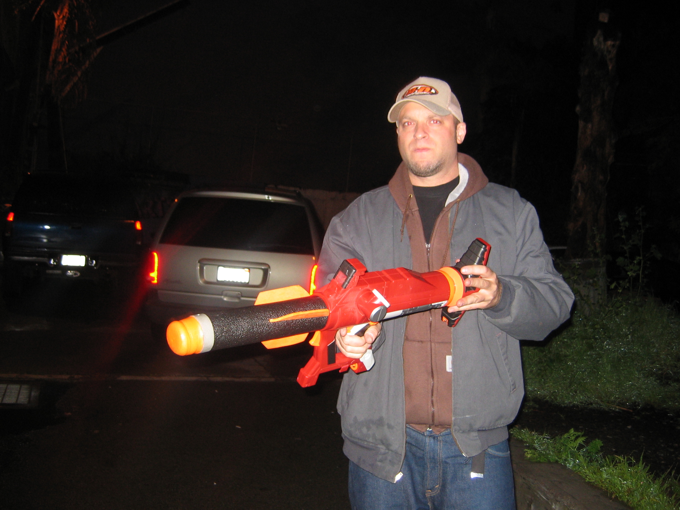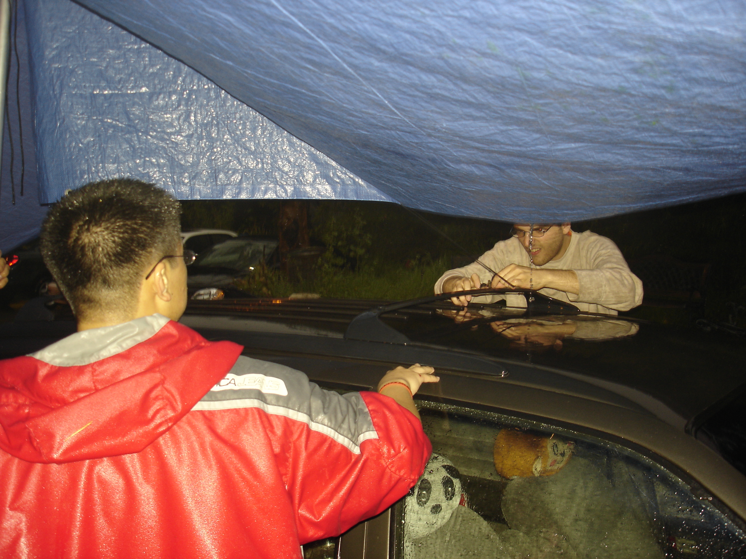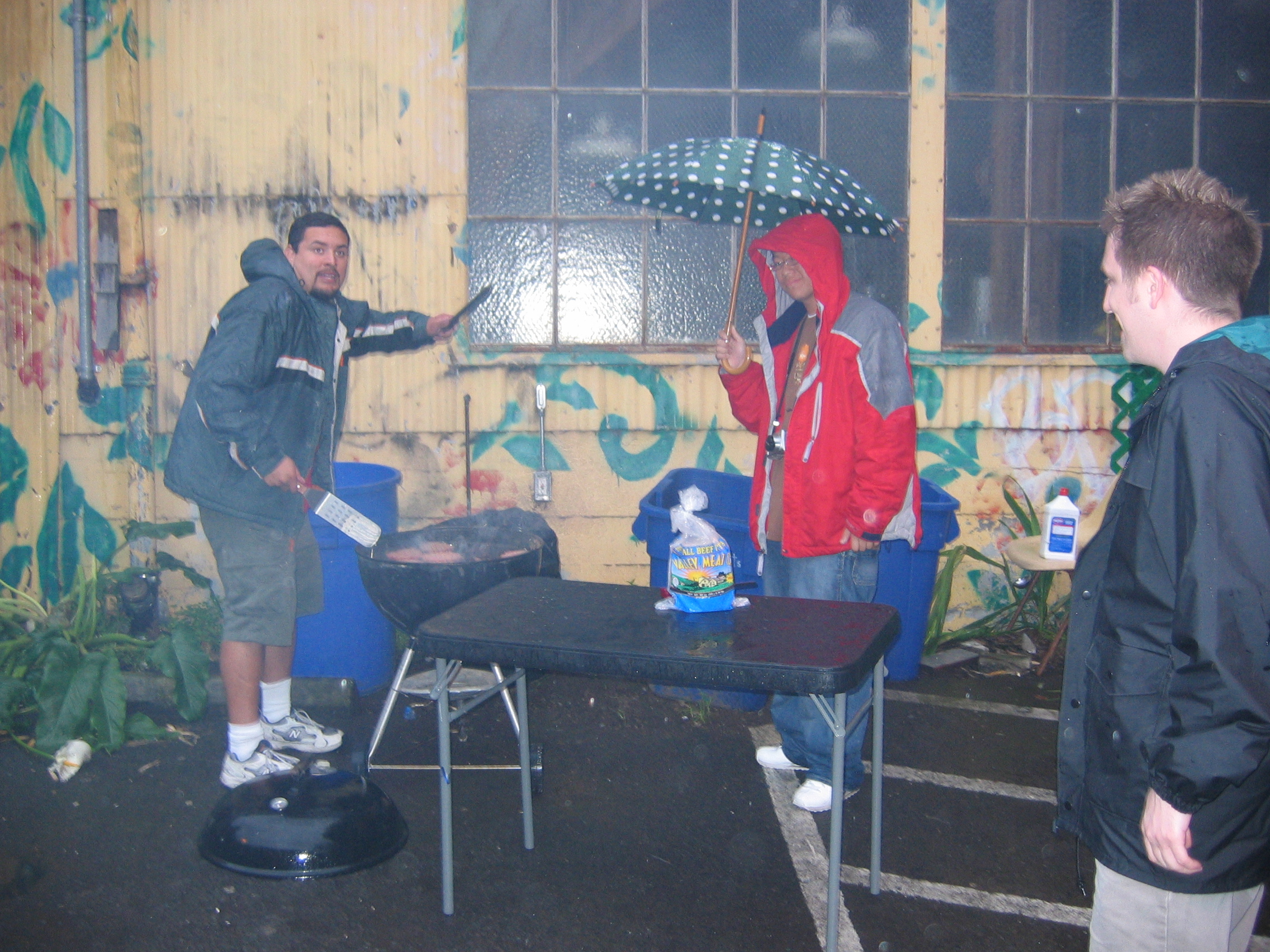 It was windy and rainy, and Ginger was attempting to BBQ outside. A makeshift shelter was rigged up using the Krazmobile as one of the anchor points. Eventually the wind blew it down on top of the Krazmobile. This one also did not feature any paintball craziness.