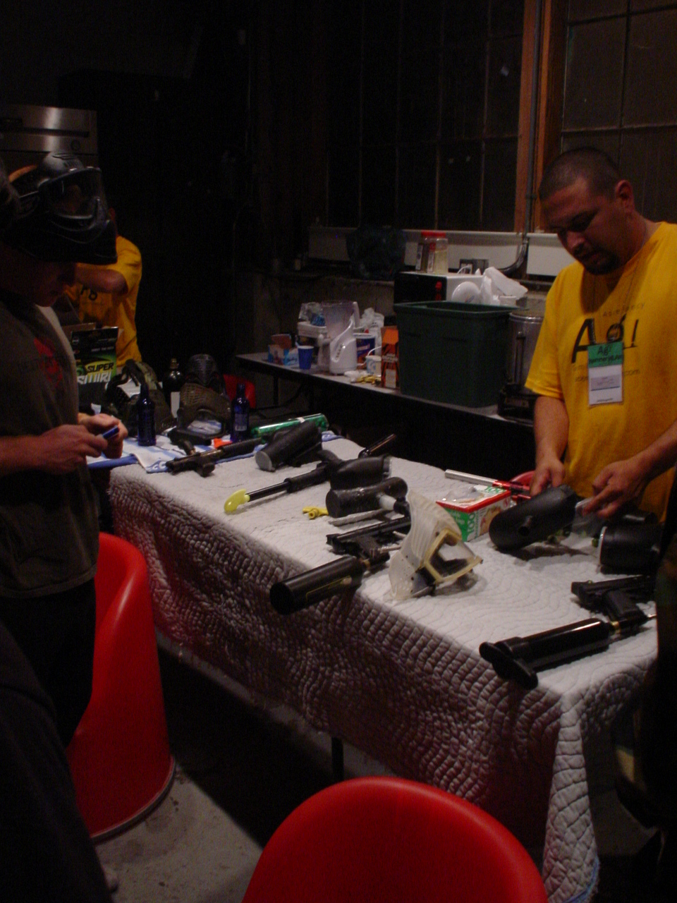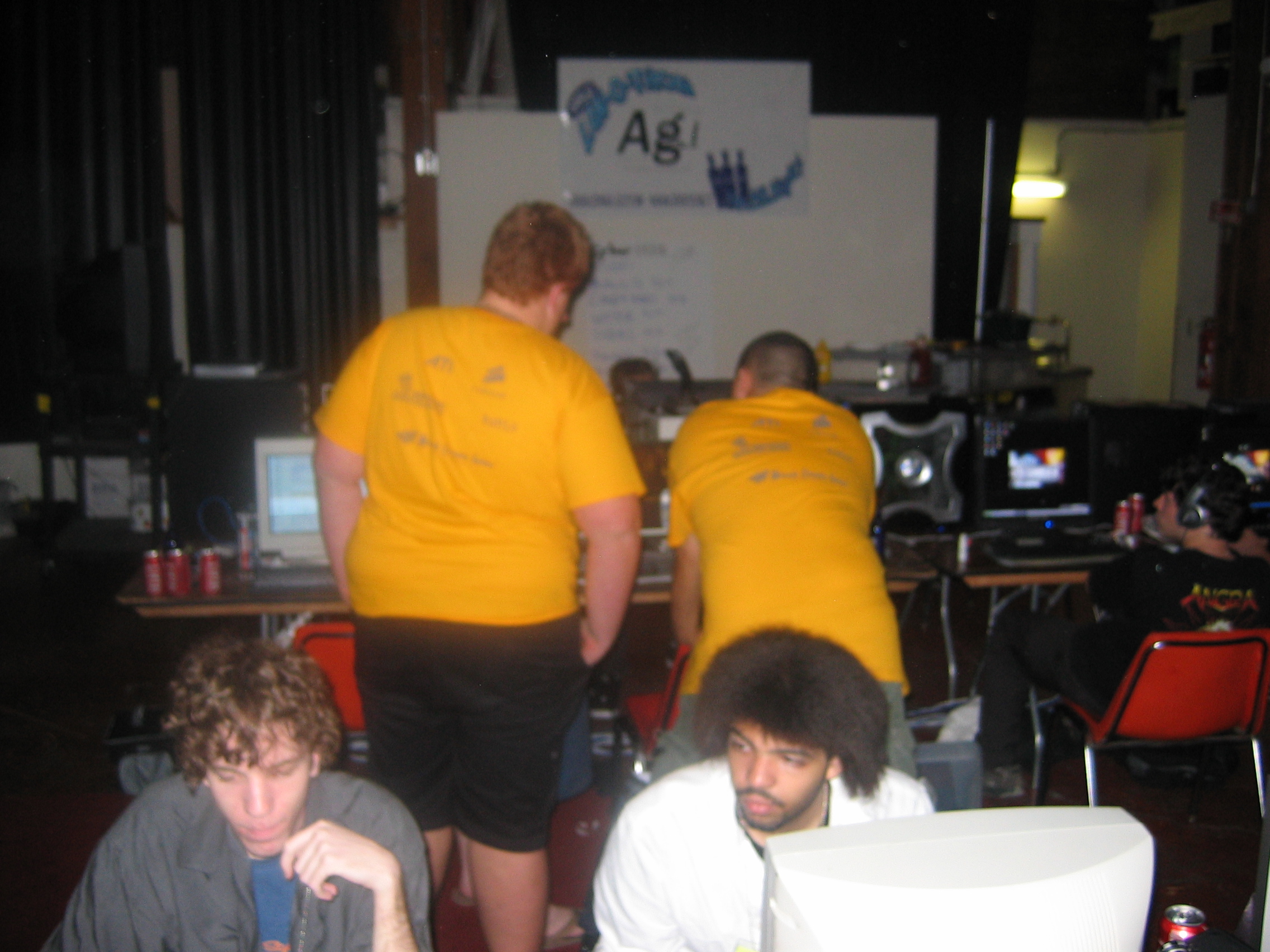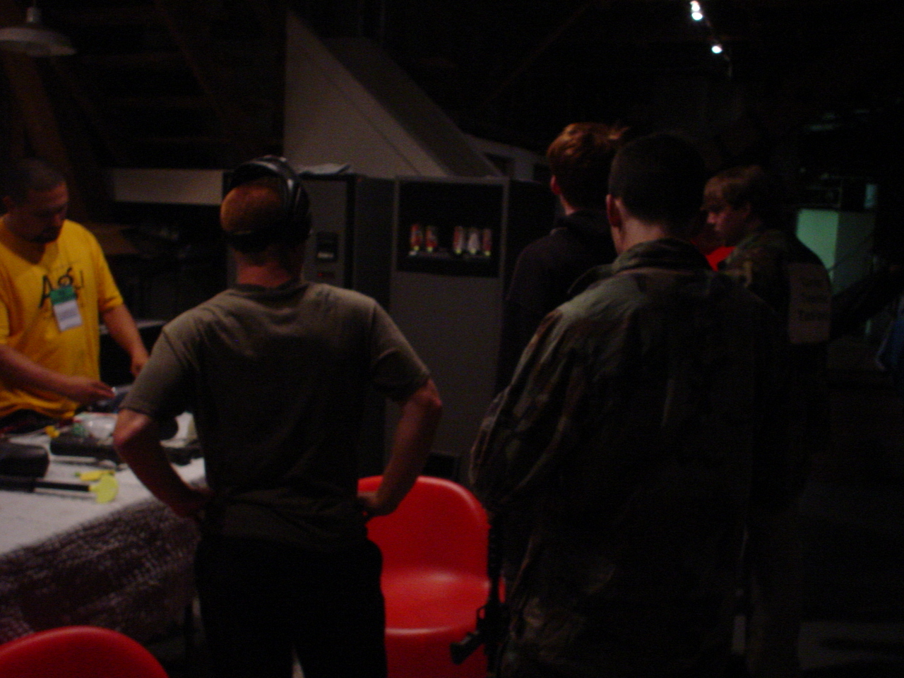 The Wheel of Consequence said that we were to shoot eachother with paintball guns in order to win our prize. We were all given AG LAN T-shirts, and told that from across the room, one of our team mates had to hit us somewhere on the AG LAN logo that was on the shirt. First up was Metalslug shooting me. Lukly he is a good shot, and hit right on target the first try. Next it was me shooting him. I ALMOST got him the first try, but was low about a milimeter. Unfortunately I overcorrected on my next shot, and got him in the neck.. but the third shot.. that one was good. Next, we had Metalslug shooting at Kuyaglen, and that took two shots. So we all got our prize which was a gig of RAM for each of us (worth about 100 bucks)... not bad.