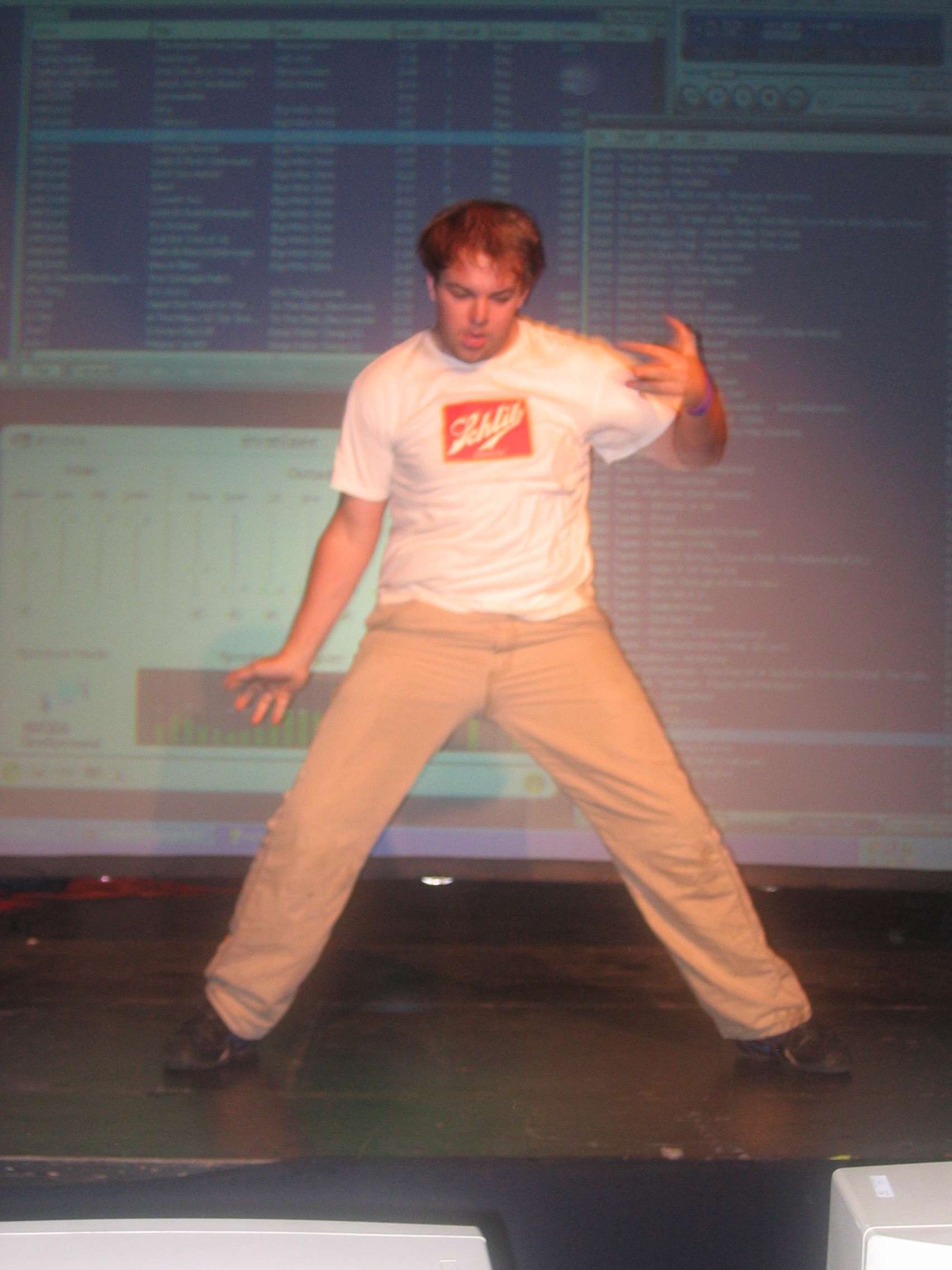 Another legendary AG LAN contest that took place at AG’s [S]ummer [s]LAN 2005 was the dance competition. In this competition, contestants were brought on stage one by one and given a few seconds to show off their best dance moves. Whoever was judged the best would win a prize. As you would expect at a LAN party, most everyone was pretty awful. A few guys actually had a move or two, but nothing to write home about, and most just did their best to flail around and look as stupid as possible in hopes of winning by providing the best laugh, and laugh we did.
