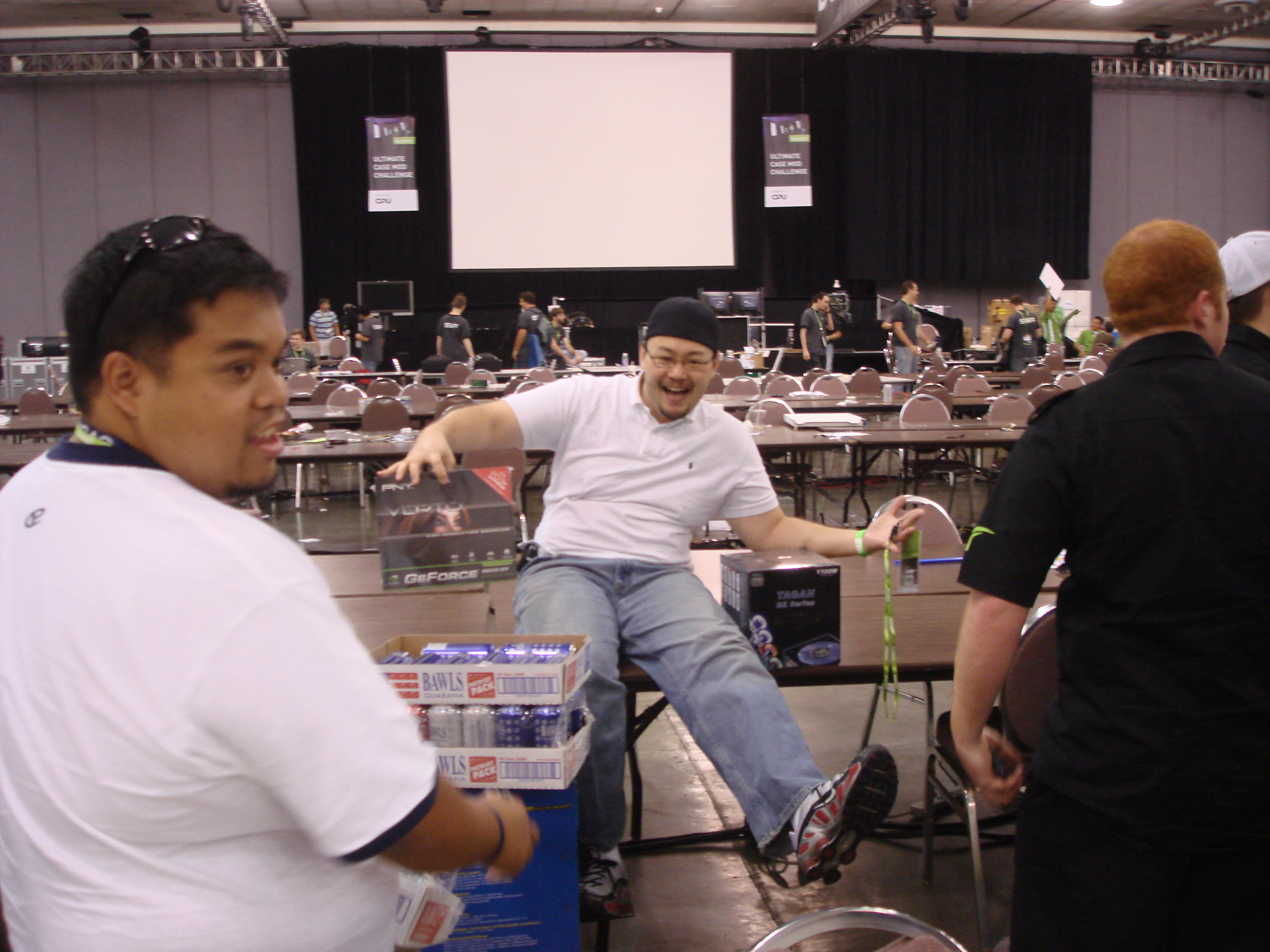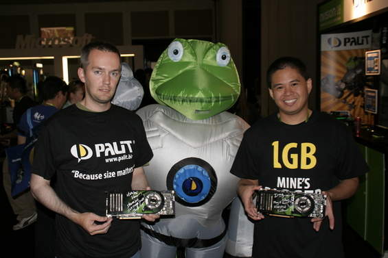 They presented their cards to EVGA who was very interested. From what I remember the guy at the EVGA booth had to find his manager to see what they were allowed to offer them. In the meantime, a company called Palit caught wind of this. Palit was an established brand in Europe but was a newcomer to the American video card market, and anxious to make a name for themselves. They decided to step in and make their own offer on these now famous cards. A bidding war between EVGA and Palit ensued. Quemine was torn as to which offer to take. He came to me regularly during the event and gave me updates on the latest offer and asked for advice on how to maximize the opportunity.