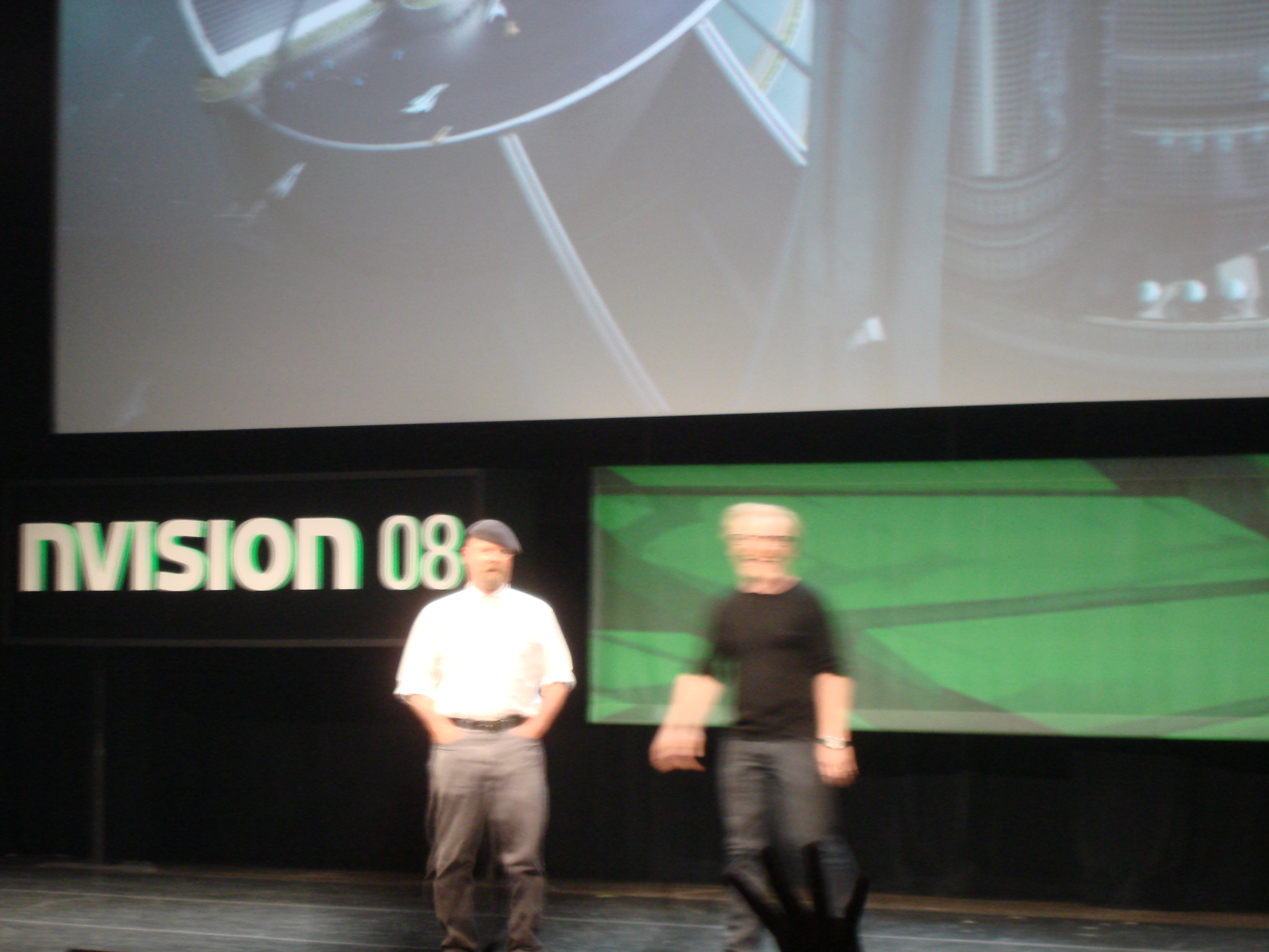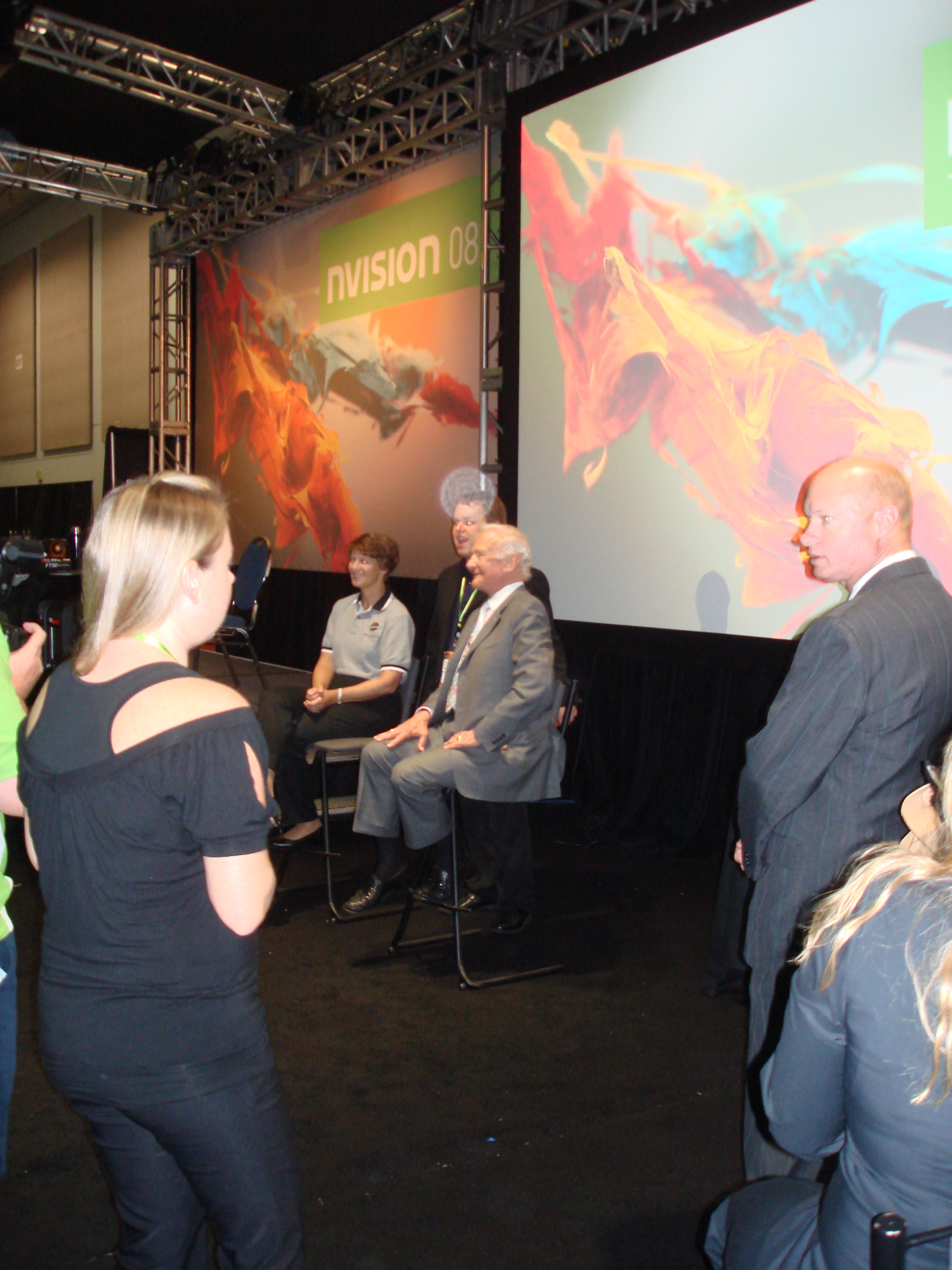Regarding the whole of Nvision 08, the event itself was huge. It took up all of the San Jose Convention center and nothing like it had ever been seen in the history of LAN events. A huge green carpet led up the walkway to the entrance, and event the fountains in the front of the convention center were spraying Nvidia green water. The tradeshow area of the event was very large and had a variety of vendors. There was a theater area set up to show off various 3D presentations and other tech demos or screenings. One of the screenings was a movie called “Fly Me To the Moon” and they even brought in some actual astronauts to be a part of it, including Buzz Aldrin himself. This was pretty awesome, as it’s not everyday you get to meet someone that walked on the moon and is a genuine part of not only American history, but world history.