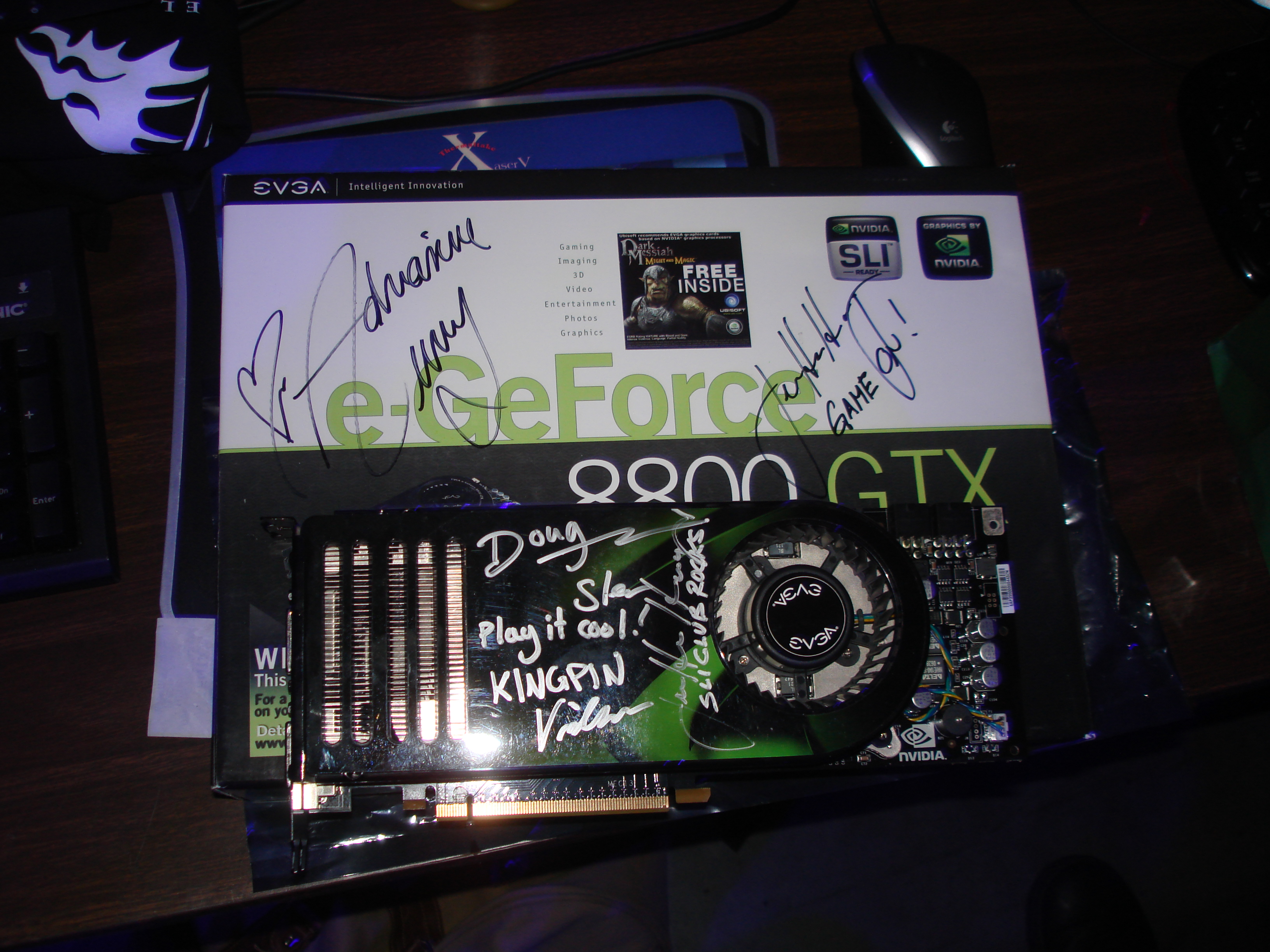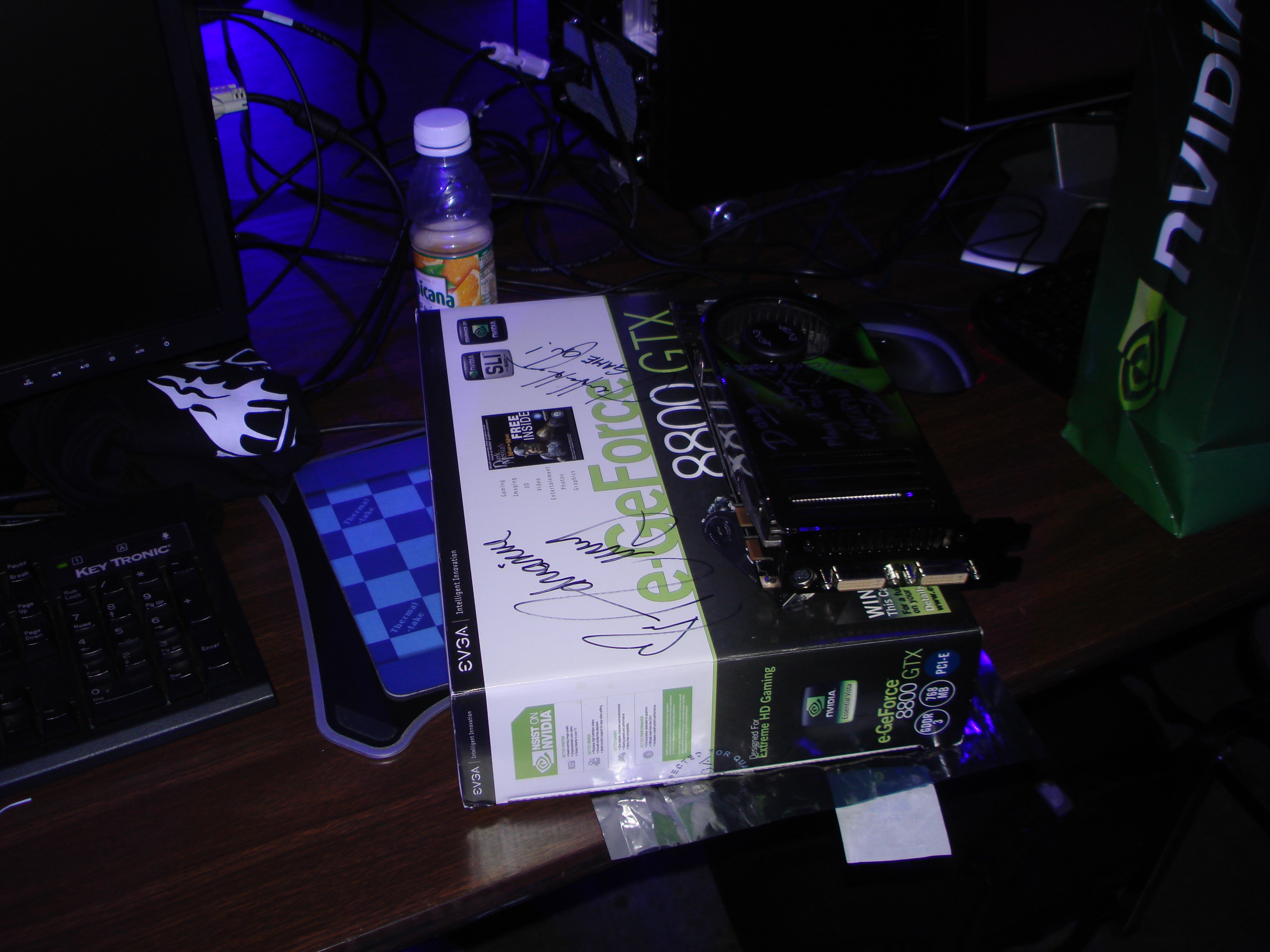 As you may remember from the GeForce 3 chapter, Quemine and his buddy Voodoo had gone out and bought EVGA brand GeForce 8800 cards the minute they were launched at GeForce 3. They brought them to the LAN and had the cards as well as the boxes autographed by Jen Hsun (the Nvidia CEO) and actress Adrianne Curry. EVGA who was a GeForce LAN sponsor caught wind of this, and shortly after the event posted up pictures of QueMine and Voodoo offering to give them a full refund in exchange for the autographed boxes (they would get to keep the cards, essentially making them free). Unfortunately, none of us saw this website until years later when a few months before Nvision one of us discovered it.