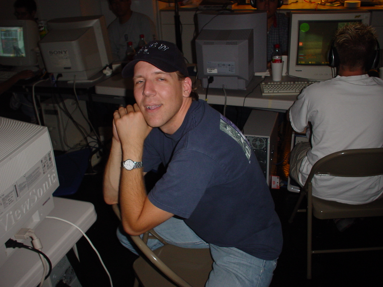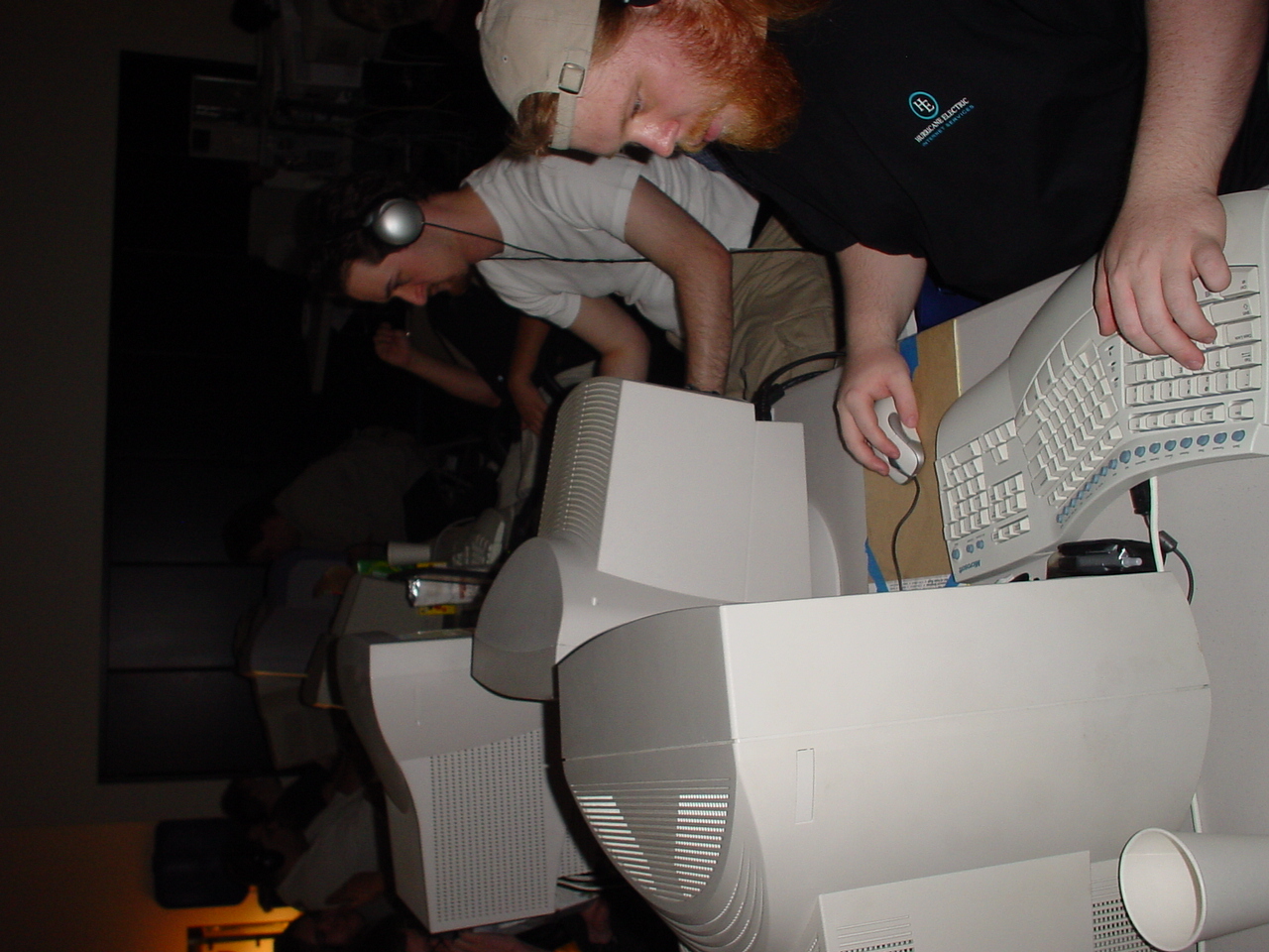As is the case with most LAN parties these days, CS and to a lesser degree Quake, were the predominant games throughout the party. I saw one game of tribes 2 and a few Warcraft 3 matches. At one point someone started up a Jedi Knight 2 server, which I promptly joined and began to OWN. Apparently the other players in the server were relatively new to the game. At one point I had a score of around 500 or so and the next highest player had around 100. It was great throwing those guys around for a while. At one point [WCE]Viper stands up and says "hey who's Warhawk?" After pointing myself out to him he says "Man! You're kicking butt!" It was great!