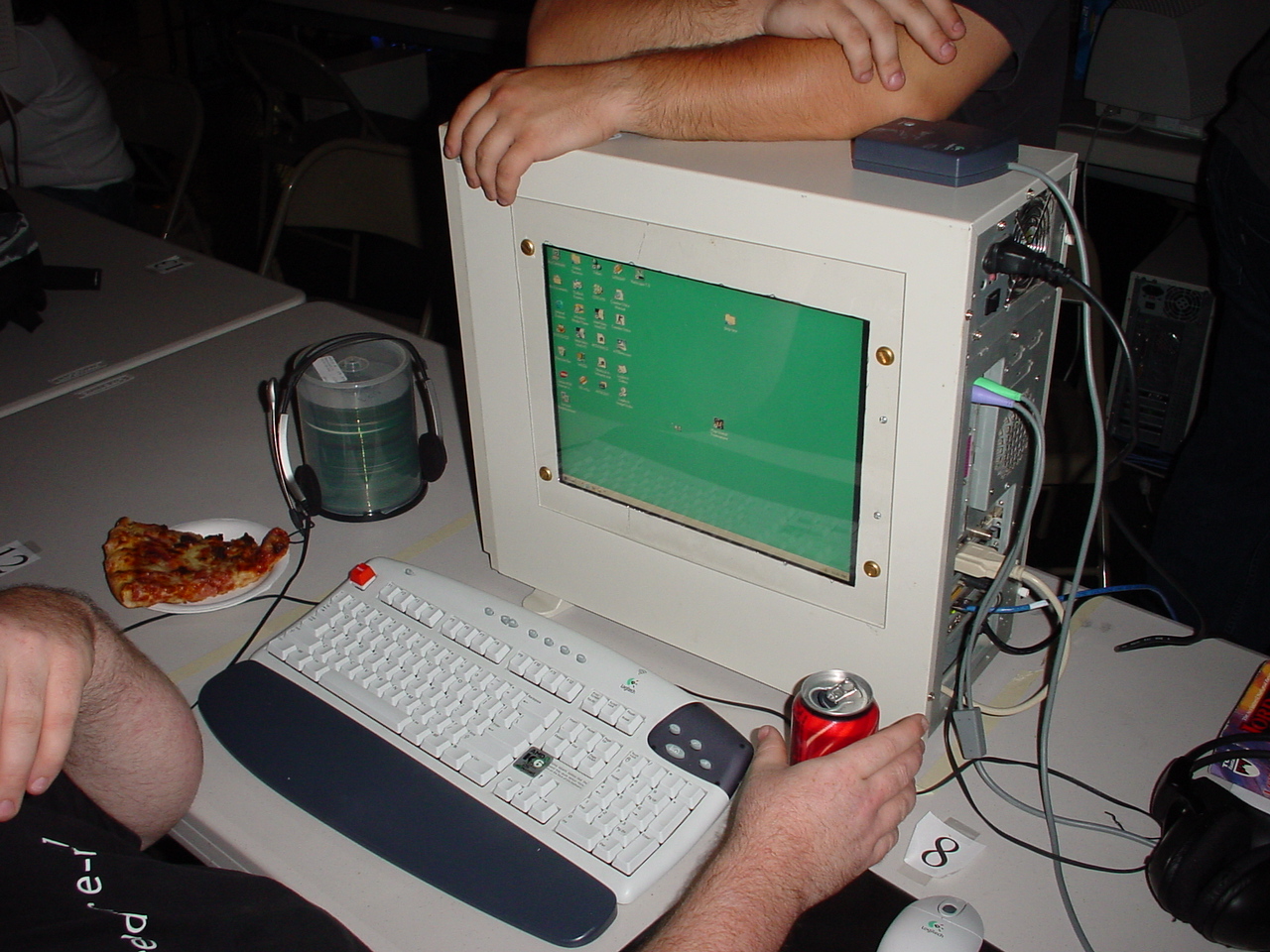 After a while fellow Mower, QueMine, showed up and set up his P4 and his Athlon XP rigs. We kicked some butt at Jedi 2 and CS together and QueMine showed off his sweet rigs to interested partiers who passed by. All were extremely impressed with the speeds he was able to get out of those machines. A bunch of people even asked him to OC /tweak their machines for them. A lot of people went a way from that party with faster machines because of him. QueMine is the tweaking master!