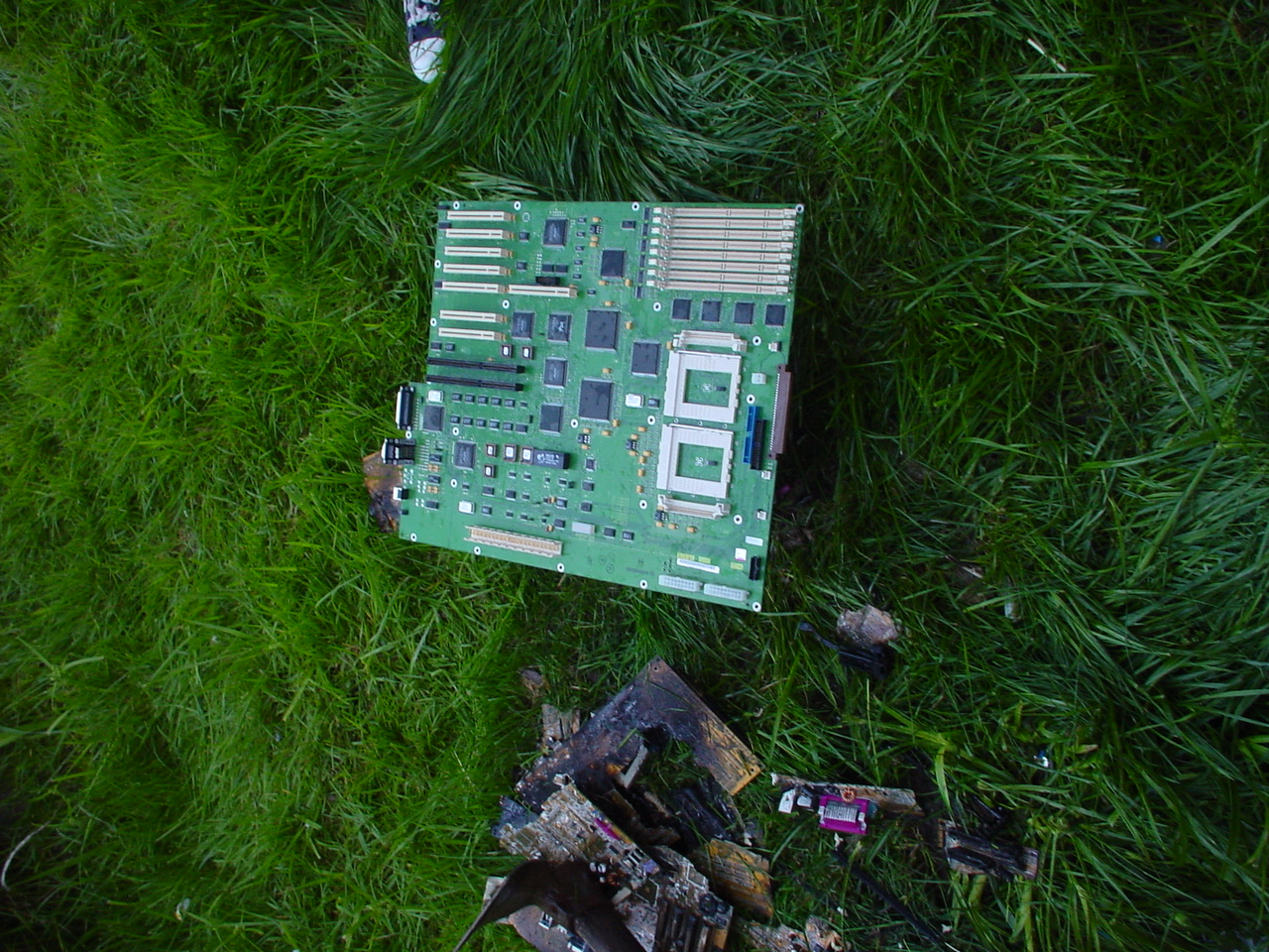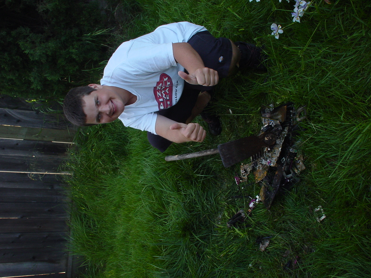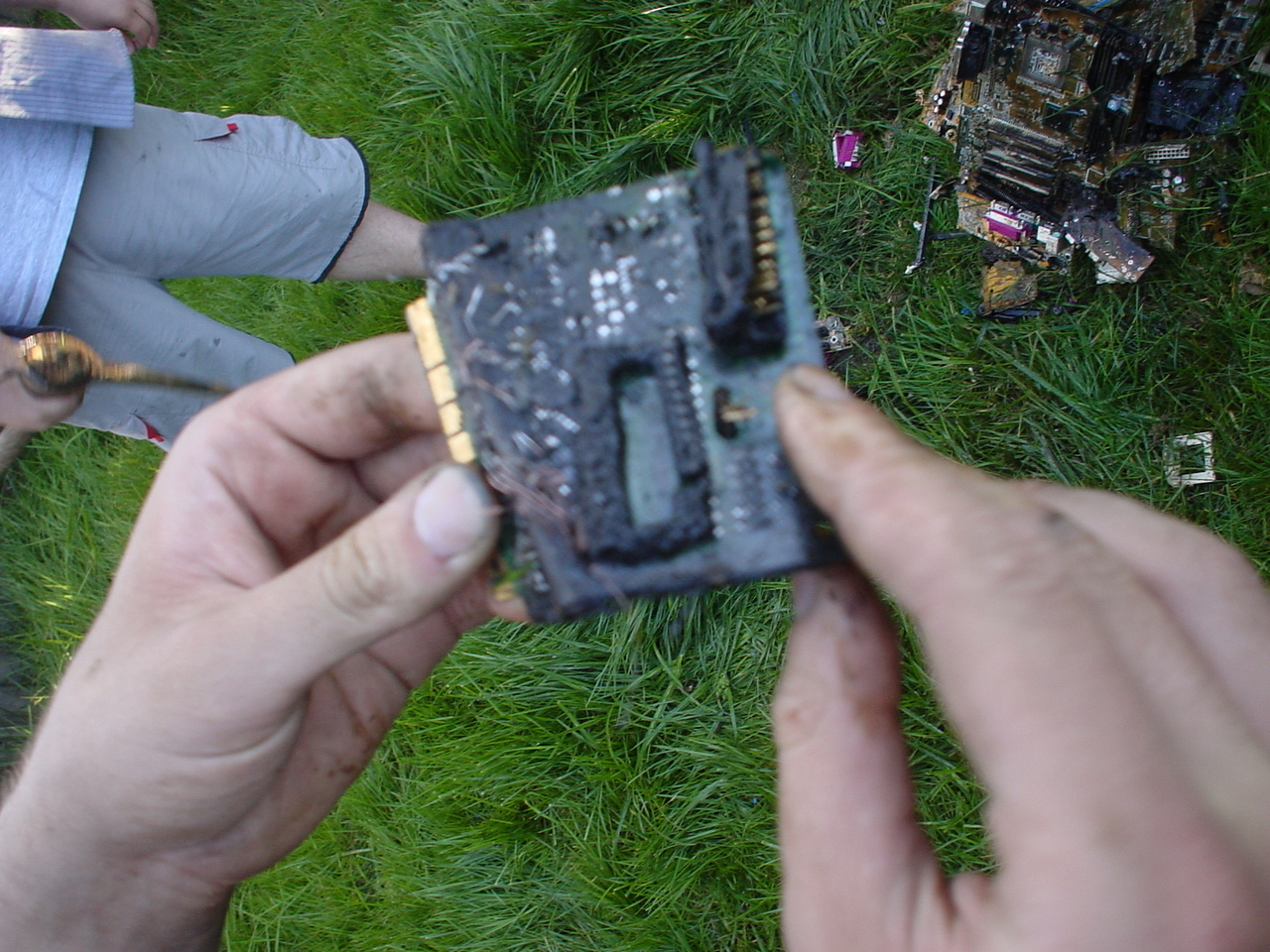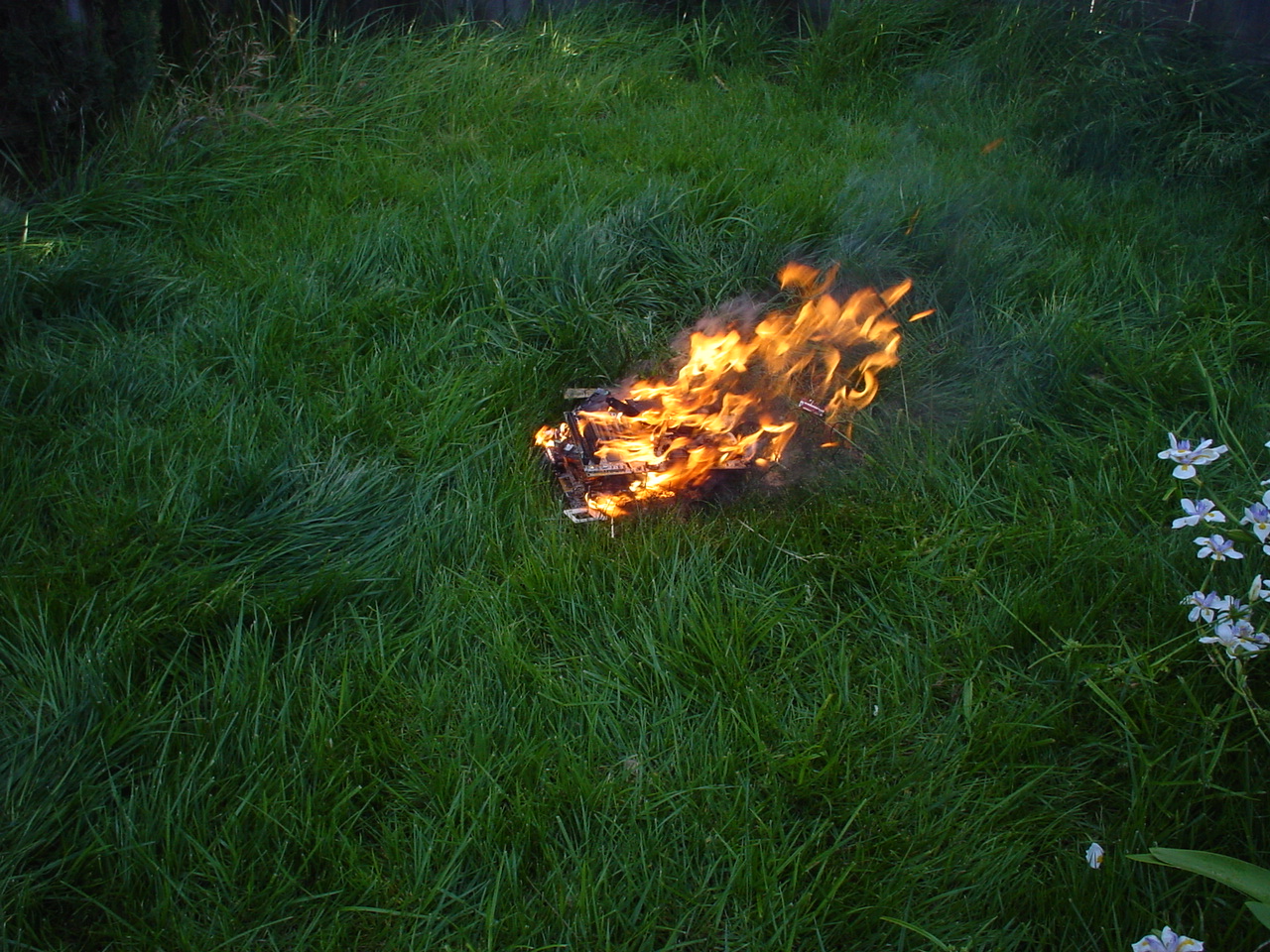 A cloud of noxious fumes rose from the burning mess, and Metalslug commented that he heard “chemical fires were really hard to put out.” Just about that time, the capacitors on the boards began to explode and pop, and for a few seconds, it was just like the 4th of July back home. While some of us retreated from the clouds of fumes, others poured water on the burning wreckage. After the fumes had blown away, and the fire was out, we all stood around the charred heap, feeling a huge sense of satisfaction and accomplishment. The fun didn’t stop there though. Mameman, as if by magic, conjured up a particularly huge and particularly ancient looking server board. We all examined it, and decided that it, in fact, must be burned as well. On went the gas, and up went the flames, as we once again reveled in the ecstasy of pure testosterone overload. Once that was over, we all took pictures of our achievements, and went back inside to play more games.