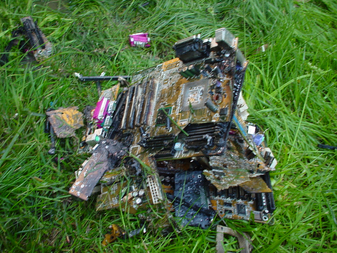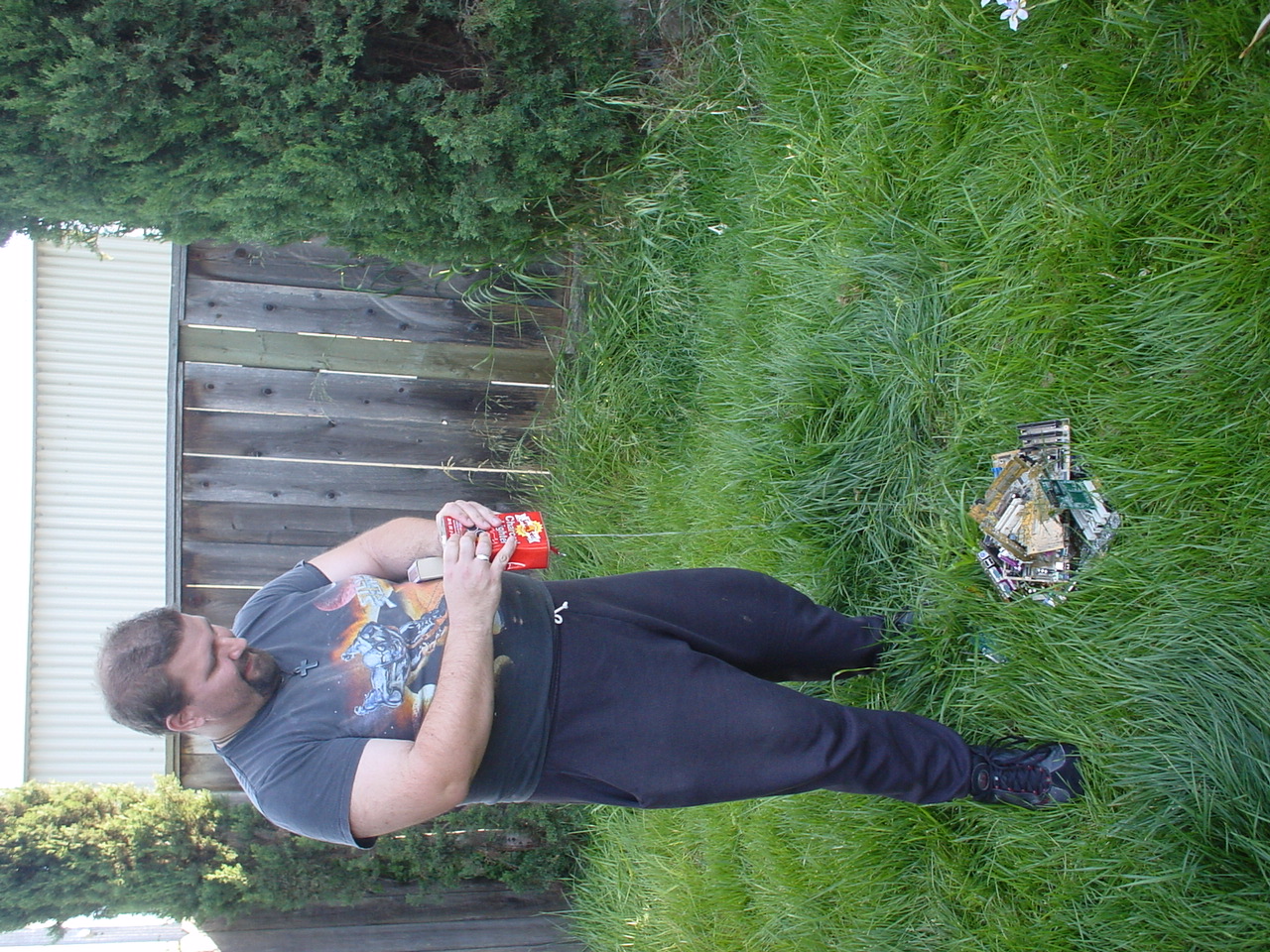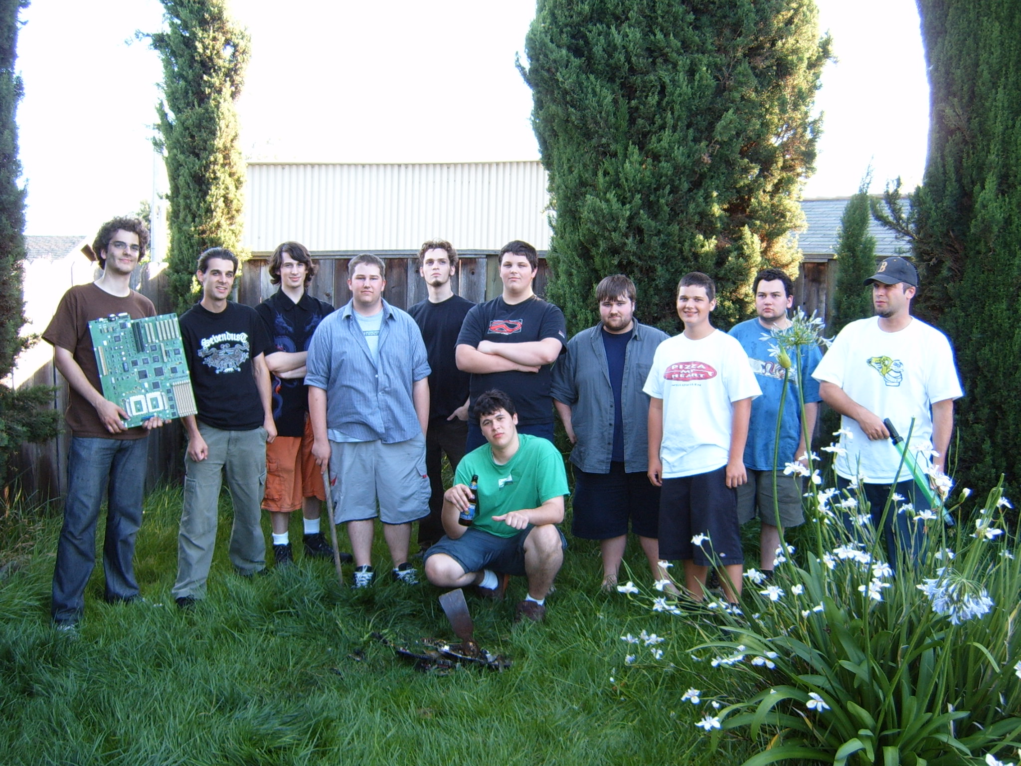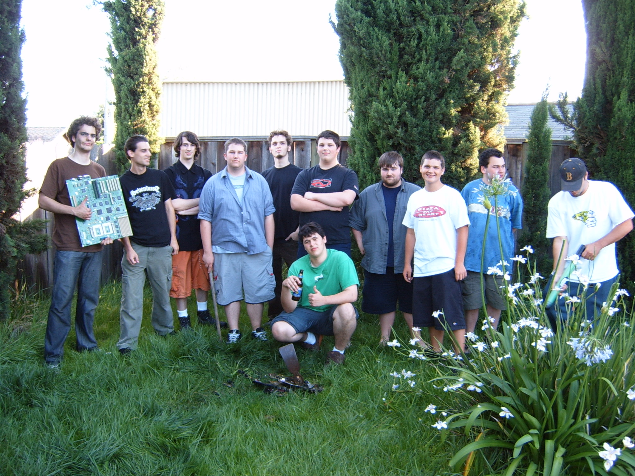 A cloud of noxious fumes rose from the burning mess, and Metalslug commented that he heard “chemical fires were really hard to put out.” Just about that time, the capacitors on the boards began to explode and pop, and for a few seconds, it was just like the 4th of July back home. While some of us retreated from the clouds of fumes, others poured water on the burning wreckage. After the fumes had blown away, and the fire was out, we all stood around the charred heap, feeling a huge sense of satisfaction and accomplishment. The fun didn’t stop there though. Mameman, as if by magic, conjured up a particularly huge and particularly ancient looking server board. We all examined it, and decided that it, in fact, must be burned as well. On went the gas, and up went the flames, as we once again reveled in the ecstasy of pure testosterone overload. Once that was over, we all took pictures of our achievements, and went back inside to play more games.