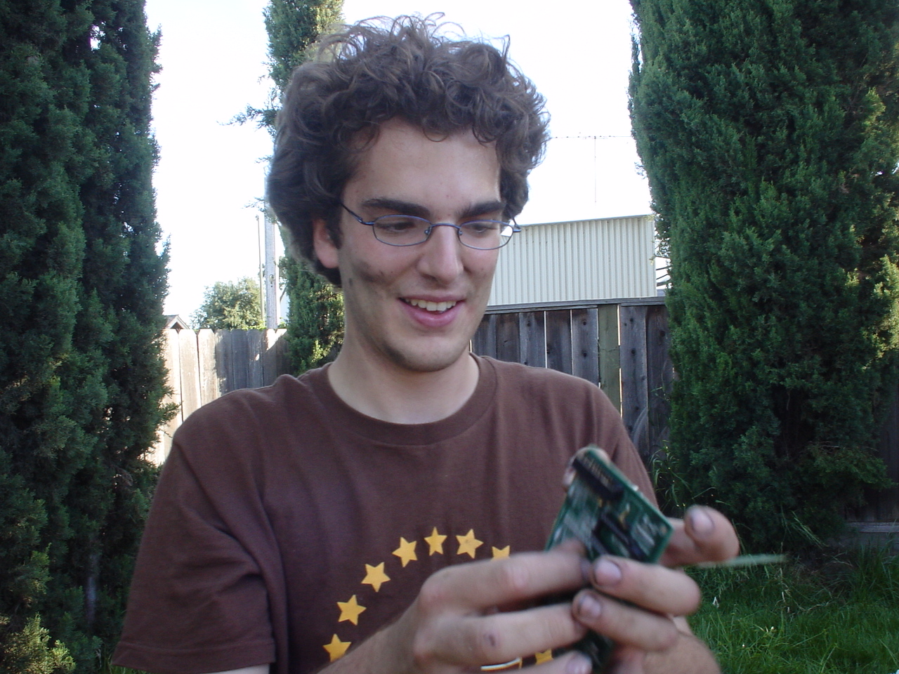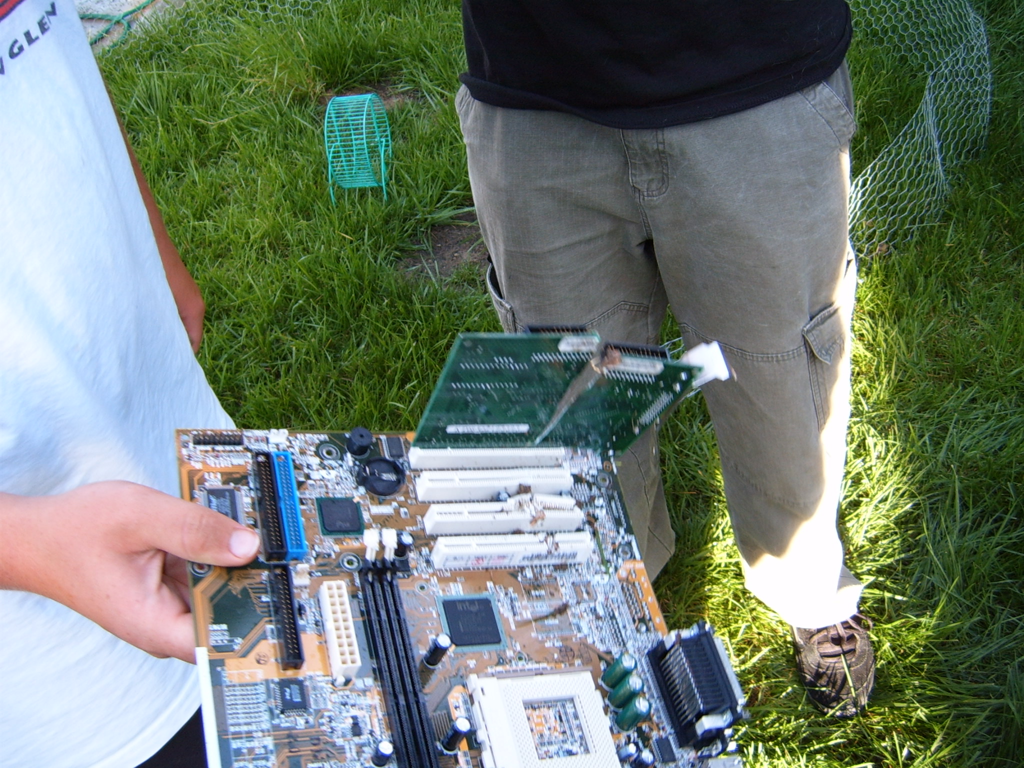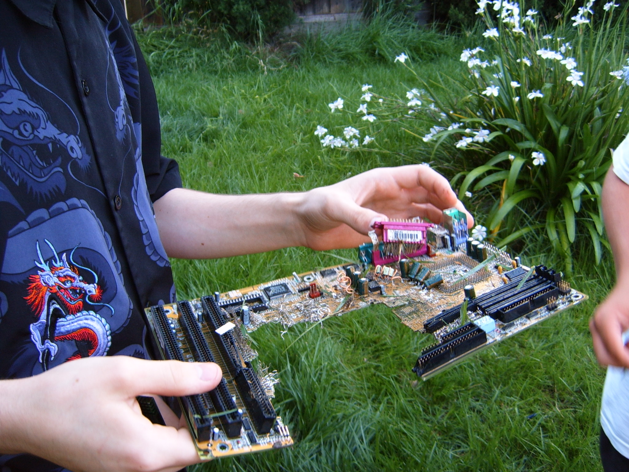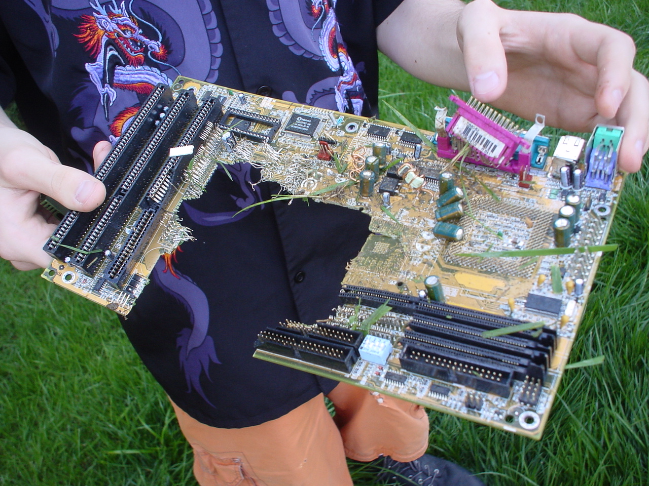 A cloud of noxious fumes rose from the burning mess, and Metalslug commented that he heard “chemical fires were really hard to put out.” Just about that time, the capacitors on the boards began to explode and pop, and for a few seconds, it was just like the 4th of July back home. While some of us retreated from the clouds of fumes, others poured water on the burning wreckage. After the fumes had blown away, and the fire was out, we all stood around the charred heap, feeling a huge sense of satisfaction and accomplishment. The fun didn’t stop there though. Mameman, as if by magic, conjured up a particularly huge and particularly ancient looking server board. We all examined it, and decided that it, in fact, must be burned as well. On went the gas, and up went the flames, as we once again reveled in the ecstasy of pure testosterone overload. Once that was over, we all took pictures of our achievements, and went back inside to play more games.