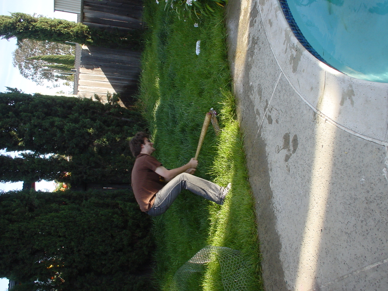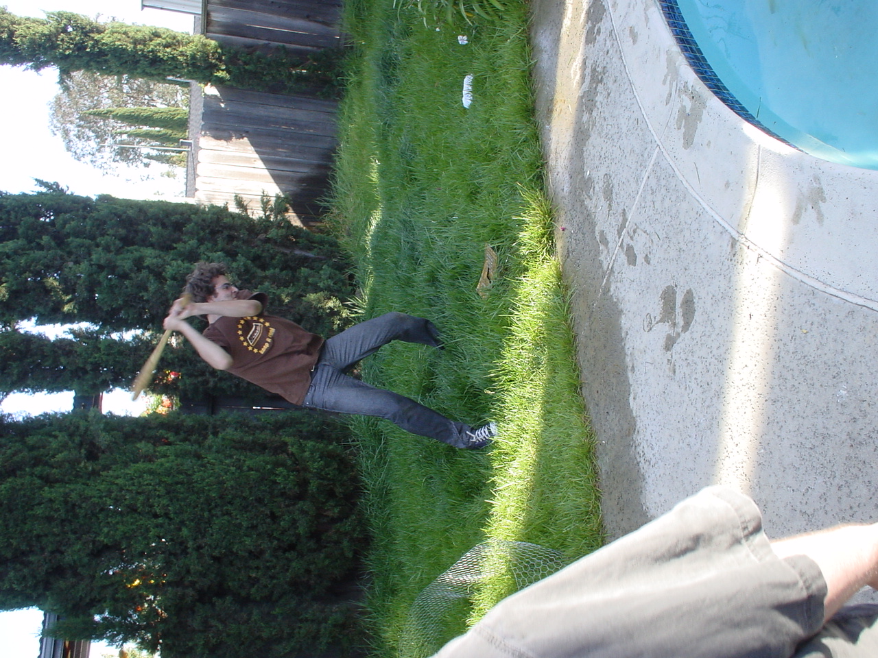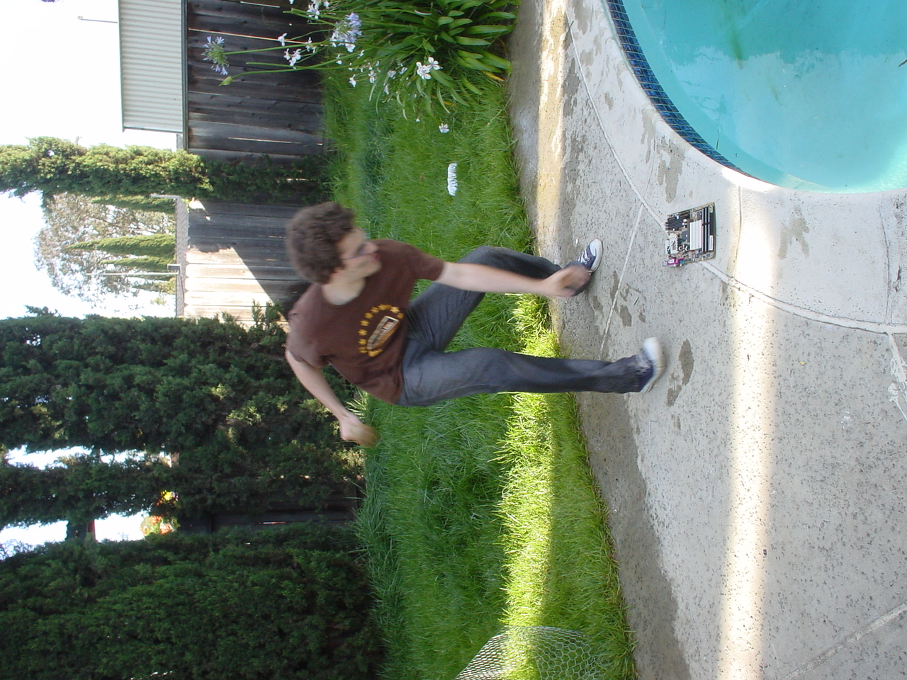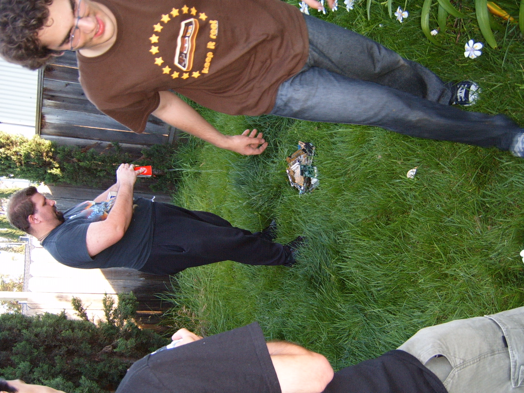 The prolonged periods of chilling and leisurely activities ended up having the effect of raising the testosterone levels at the party to dangerous levels. Kraz came in and promptly rushed out to the backyard, grabbed a baseball bat and went to town on the scrapped computer components sitting by the pool. It seemed that his broken car had driven him to insanity. As the Mariachi music played, he unleashed his fury, until there were several smashed motherboards at the bottom of the pool. At this point, the testosterone levels rose to an even higher critical level, and the rest of us were compelled to go outside and smash, destroy and burn. Several LANers joined in on the carnage, and soon there was nothing but a pile of un-recognizable computer parts in the middle of the backyard grass. We all stood around looking at this pile, at a loss as to what to do next, when someone shouted “hey, let’s burn it!!” This, of course, seemed like a splendid idea, so after an abortive attempt with lighter fluid, a big can of gasoline appeared. Soon, the entire pile was drenched in gasoline. Mameman dropped some matches on it, and up in flames it went! This wasn’t enough; of course, as Mameman felt the flames were not big enough. In a sheer stroke of genius, he poured gasoline directly on the open flame. Even all of us testosterone induced guys knew this was an extremely bad idea, but surprisingly, no one was killed/ and or hurt.