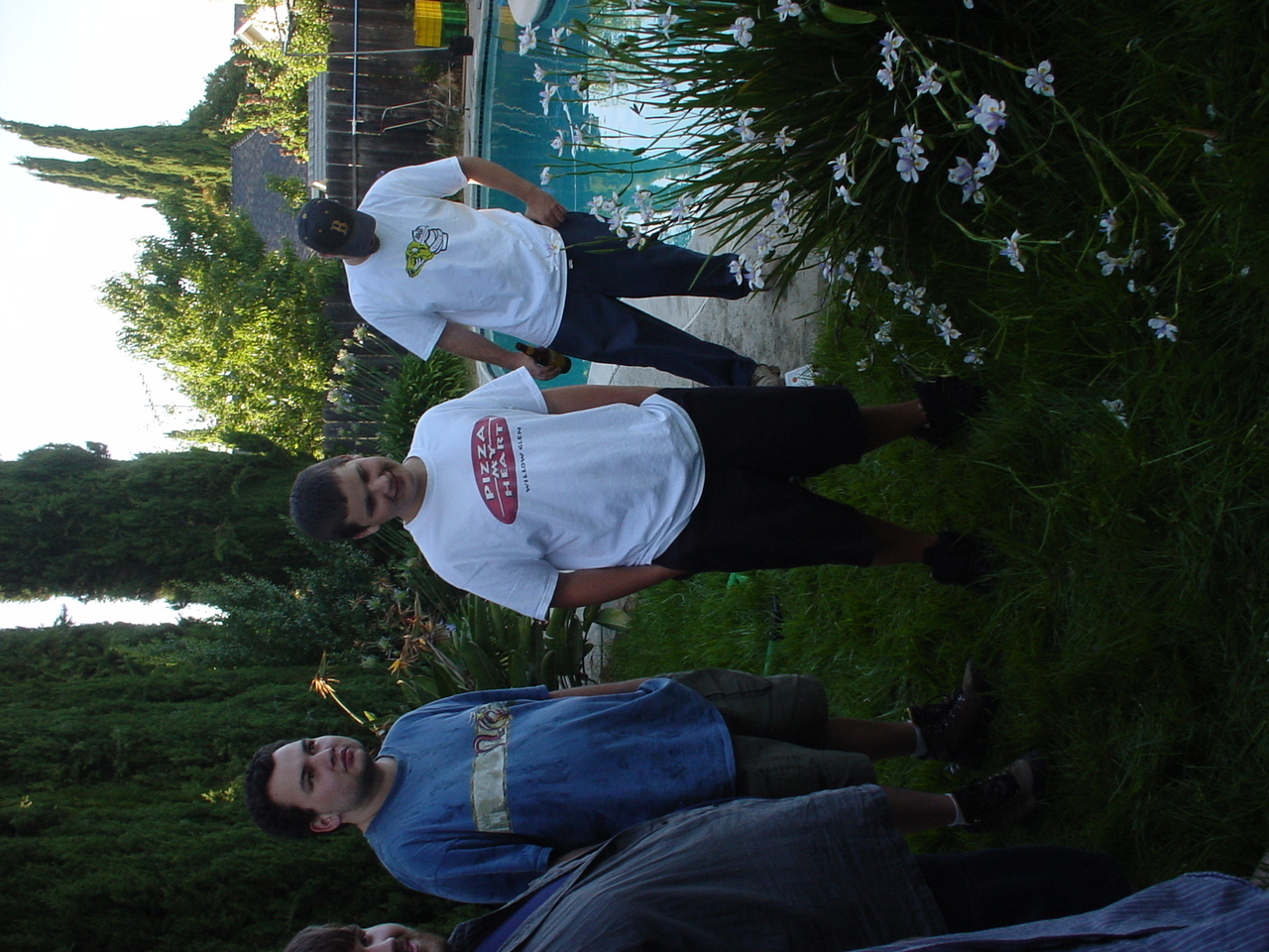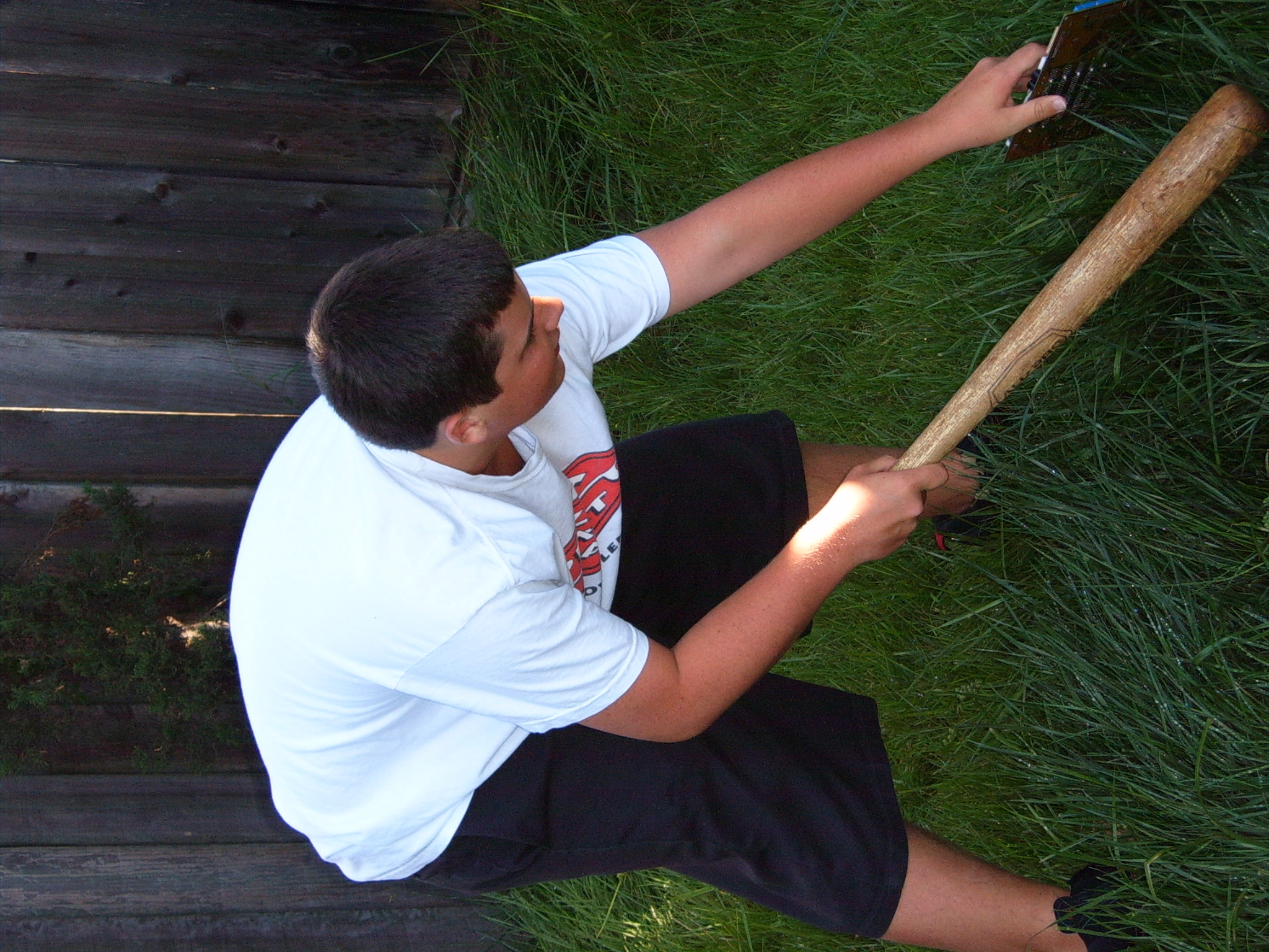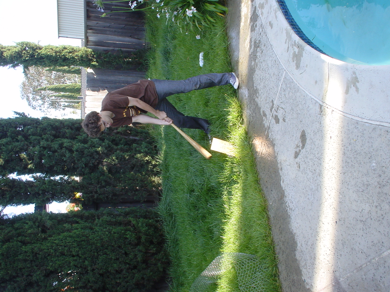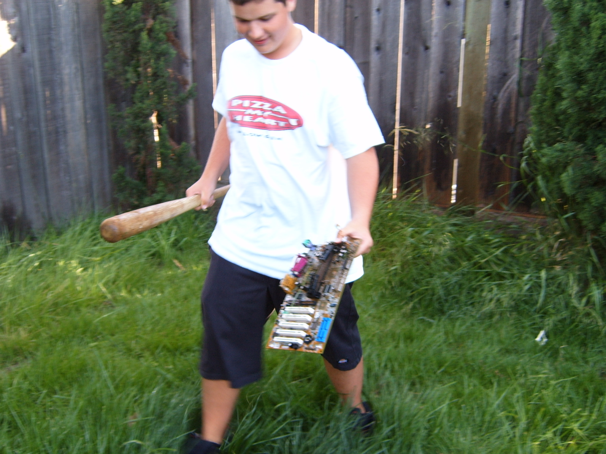 The prolonged periods of chilling and leisurely activities ended up having the effect of raising the testosterone levels at the party to dangerous levels. Kraz came in and promptly rushed out to the backyard, grabbed a baseball bat and went to town on the scrapped computer components sitting by the pool. It seemed that his broken car had driven him to insanity. As the Mariachi music played, he unleashed his fury, until there were several smashed motherboards at the bottom of the pool. At this point, the testosterone levels rose to an even higher critical level, and the rest of us were compelled to go outside and smash, destroy and burn. Several LANers joined in on the carnage, and soon there was nothing but a pile of un-recognizable computer parts in the middle of the backyard grass. We all stood around looking at this pile, at a loss as to what to do next, when someone shouted “hey, let’s burn it!!” This, of course, seemed like a splendid idea, so after an abortive attempt with lighter fluid, a big can of gasoline appeared. Soon, the entire pile was drenched in gasoline. Mameman dropped some matches on it, and up in flames it went! This wasn’t enough; of course, as Mameman felt the flames were not big enough. In a sheer stroke of genius, he poured gasoline directly on the open flame. Even all of us testosterone induced guys knew this was an extremely bad idea, but surprisingly, no one was killed/ and or hurt.