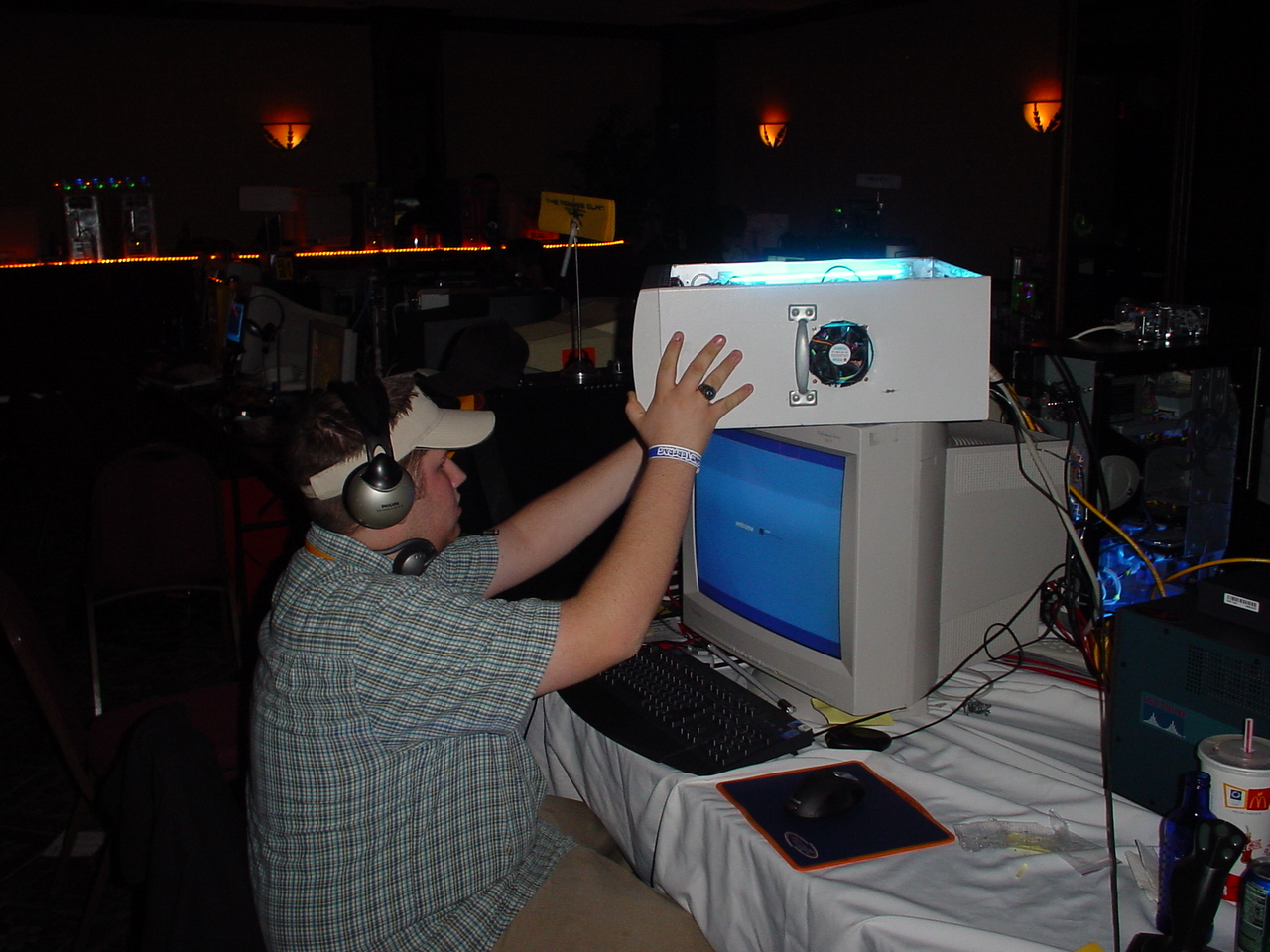 First off, the TMC2 team went up against one of Palmas two teams and was mercilessly slaughtered. TMC1 fared much better, consisting of Active Monkey, Beebo, Demise and two temporary players aFTERMATH and Metalslug. TMC1 showed good team communication and organization, which helped them to advance to the finals where they faced Palmas other team. The first round of the finals was pretty close, but Palma ended up taking the win. It wasn’t over yet, and as the second round was ready to get underway, Activemonkey decided it would be an excellent time to change out his hard drive cooling fan. Needless to say, this threw a “monkey” wrench into things as the fan didn’t fit correctly and he was forced to play with his rig on top of his monitor (see pic). This in itself wouldn’t have been too much of a problem, but it appeared that the team concentration, communication and coordination wasn’t quite there this time, and TMC1 ended up losing the finals. Even so, TMC1 did a superb job in getting the silver, especially considering they had never practiced together with that particular team lineup. Now that we know what to expect, we will be prepared for the next time!