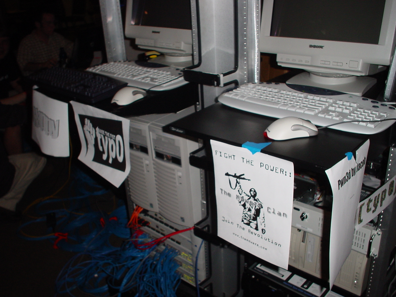 TMC had a friendly rivalry going on with another group that called themselved typ0. There were three guys that were regulars at Octane LAN and who also hosted house LANs that TMC members and Octane staff would attend. At this Octane I had used photoshop to make a small one page poster advertizing TMC. I did it in a military propagand poster style, as it matched well with the military stule shooter games we were all playing. At one point I sneakily put up a few of my posters around the LAN, and the typ0 guys saw this and quickly whipped up their own propaganda and posted it along side ours.