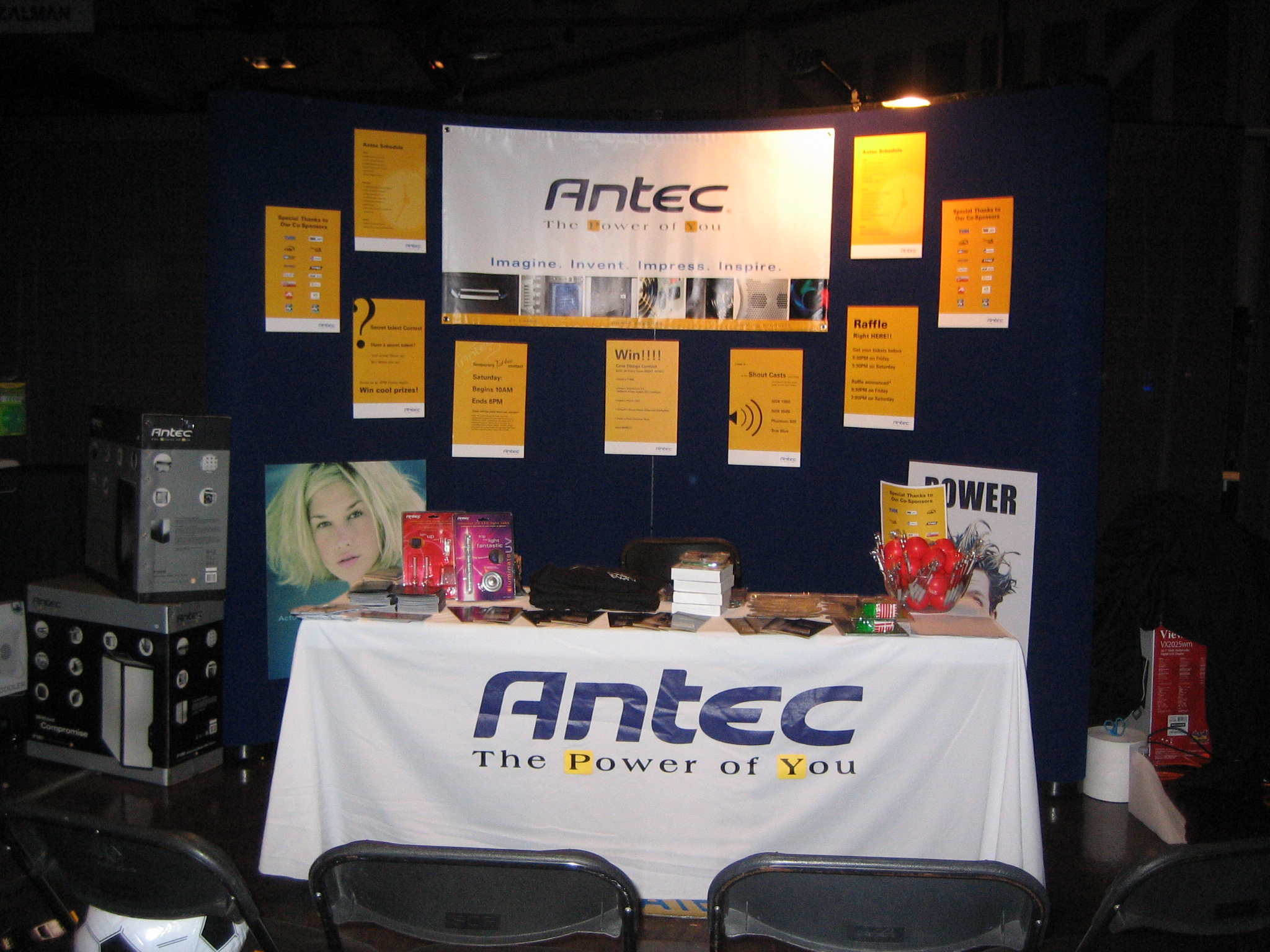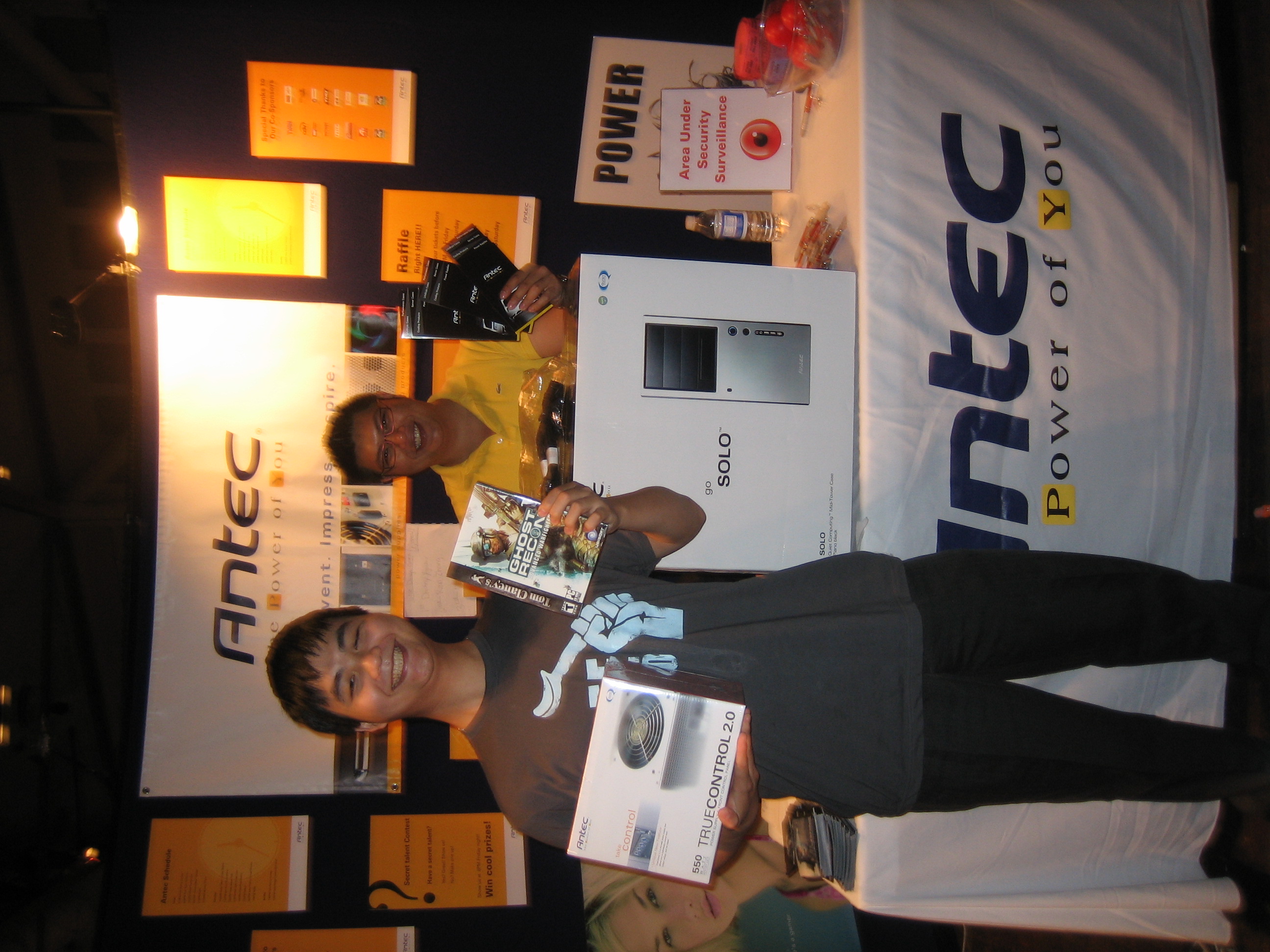 Not only did Antec have one of the largest booths at the event, but Antec products were also present in many other booths at the event. The reason for this was that we made sure to create partnerships with the other companies we knew were going to be at the show. We made agreements with them beforehand to trade products with them. This meant that not only did we get to use and give away products from our partners, but it also meant that nearly every raffle and competition at the LAN featured an Antec prize. This proved to be an excellent way to have our name constantly mentioned in other booths as well as over the PA system when prizes were announced.