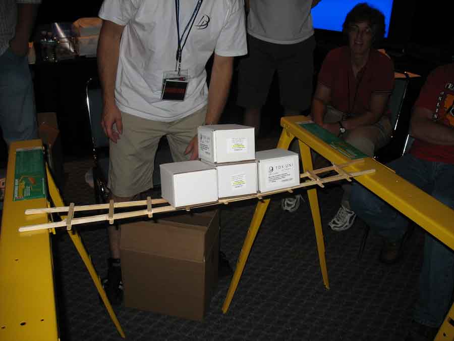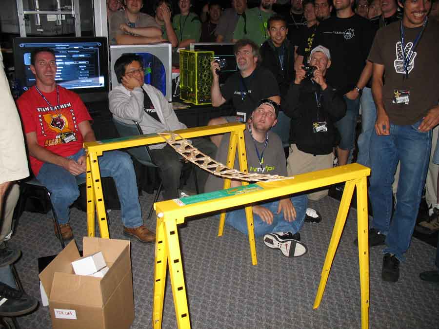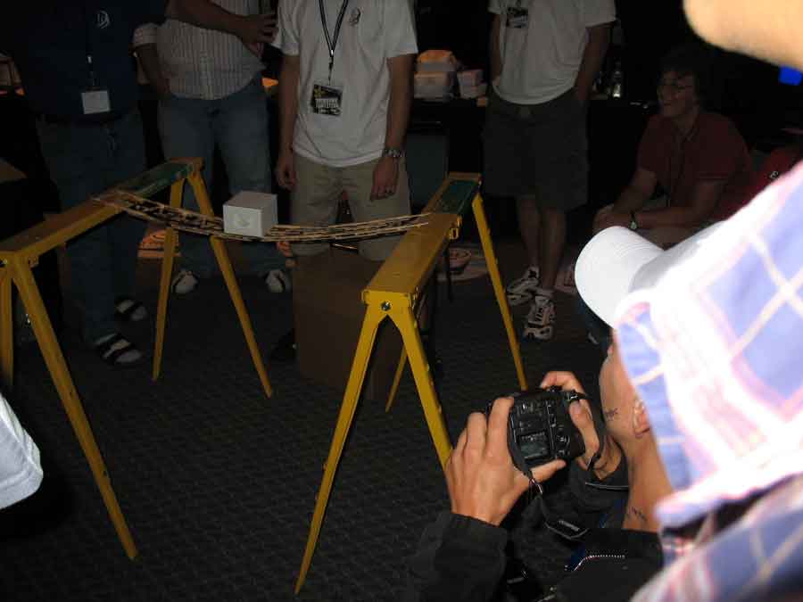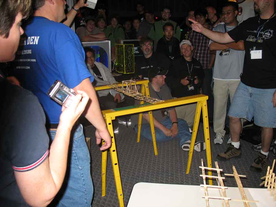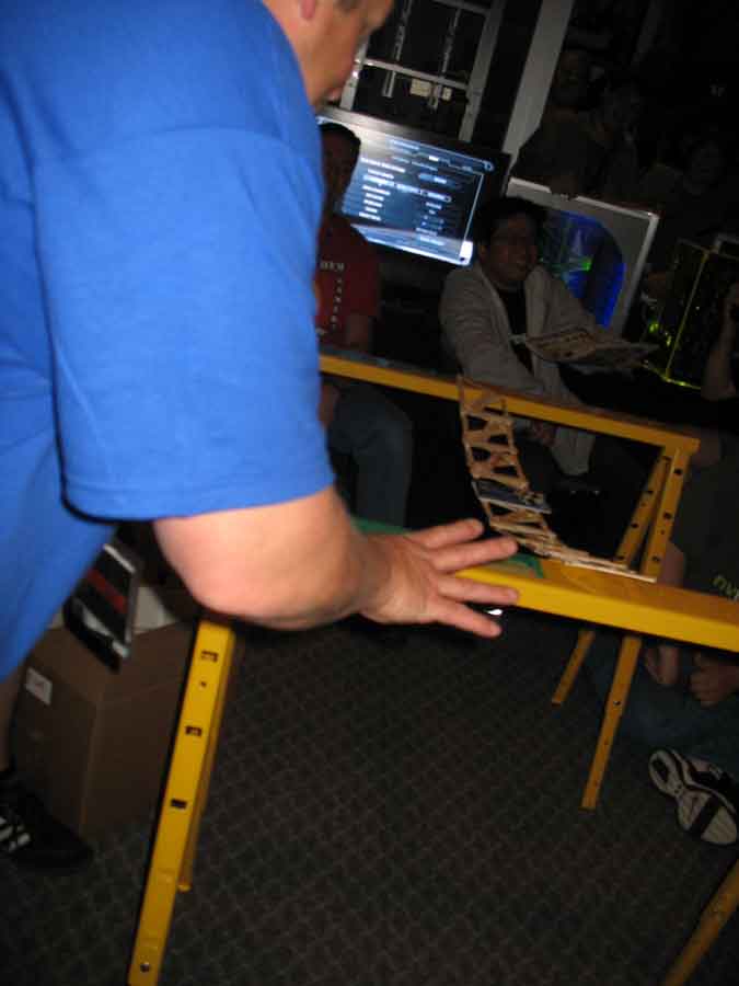 Back at the BYOC I took some pictures of the booths and sat in on the "Supreme CommanderJ" presentations, while Evilkickass won a 7950 GX2 for filling out an Nvidia survey. Dima and KraZ broke out the Dremels for some popcicle bridge pwnage. All their work payed off in the end with them winning a t-shirt. At least Dima won a 1st place at a Paperairplane contest and won an Antec case.