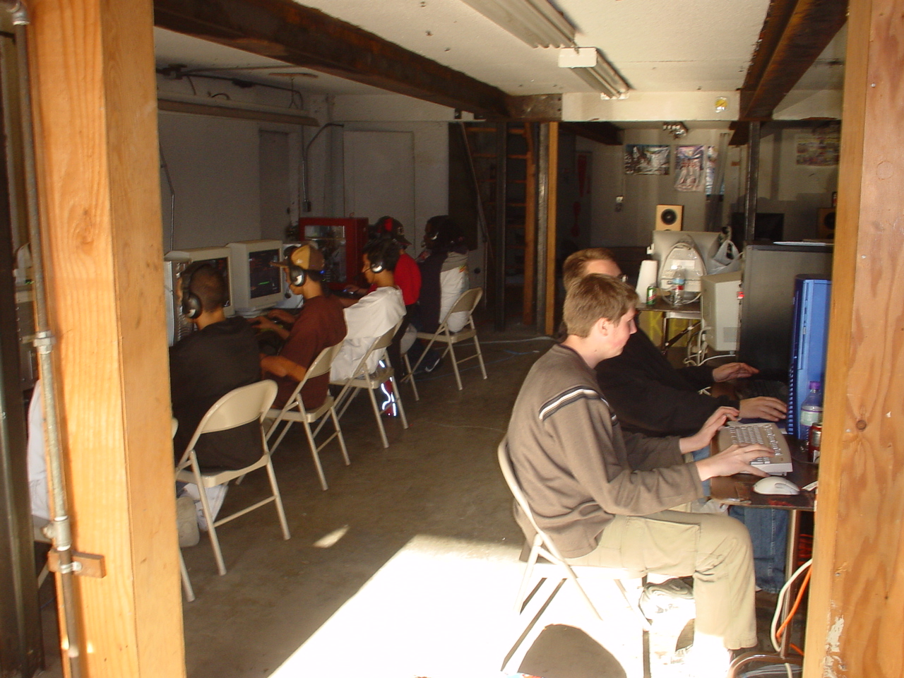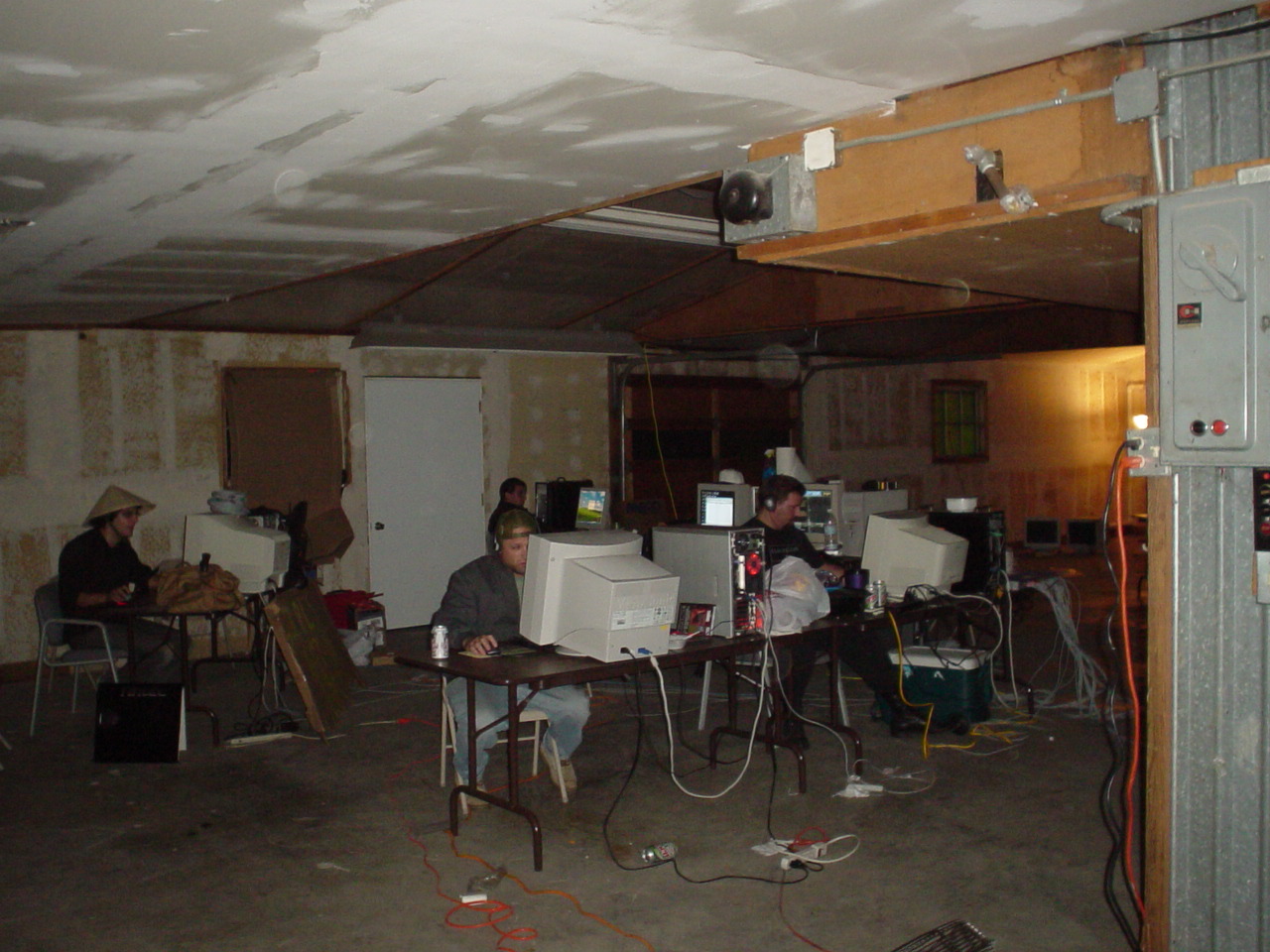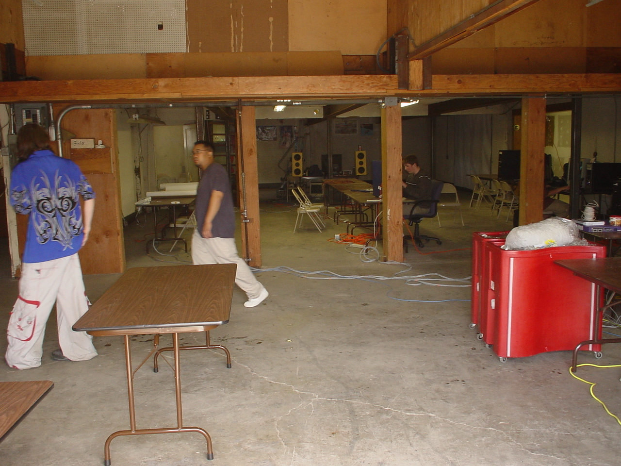 In September 2004, Demise was working for a LAN center in Hayward called Reboot. Demise approached me with an opportunity for TMC to co-host a LAN event with Reboot. It turns out the guy that owned the Reboot center (his name was Mel), had access to another space in Hayward. This new space turned out to be very strange, it was a duplex house with Mel living on one side and his landlords living on the other. Attached to the back of the duplex was some sort of industrial workshop space; I was told it used to be a print shop. The whole place felt like a large garage or warehouse. There was also an upstairs loft area with a few strangely shaped rooms.
