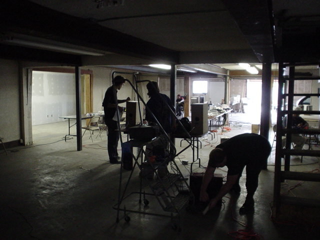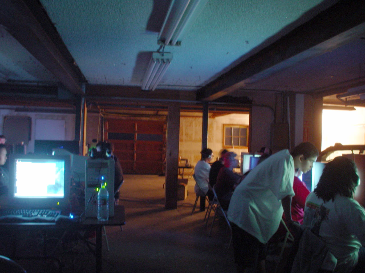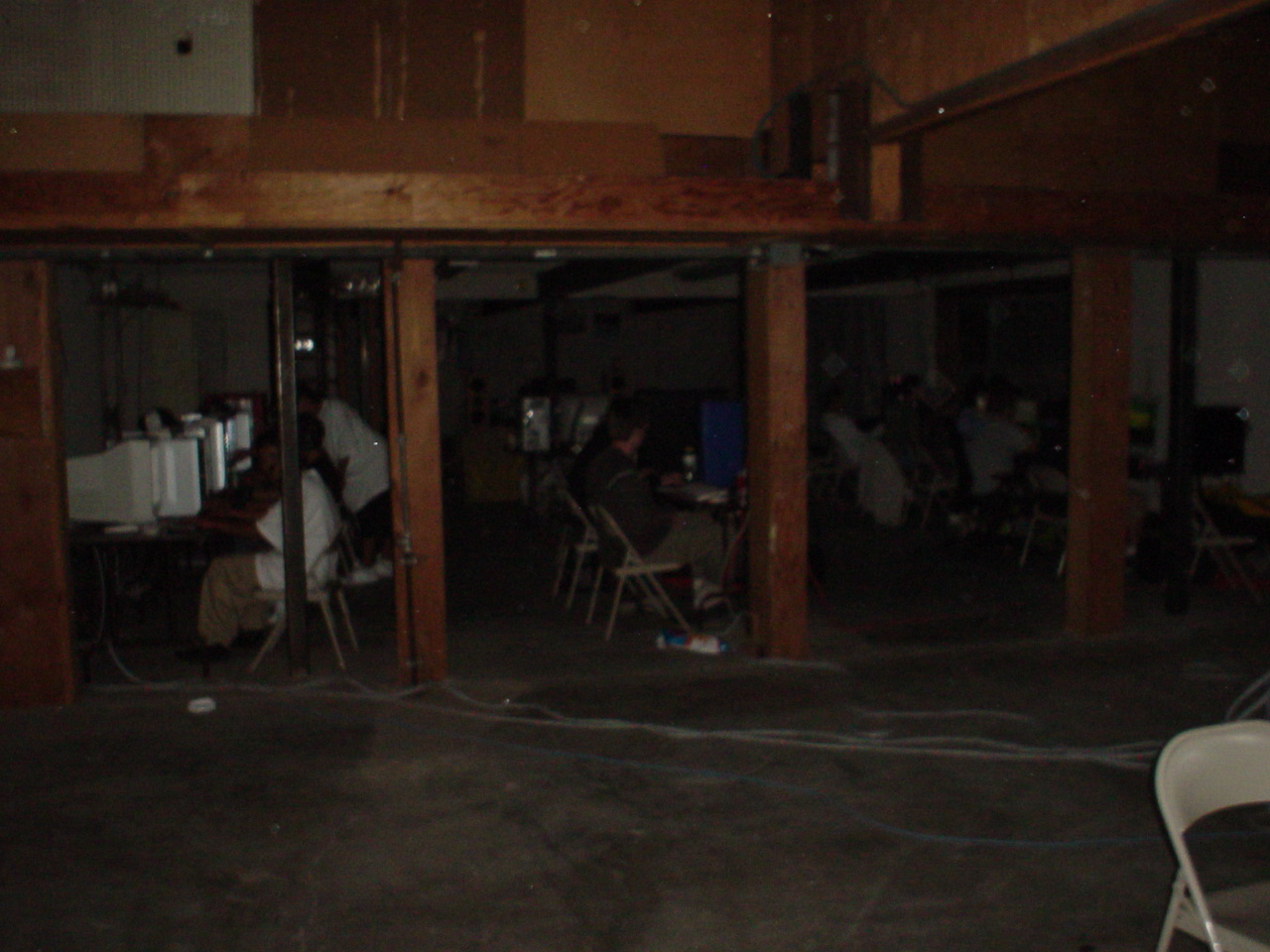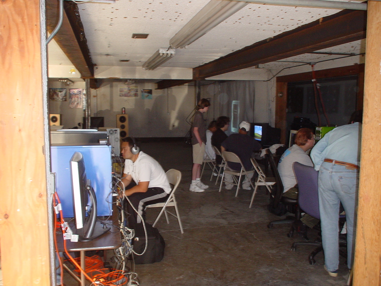 In September 2004, Demise was working for a LAN center in Hayward called Reboot. Demise approached me with an opportunity for TMC to co-host a LAN event with Reboot. It turns out the guy that owned the Reboot center (his name was Mel), had access to another space in Hayward. This new space turned out to be very strange, it was a duplex house with Mel living on one side and his landlords living on the other. Attached to the back of the duplex was some sort of industrial workshop space; I was told it used to be a print shop. The whole place felt like a large garage or warehouse. There was also an upstairs loft area with a few strangely shaped rooms.