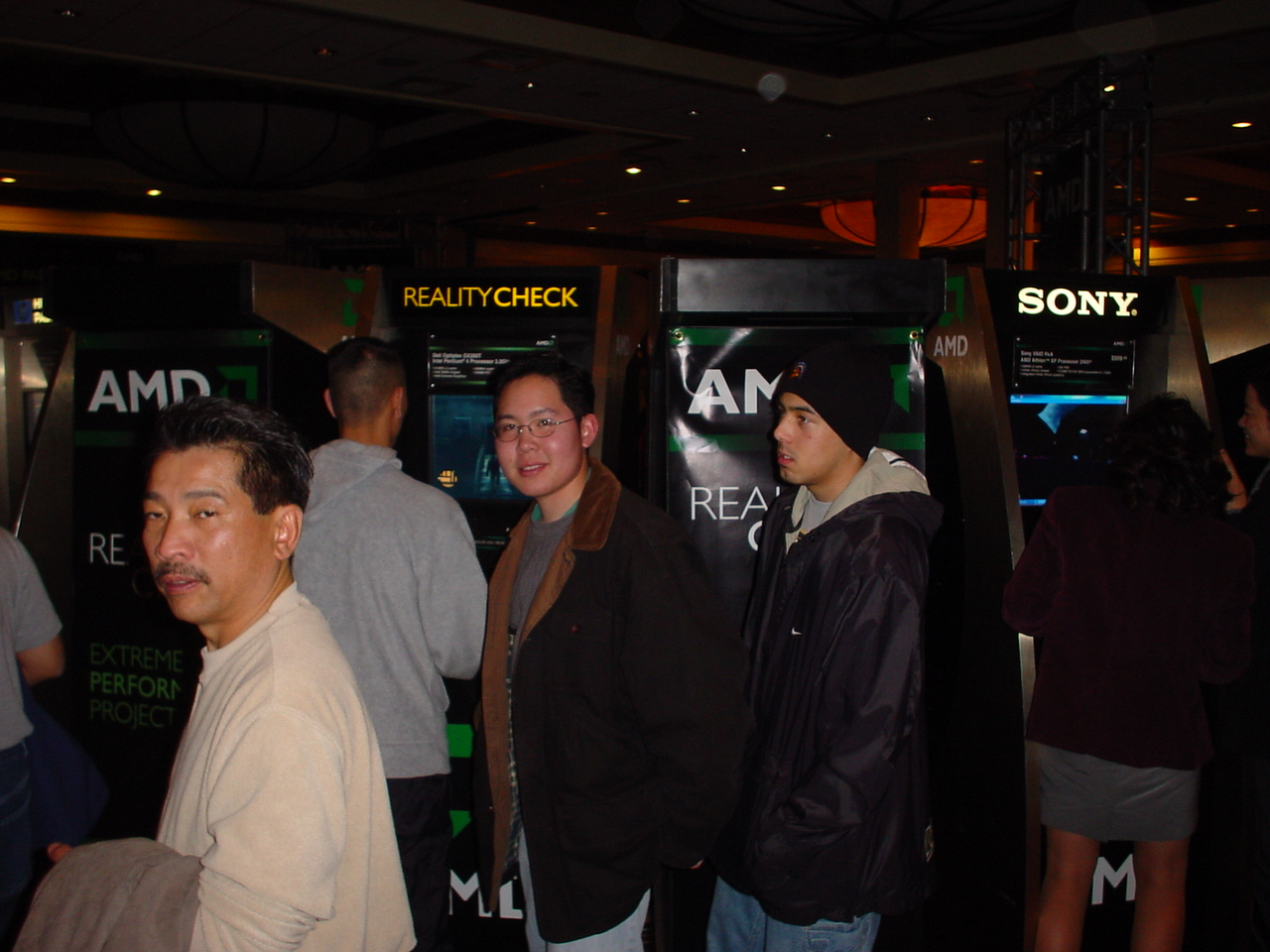 In one corner an AMD representative was describing the thermal characteristics of the AMD processor. His explanation was very basic and we quickly decided we could easily get more info on this from Tom's Hardware Guide or [H]ard OCP. We moved on to the kiosks where the gaming systems were set up. Each kiosk featured a game like UT 2k3 or Jedi Knight 2 on either an AMD or an Intel based system. All the AMD systems were running on the Nvidia Nforce motherboards (with built in GeForce 2 MX graphics cards), while the Intel based systems were running on Intel boards with built in Intel graphics. Needless to say Intel's built in graphics are extremely inferior to any GeForce based graphic solution (even an MX). Un-surprisingly the P4 was very choppy when running graphic intensive games. There was an AMD representative standing nearby the kiosks whose job it was to say, "See! Look at how slow Pentium 4s are compared to AMD processors!" Most of the people that saw this seemed impressed, and nodded in approval as if to say, "if only my Intel buying friends could see THIS!" I then came to the conclusion that most of the people there were either totally ignorant, or where there to brown-nose with the AMD people. It doesn't take a rocket scientist to figure out that this was an unfair comparison of processors. This comparison was really only useful for comparing the graphics solution and not the performance of the processor. After seeing this we knew we were in for one big giant AMD propaganda fest. Once we found out we were being intentionally deceived and weren't even going to be seeing any demos of upcoming technology; our focus quickly shifted to finding as much free stuff as possible.