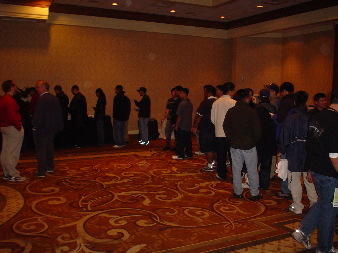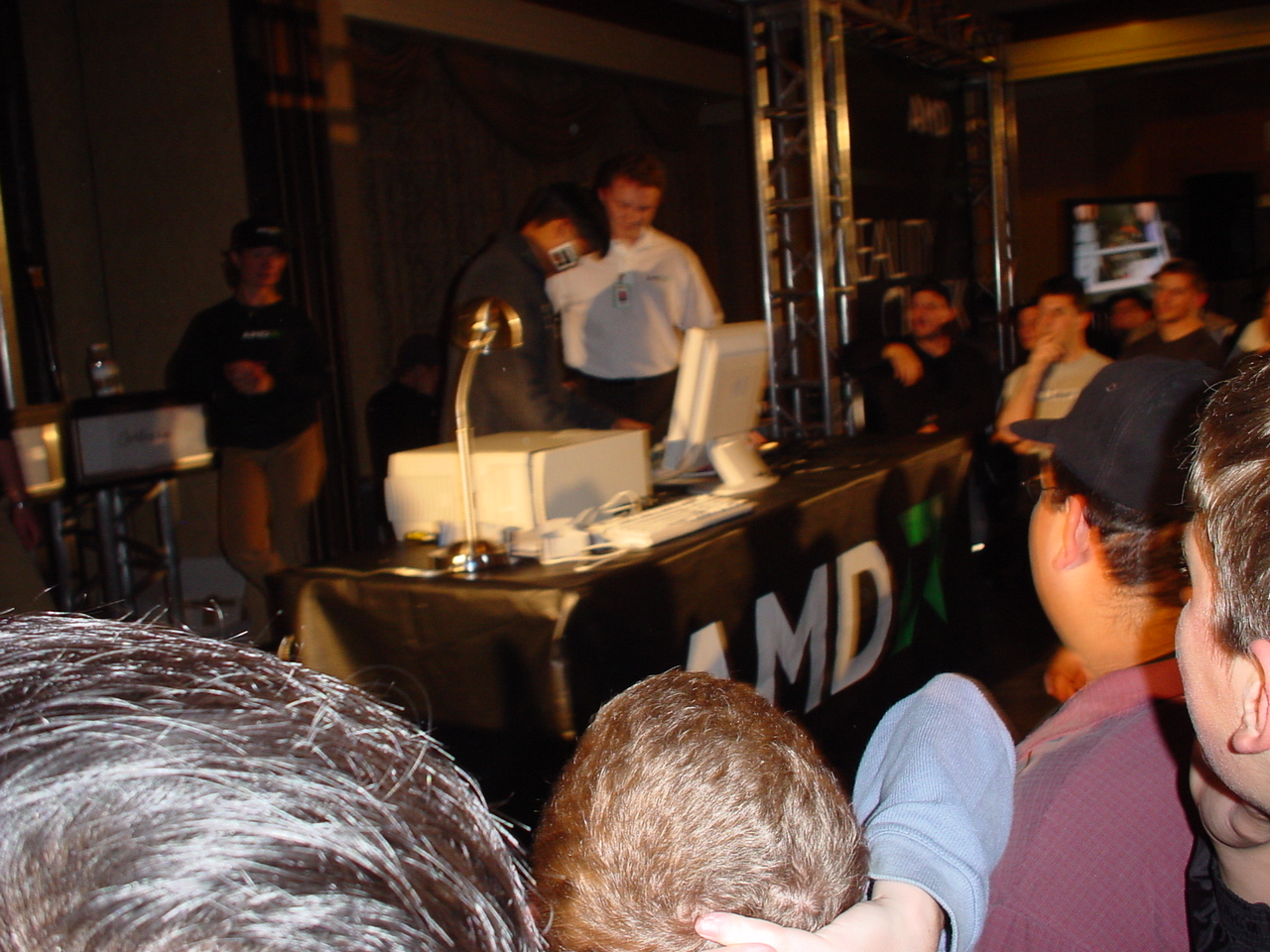 Jen went to work obtaining an AMD shoulder bag, and some of us grabbed some snacks off the food table before the non-VIP mobs were let in. QueMine was able to tweak the P4 so that it was playable on UT 2k3 and then proceeded to kick everyone else's butt.