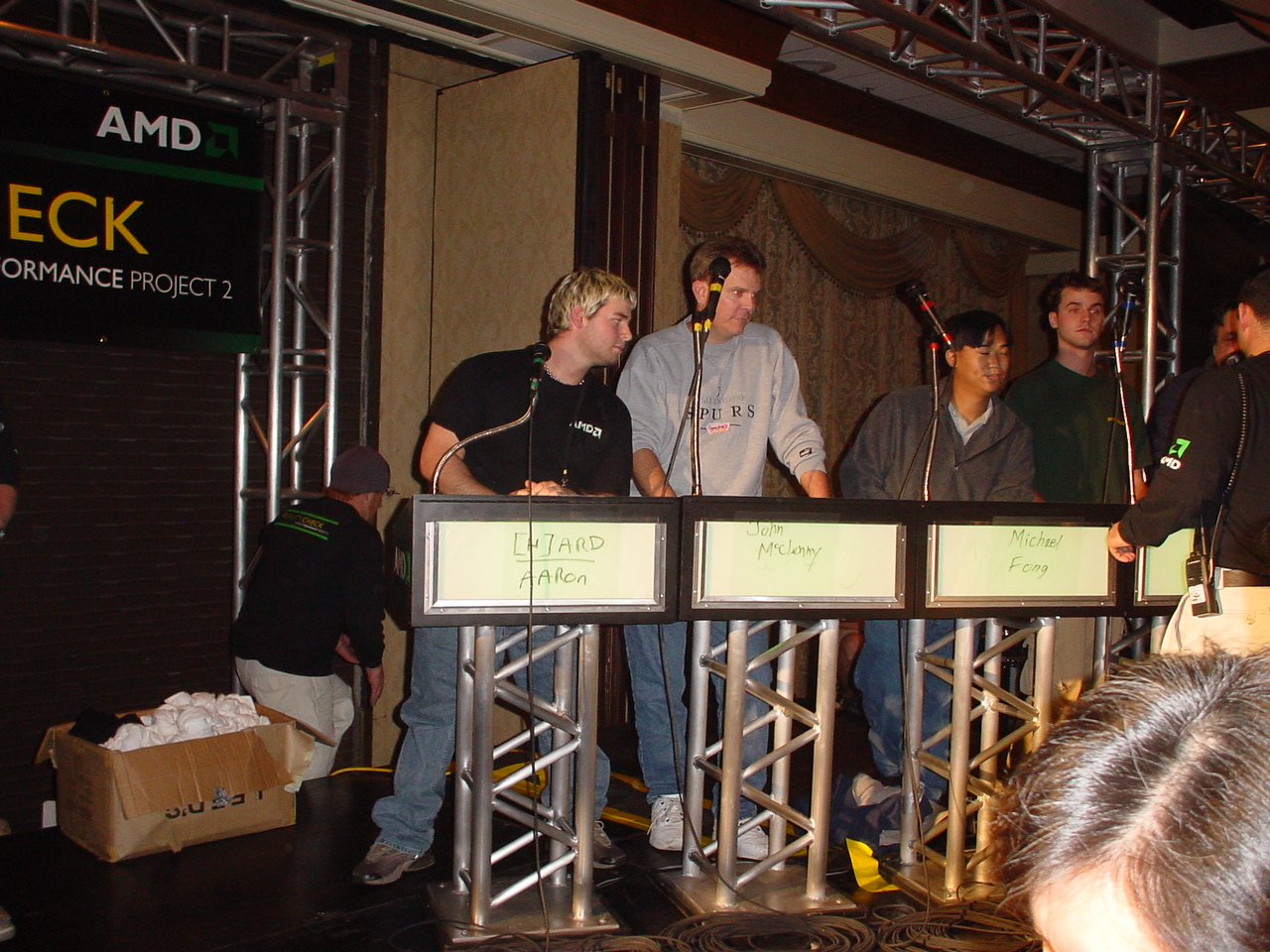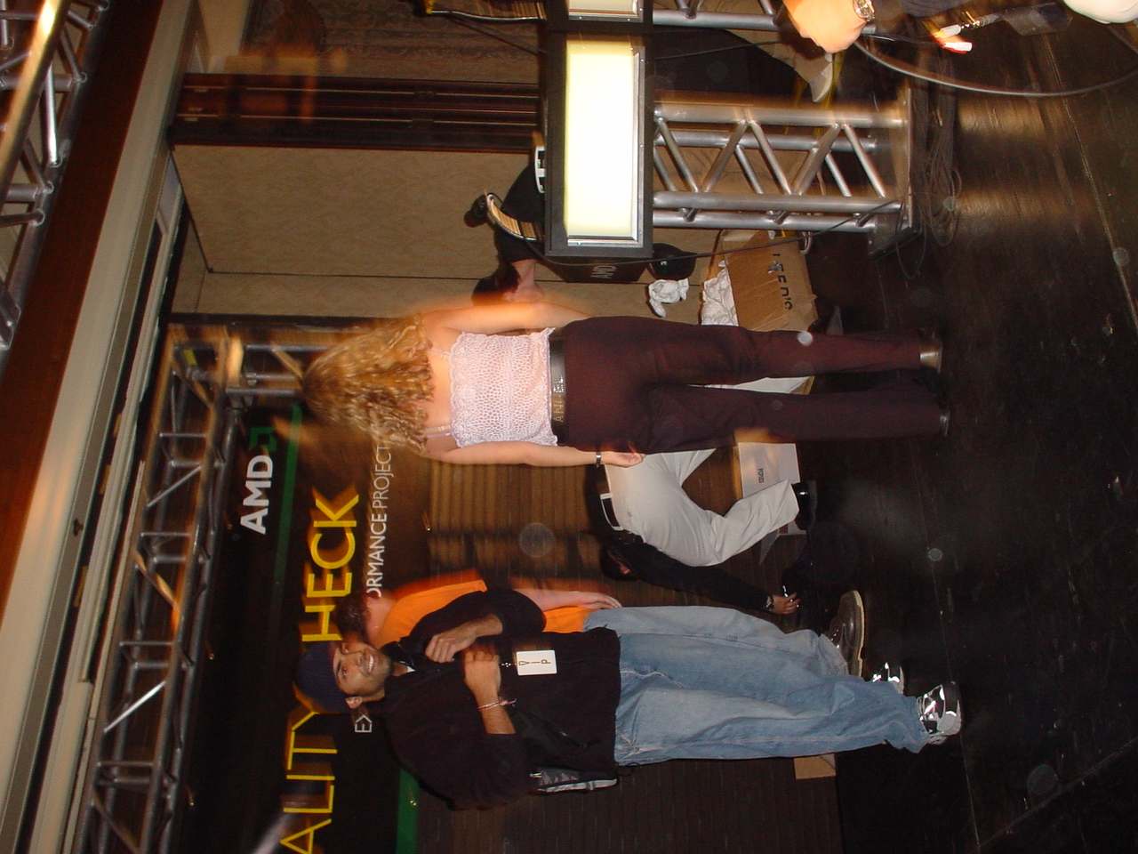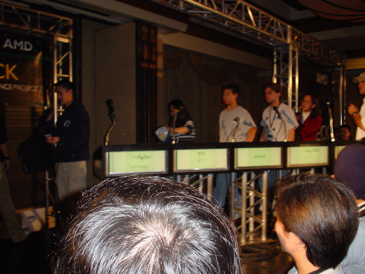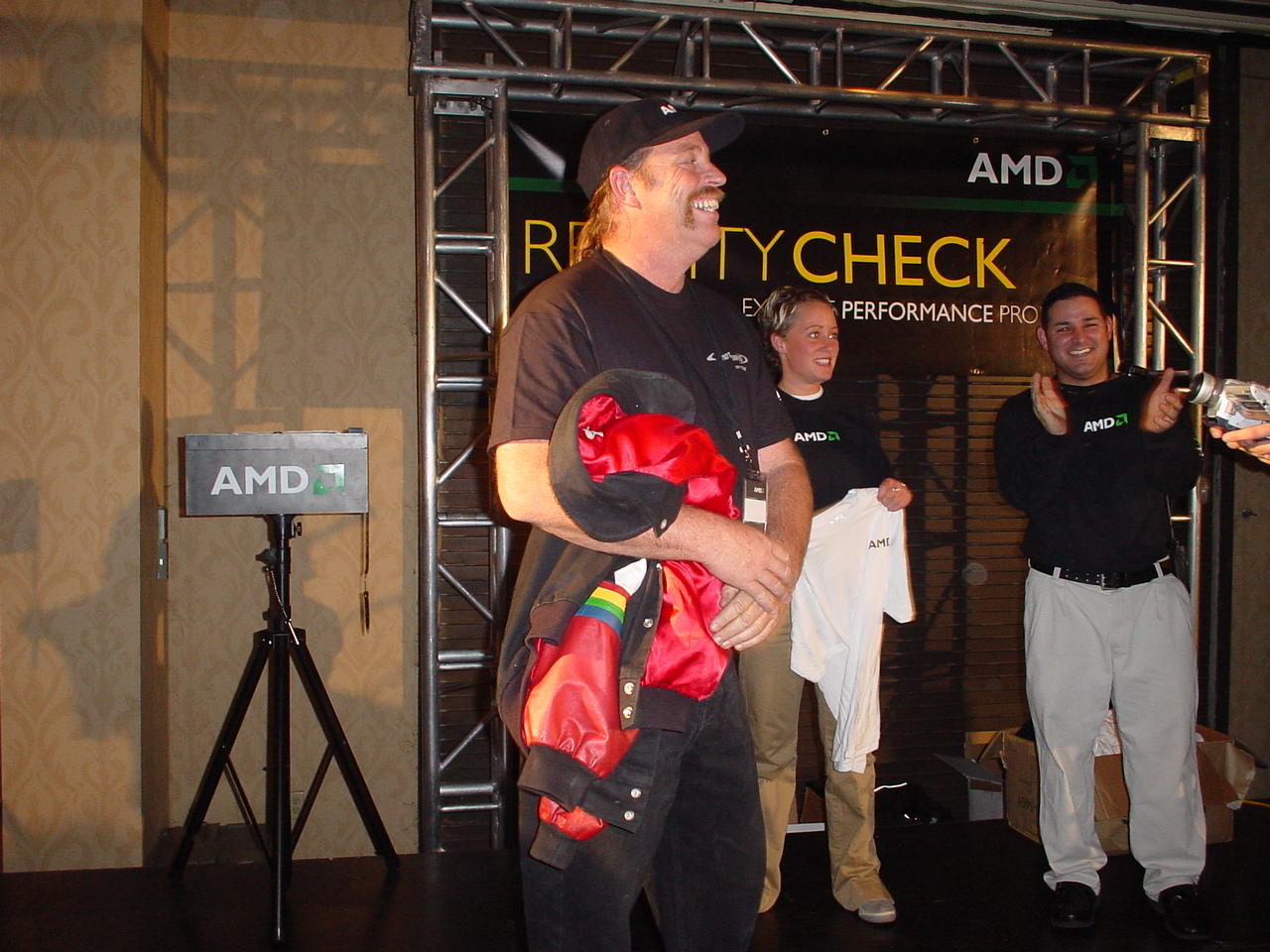 Some free stuff was thrown out into the crowd and a few processors were raffled off. Jen happened to be one of the lucky winners of an AMD XP 2400+ processor. Next, contestants were taken out of the audience to compete in a game show like event where they had to answer questions about AMD products in order to be eligible for the "Battle of the Boxes" (which I will discuss later). Unfortunately, most of the contestants chosen didn't know a great deal about computers and many of the nerds in the audience were shaking their head saying "I can't BELIEVE they didn't know the answer to that!"