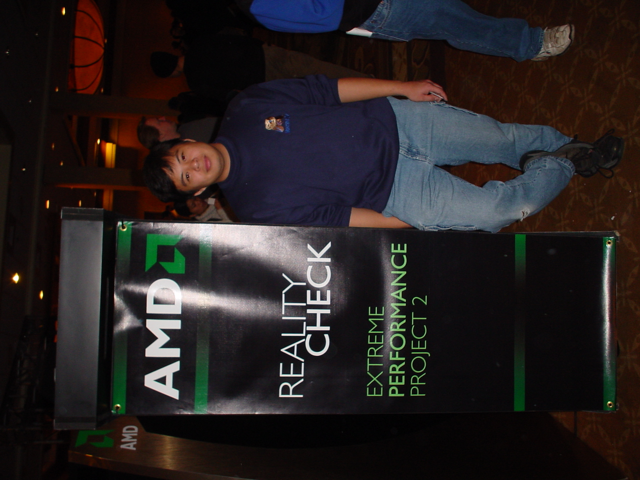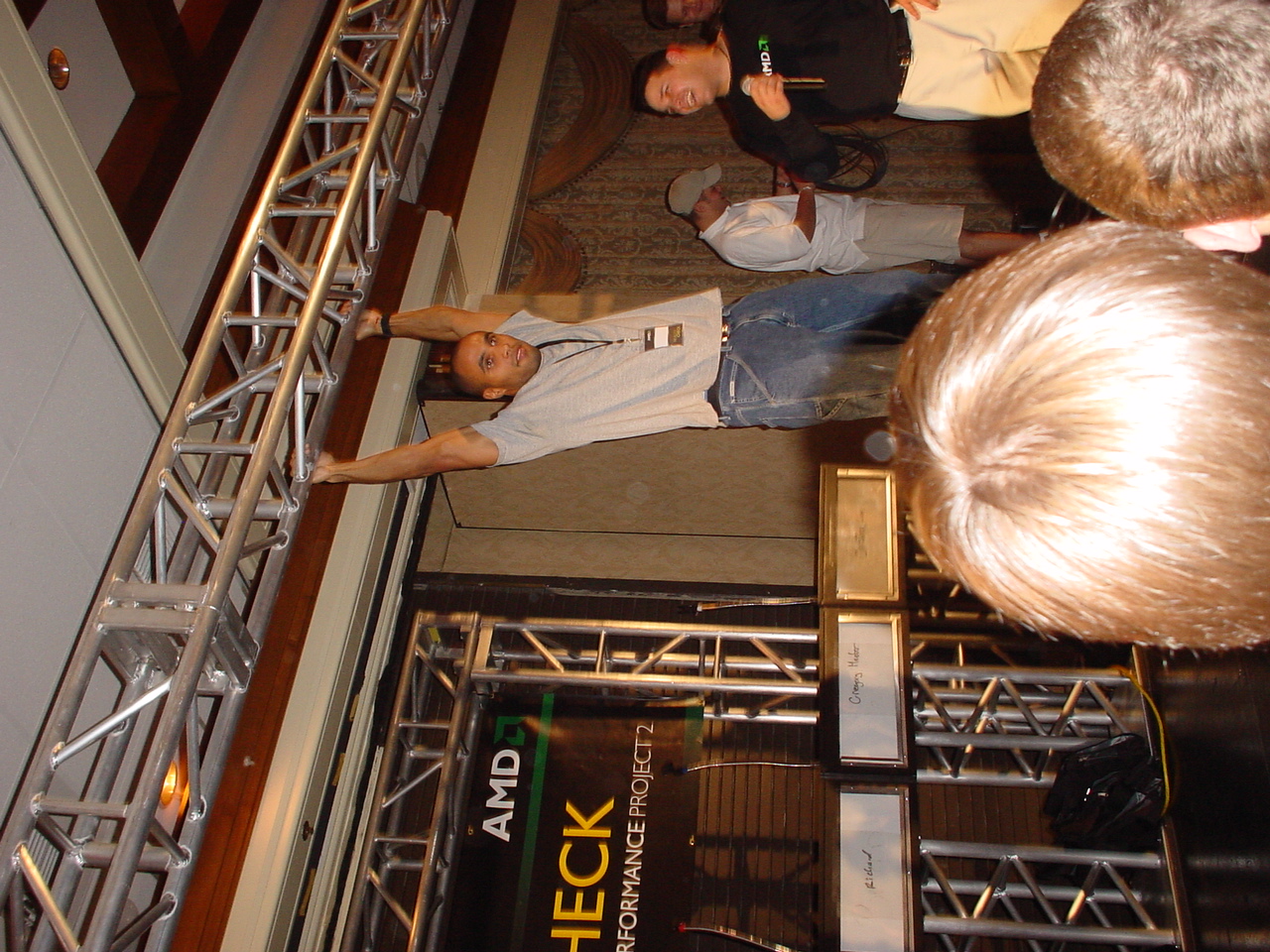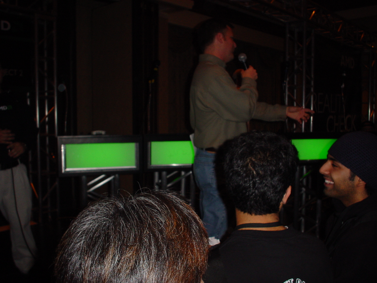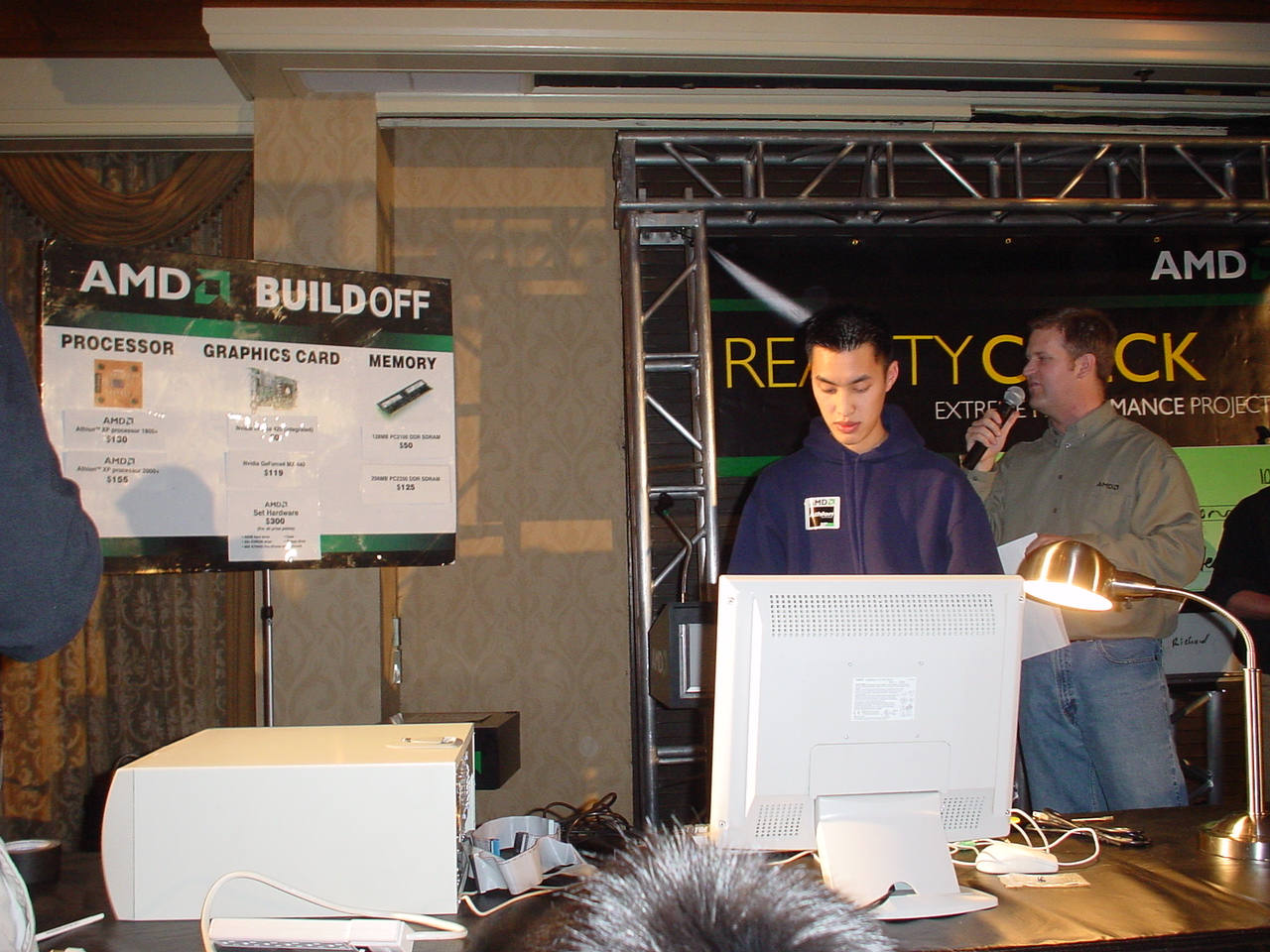 Some free stuff was thrown out into the crowd and a few processors were raffled off. Jen happened to be one of the lucky winners of an AMD XP 2400+ processor. Next, contestants were taken out of the audience to compete in a game show like event where they had to answer questions about AMD products in order to be eligible for the "Battle of the Boxes" (which I will discuss later). Unfortunately, most of the contestants chosen didn't know a great deal about computers and many of the nerds in the audience were shaking their head saying "I can't BELIEVE they didn't know the answer to that!"