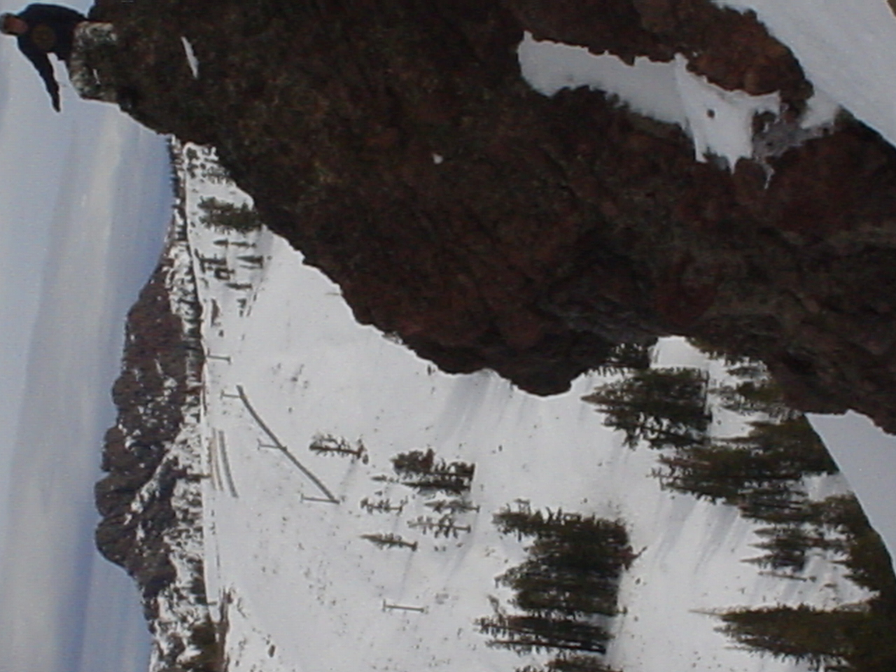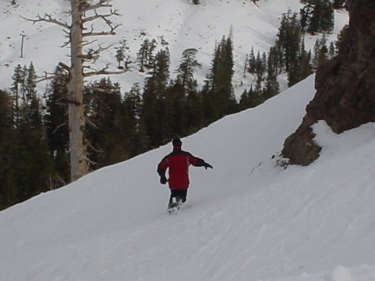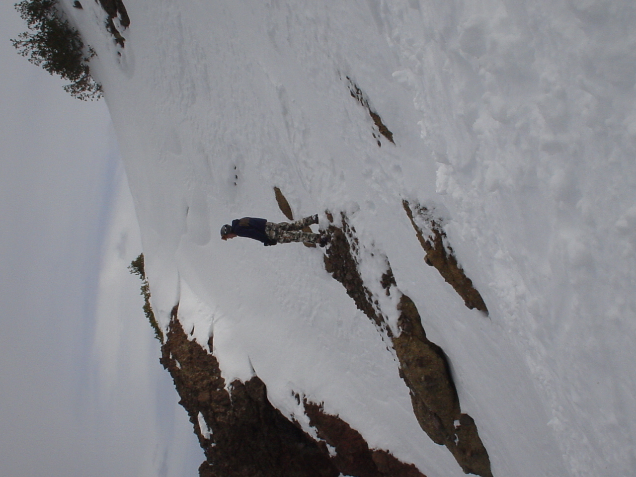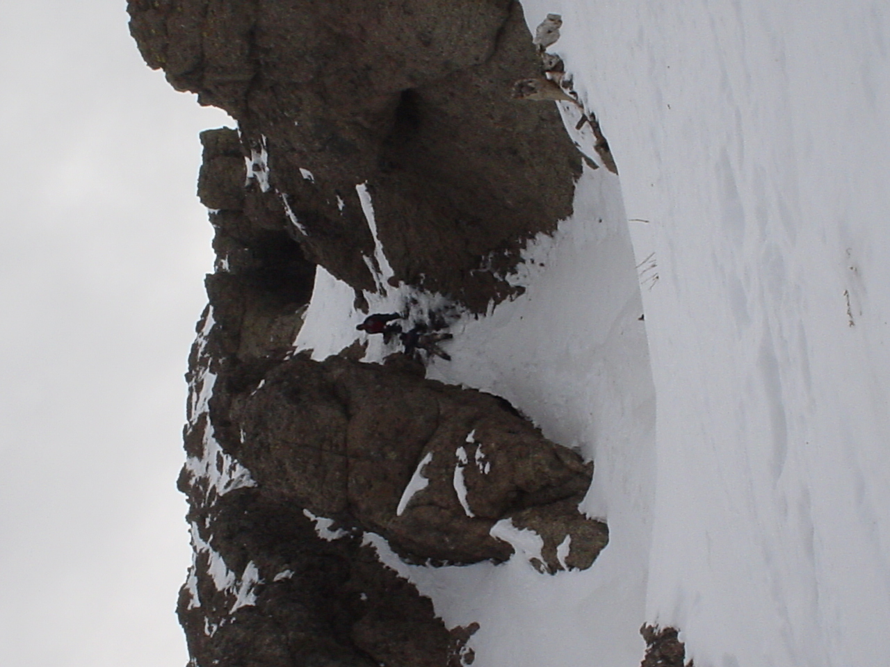 This day turned out to be even better than the first day. We did a lot of traversing off the marked trails in search of good powder. We ended up finding more rocks than powder (as the scrapes on the bottom of my new board can attest too) but we had a lot of fun anyway. A couple of times we ended up getting a bit stuck out in the rocks. We had to convince Dima not to jump off of a large rock that had instant injury written all over it. Finally we were able to talk him out of it. A few minutes later he got himself stuck behind another large rock. He was unwilling to hike up and around it, so instead he was faced with jumping and sliding down a small ravine that went through the rock. This time, instead of trying to convince him not to jump we did the opposite. Spiderman climbed up the rock and slid down the middle of it, just for fun and to show the now apprehensive Dima that it was safe to jump. Finally Dima made the jump and slid down the middle of the rock.