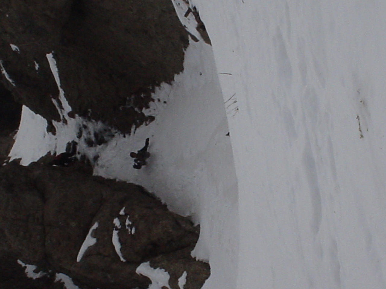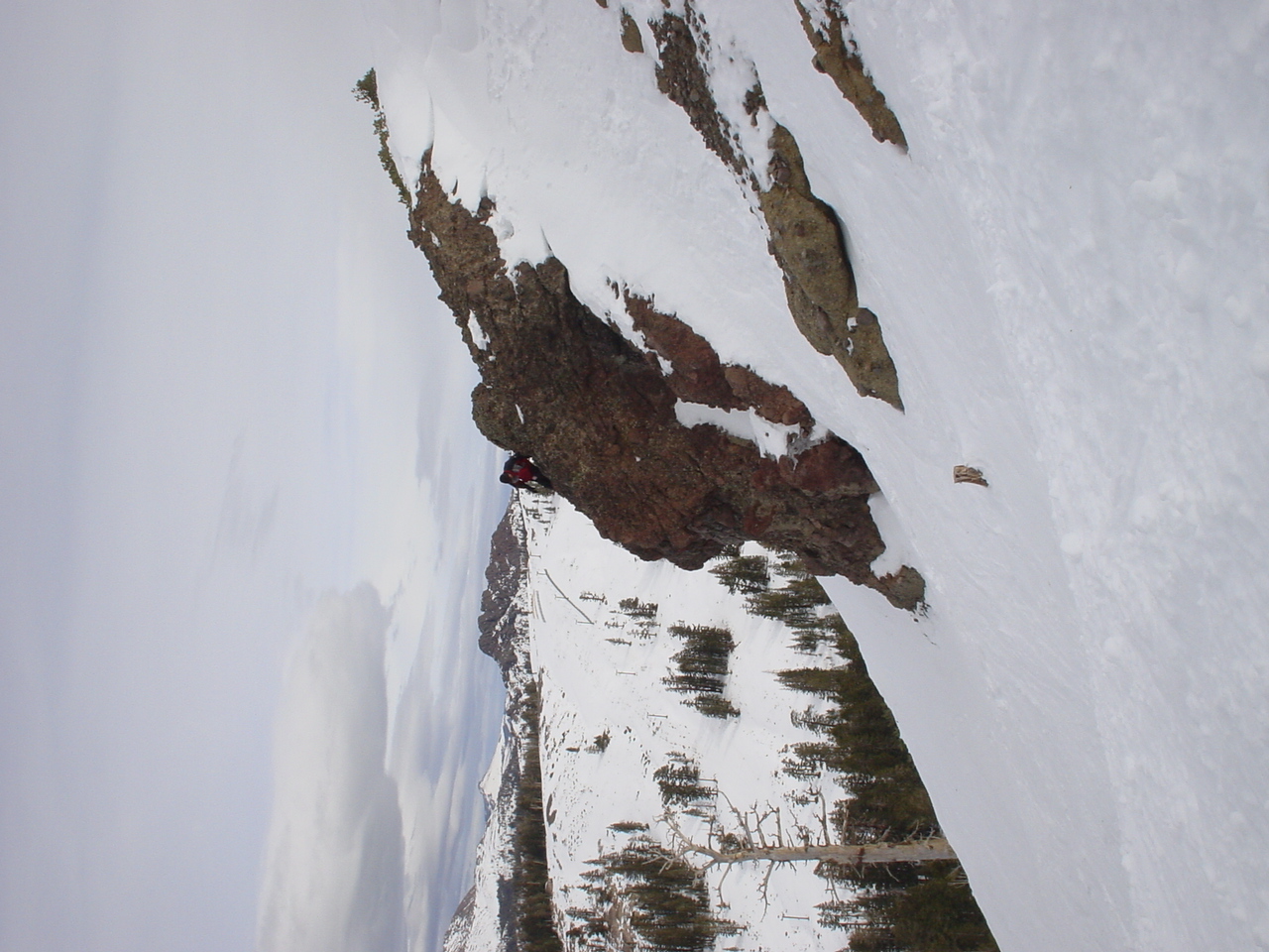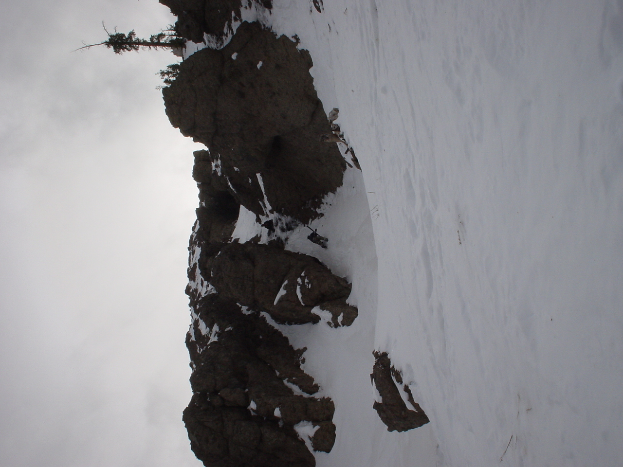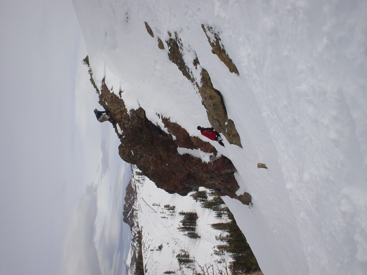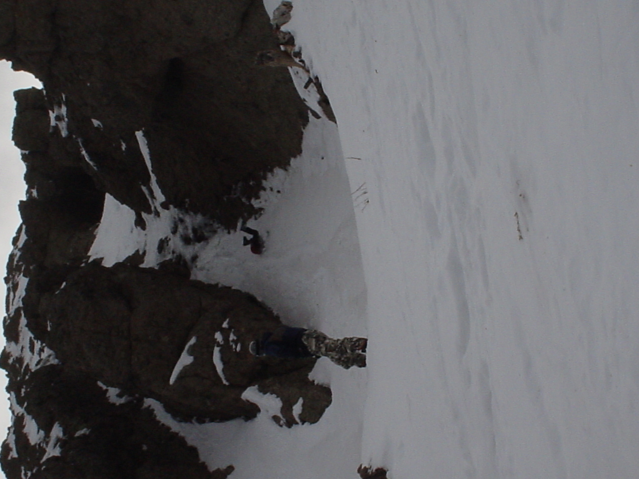 This day turned out to be even better than the first day. We did a lot of traversing off the marked trails in search of good powder. We ended up finding more rocks than powder (as the scrapes on the bottom of my new board can attest too) but we had a lot of fun anyway. A couple of times we ended up getting a bit stuck out in the rocks. We had to convince Dima not to jump off of a large rock that had instant injury written all over it. Finally we were able to talk him out of it. A few minutes later he got himself stuck behind another large rock. He was unwilling to hike up and around it, so instead he was faced with jumping and sliding down a small ravine that went through the rock. This time, instead of trying to convince him not to jump we did the opposite. Spiderman climbed up the rock and slid down the middle of it, just for fun and to show the now apprehensive Dima that it was safe to jump. Finally Dima made the jump and slid down the middle of the rock.
