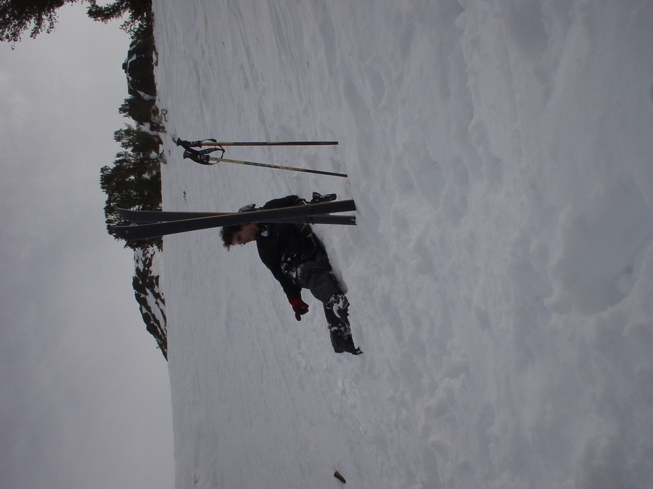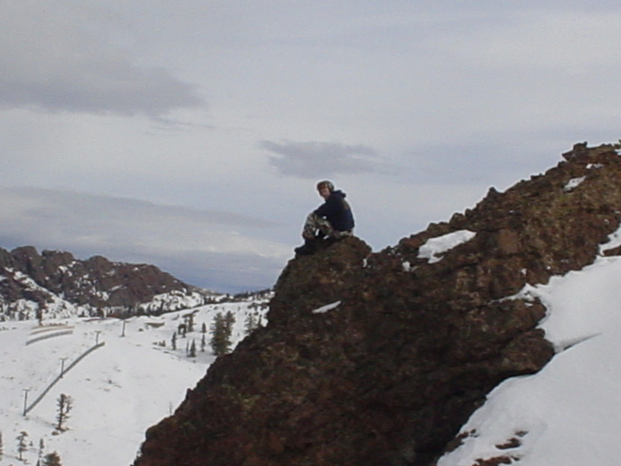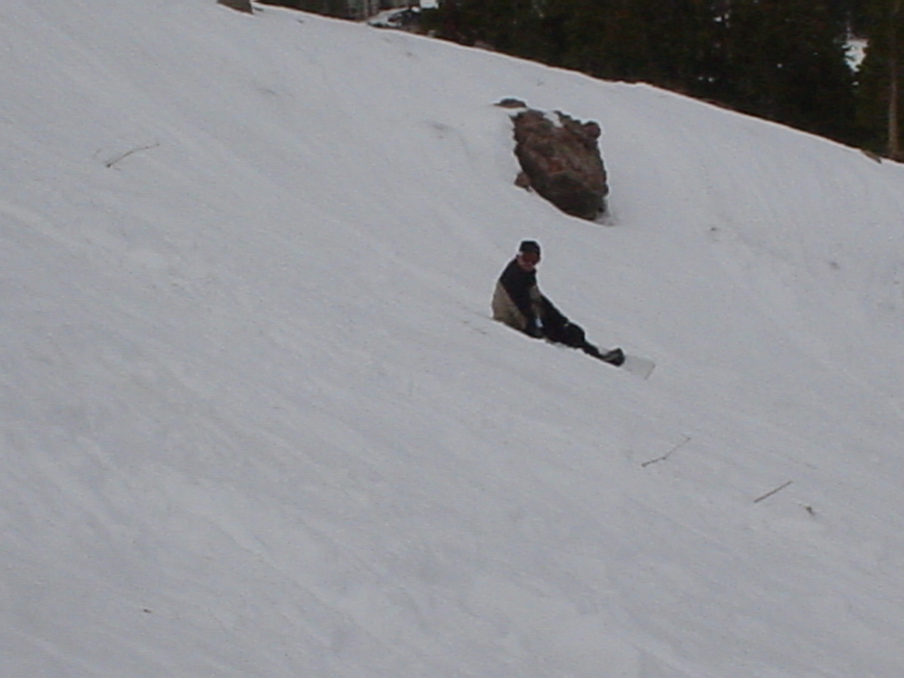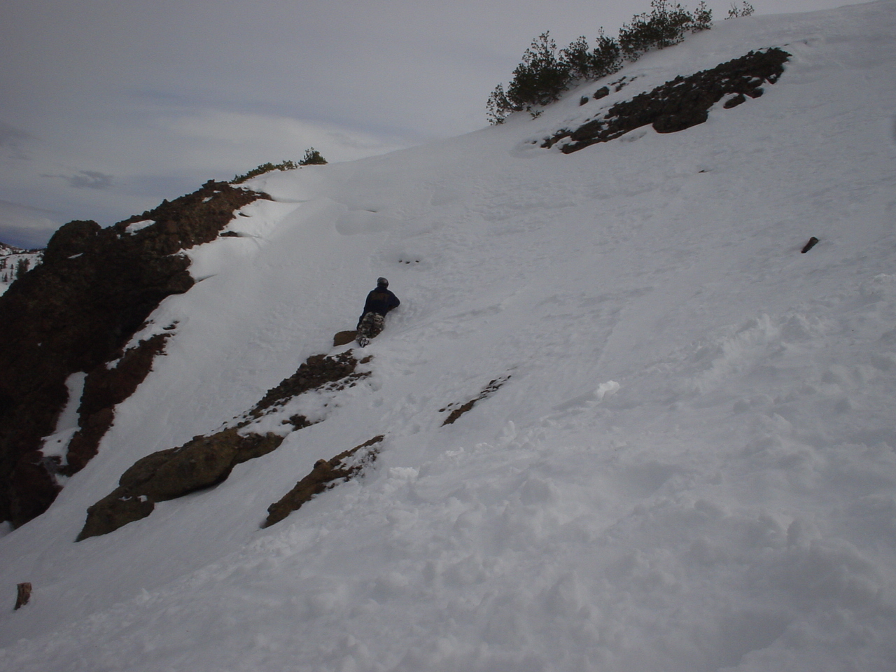 This day turned out to be even better than the first day. We did a lot of traversing off the marked trails in search of good powder. We ended up finding more rocks than powder (as the scrapes on the bottom of my new board can attest too) but we had a lot of fun anyway. A couple of times we ended up getting a bit stuck out in the rocks. We had to convince Dima not to jump off of a large rock that had instant injury written all over it. Finally we were able to talk him out of it. A few minutes later he got himself stuck behind another large rock. He was unwilling to hike up and around it, so instead he was faced with jumping and sliding down a small ravine that went through the rock. This time, instead of trying to convince him not to jump we did the opposite. Spiderman climbed up the rock and slid down the middle of it, just for fun and to show the now apprehensive Dima that it was safe to jump. Finally Dima made the jump and slid down the middle of the rock.