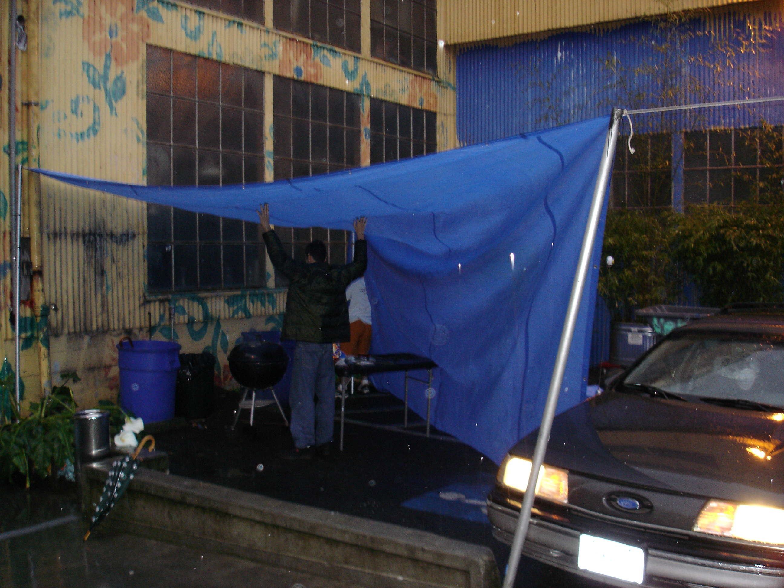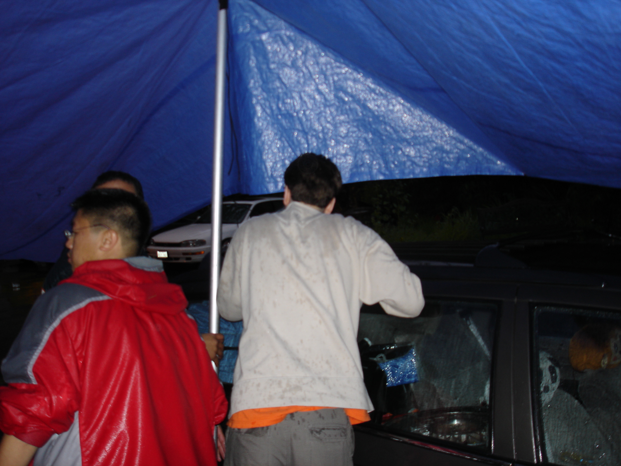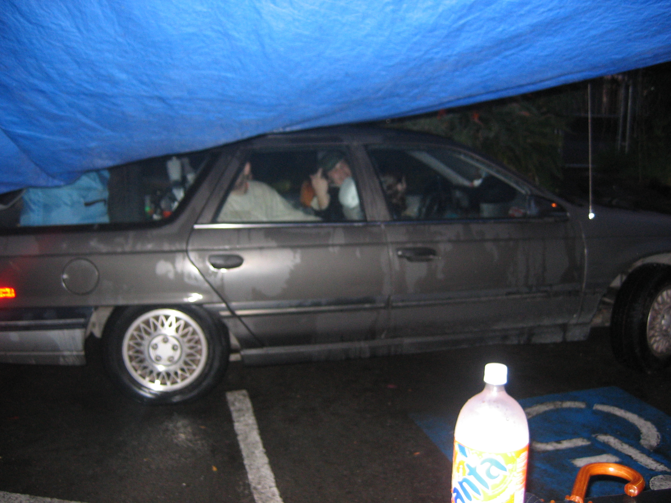 It was windy and rainy, and Ginger was attempting to BBQ outside. A makeshift shelter was rigged up using the Krazmobile as one of the anchor points. Eventually the wind blew it down on top of the Krazmobile. This one also did not feature any paintball craziness.