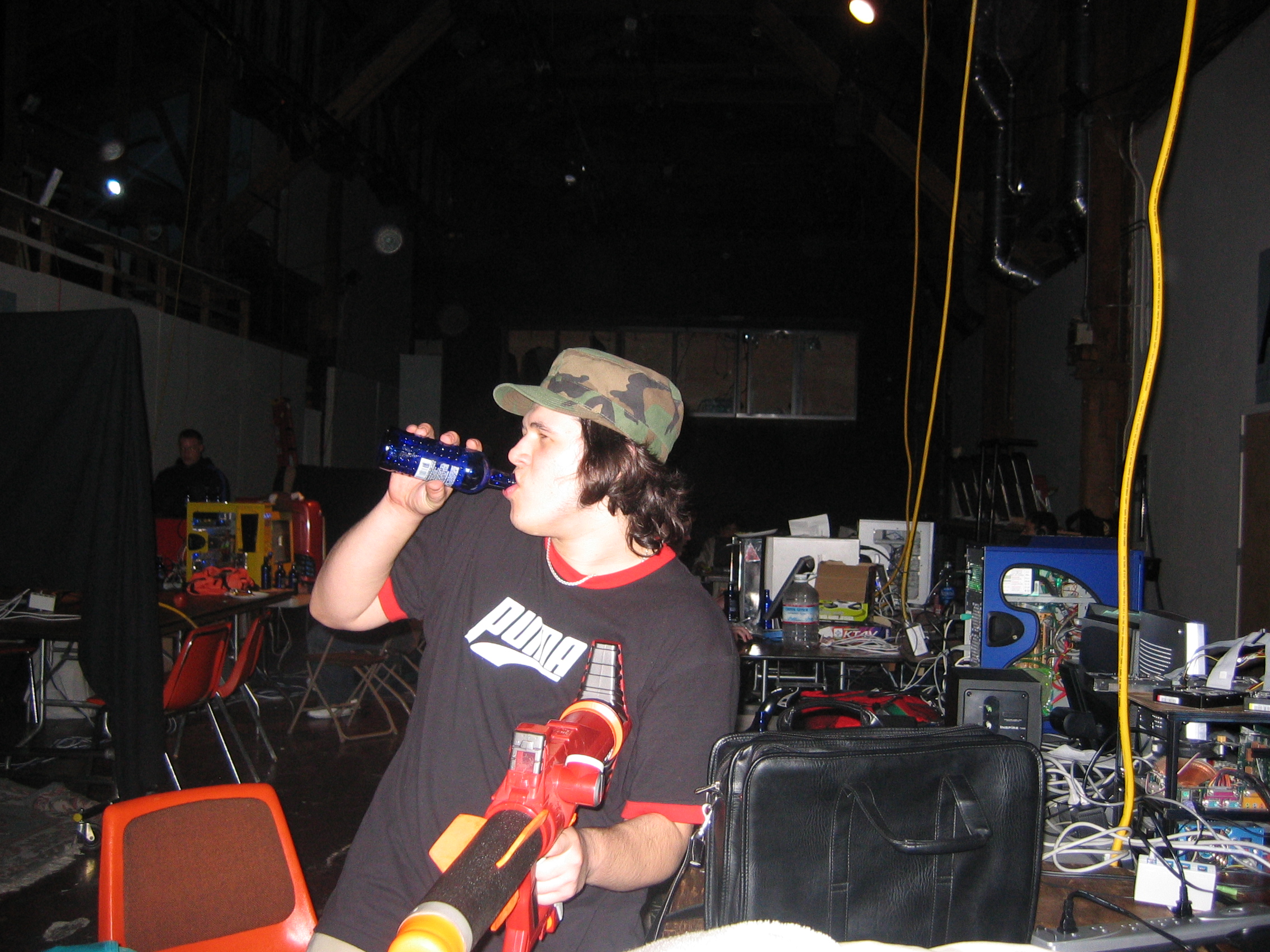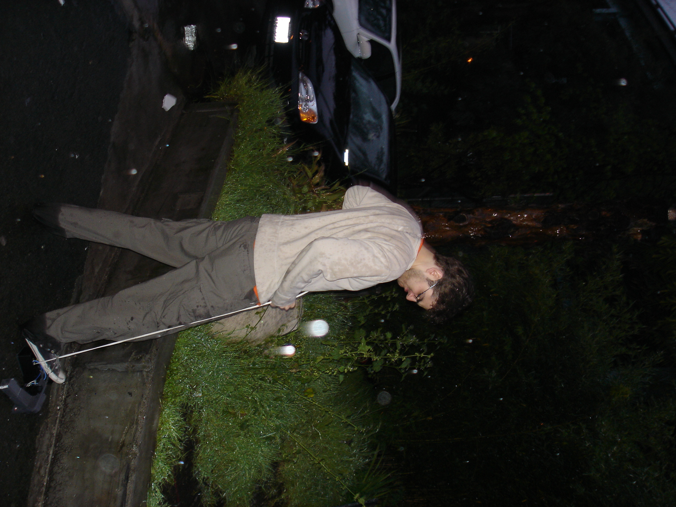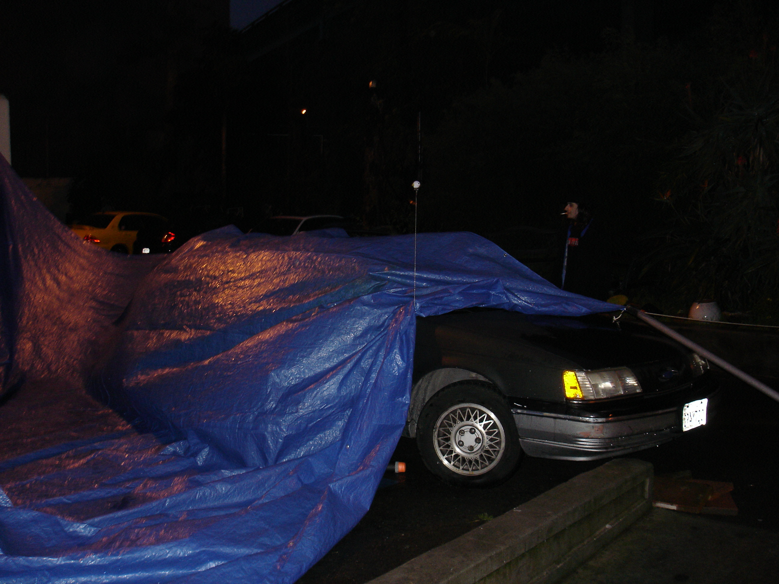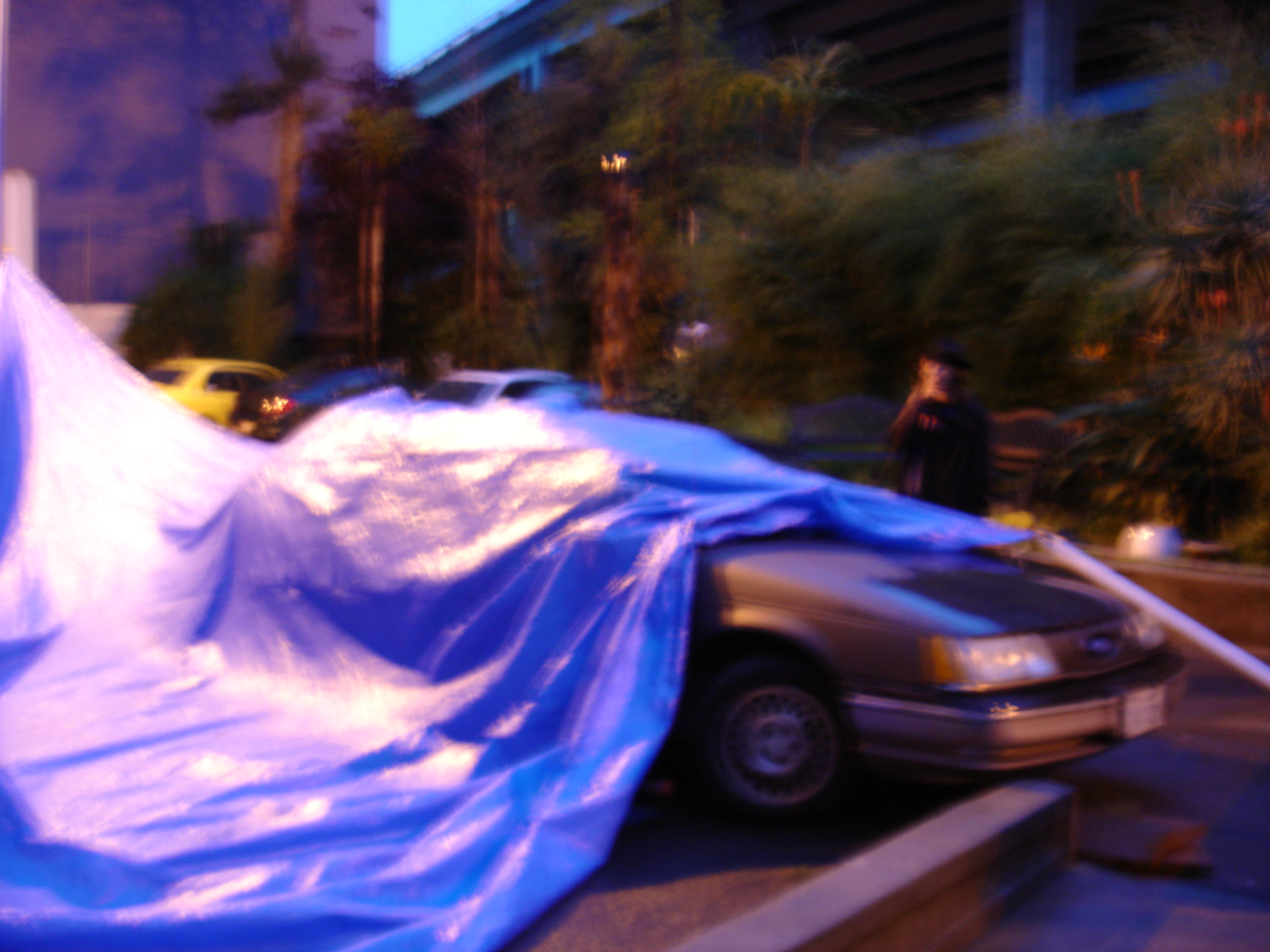 It was windy and rainy, and Ginger was attempting to BBQ outside. A makeshift shelter was rigged up using the Krazmobile as one of the anchor points. Eventually the wind blew it down on top of the Krazmobile. This one also did not feature any paintball craziness.