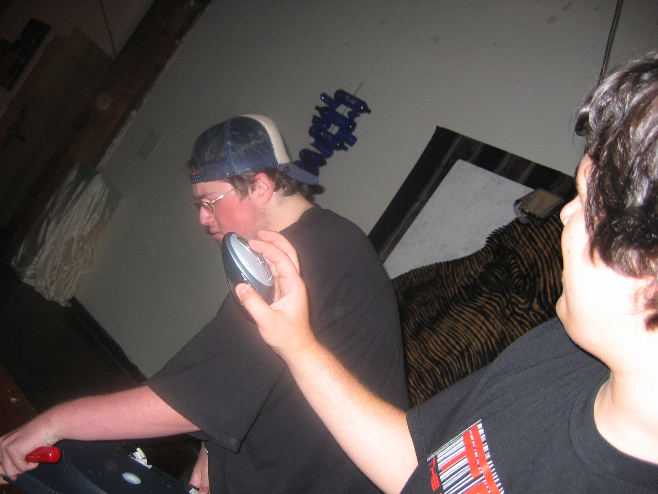 The Wheel of Consequence said that we were to shoot eachother with paintball guns in order to win our prize. We were all given AG LAN T-shirts, and told that from across the room, one of our team mates had to hit us somewhere on the AG LAN logo that was on the shirt. First up was Metalslug shooting me. Lukly he is a good shot, and hit right on target the first try. Next it was me shooting him. I ALMOST got him the first try, but was low about a milimeter. Unfortunately I overcorrected on my next shot, and got him in the neck.. but the third shot.. that one was good. Next, we had Metalslug shooting at Kuyaglen, and that took two shots. So we all got our prize which was a gig of RAM for each of us (worth about 100 bucks)... not bad.