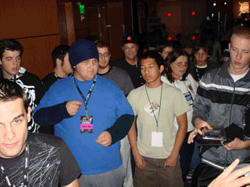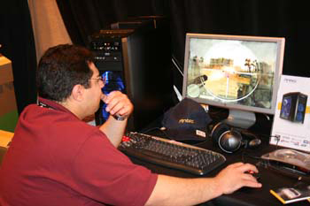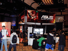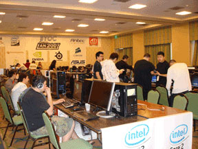 The expo area of the LAN was pretty nice and professionally done. There was a large stage for presentations and contests, fancy lighting, and a huge projection screen on the back wall that showed tournaments and things like that. They had professional MCs to keep people entertained and excited throughout the event, and lots of camera crews walking around capturing everything that happened. There were a number of tradeshow style booths sponsored by many high tech companies including: Antec, Nvidia, Intel, Corsair, Ageia, BFG, XFX, Evga, VisionTek, Thermaltake, Patriot, PNY, etc.