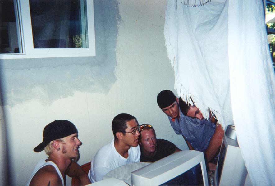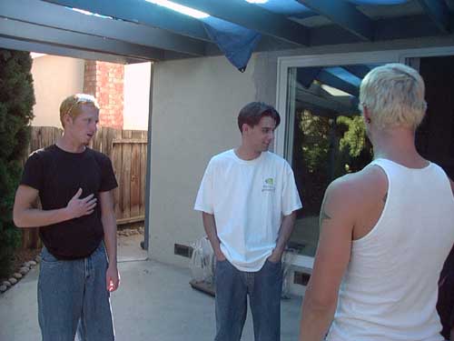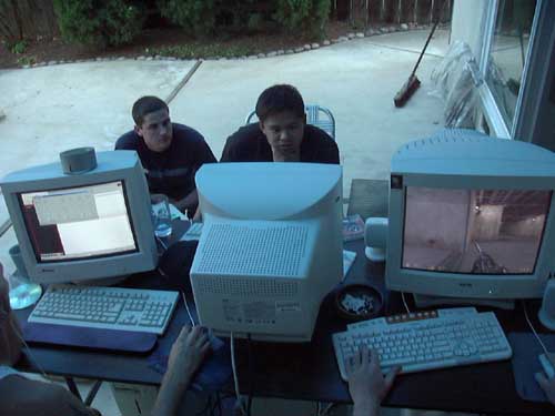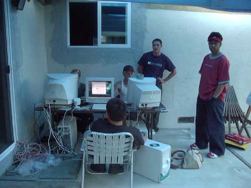 This may have been one of the more poorly thought out LANs we did. Since the weather was nice we thought it would be a good idea to have part of the LAN be on the backyard patio. This way we could grill and hangout while we gamed. Seemed like a great idea on paper, but we failed to realize the effect of sunlight glare on the screens. So, we had to hang a bunch of blankets from the patio overhang to block the sun. We also failed to consider how cold it would get out there once the sun went down. Needless to say, we didn't do this particular configuration again.