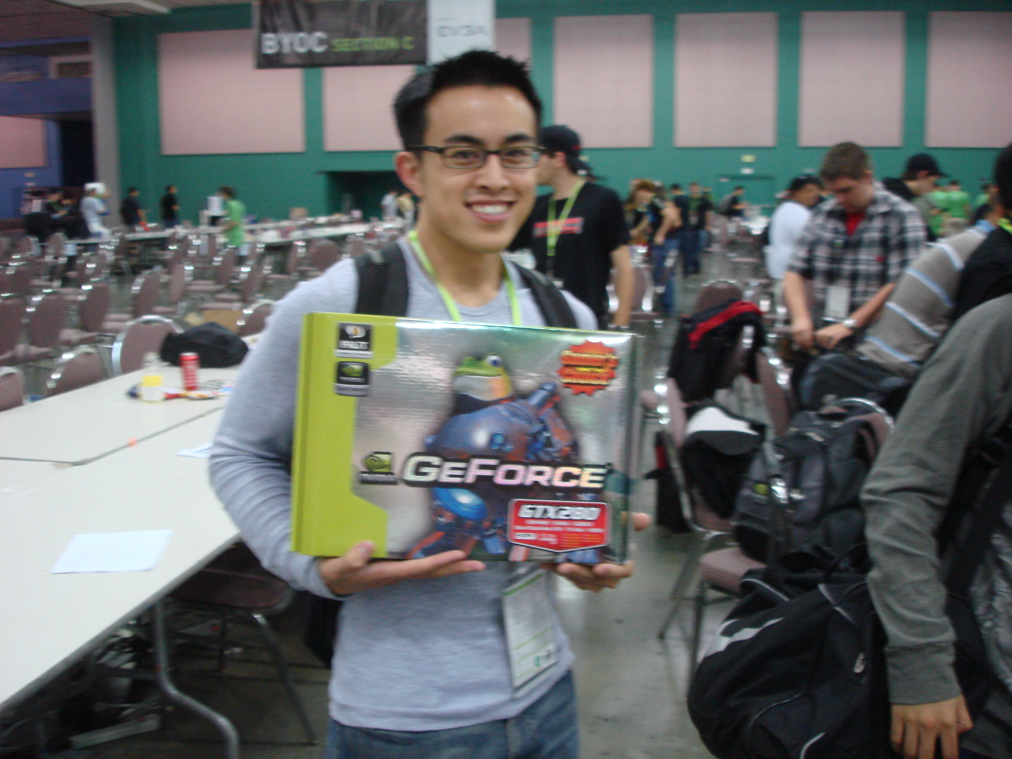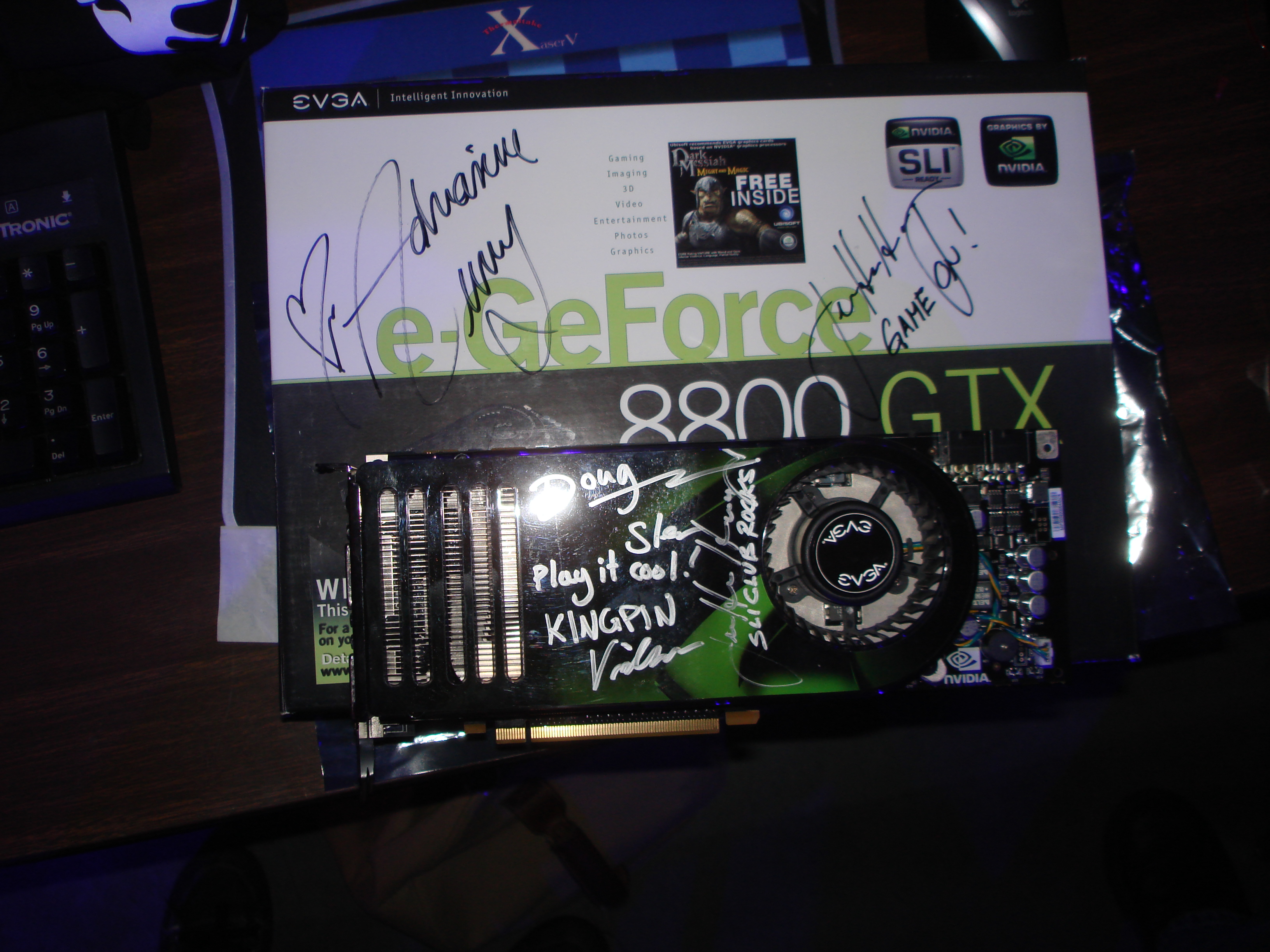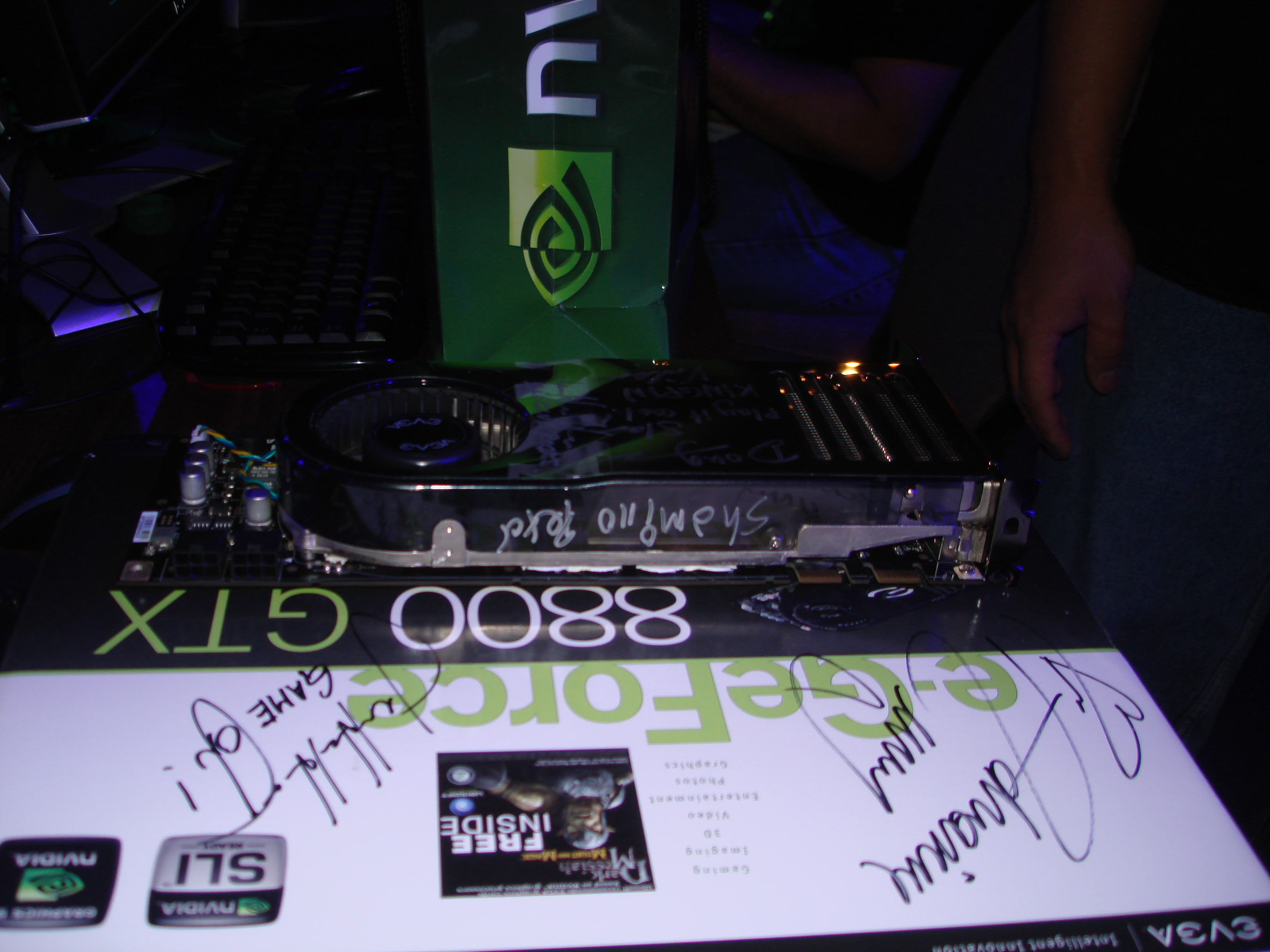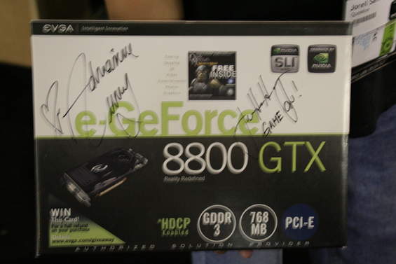 As you may remember from the GeForce 3 chapter, Quemine and his buddy Voodoo had gone out and bought EVGA brand GeForce 8800 cards the minute they were launched at GeForce 3. They brought them to the LAN and had the cards as well as the boxes autographed by Jen Hsun (the Nvidia CEO) and actress Adrianne Curry. EVGA who was a GeForce LAN sponsor caught wind of this, and shortly after the event posted up pictures of QueMine and Voodoo offering to give them a full refund in exchange for the autographed boxes (they would get to keep the cards, essentially making them free). Unfortunately, none of us saw this website until years later when a few months before Nvision one of us discovered it.