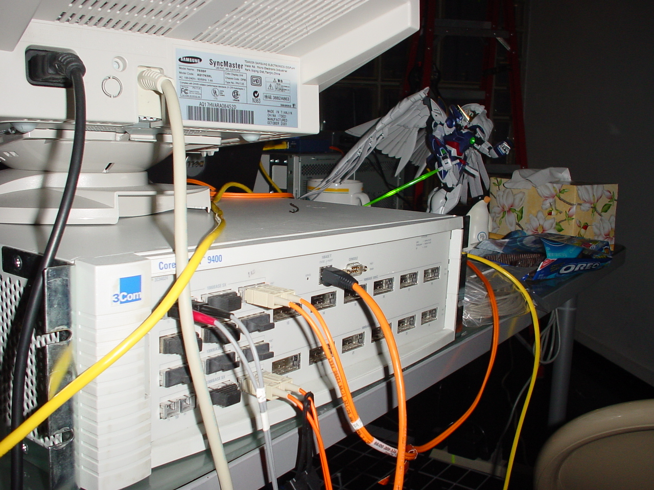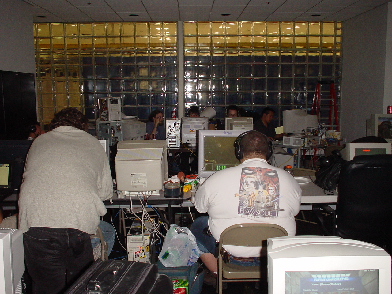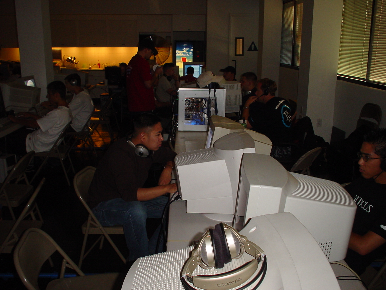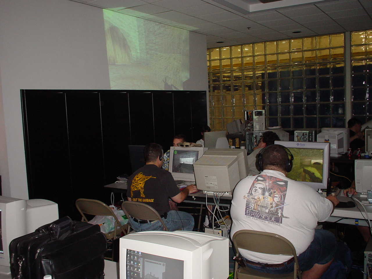 Once everyone started connecting to the network I began hearing gasps of joy and shouts of ecstasy as the network speed was analyzed. The network was on a fiber optic backbone with a 100mbps switch, so the connection was wicked fast. The building itself, which was home of Hurricane Electric (web hosting company) also housed all of the HomeLAN servers. You could see into the server room through a glass wall that was on one side of the room. Such a sweet setup made for some extremely low pings. I talked to some of the party Admins (who were extremely nice) and found out that there were 10 servers in use that were donated by HomeLAN and another CS server that was brought by the West Coast Elite Clan (WCE). Most of the CS battling took place in the WCE server throughout the day.