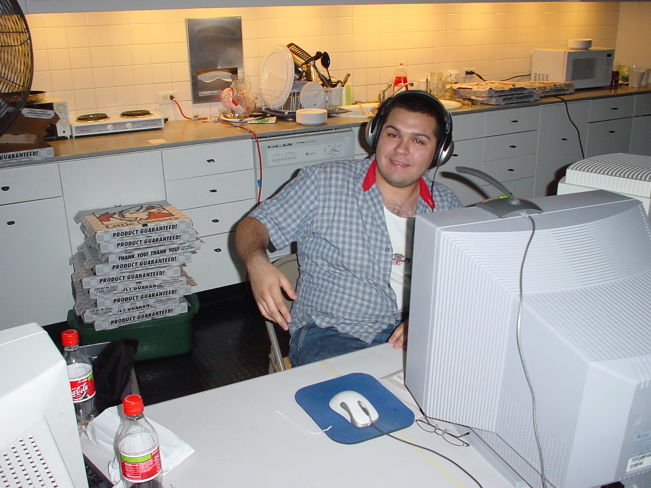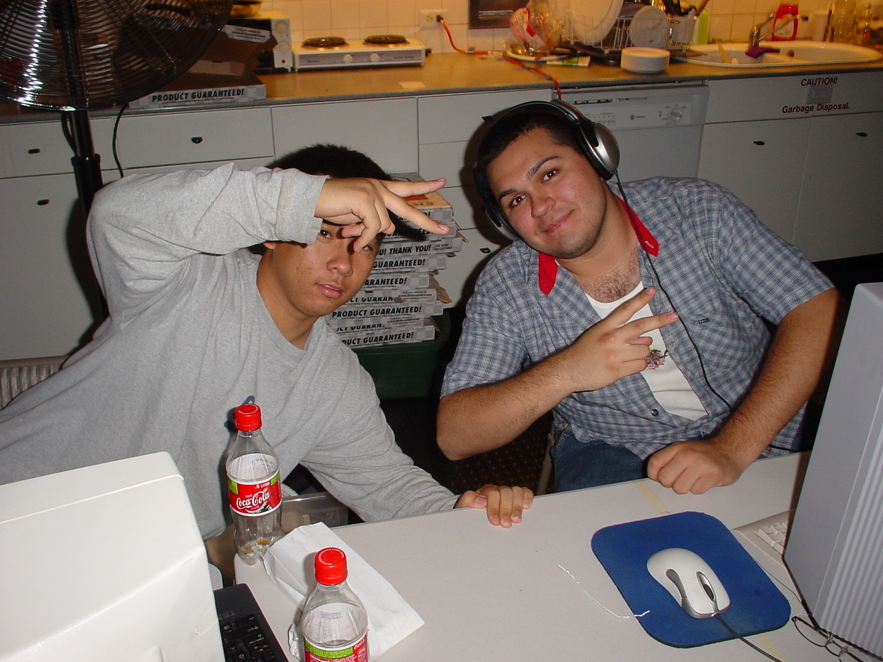 After a while fellow Mower, QueMine, showed up and set up his P4 and his Athlon XP rigs. We kicked some butt at Jedi 2 and CS together and QueMine showed off his sweet rigs to interested partiers who passed by. All were extremely impressed with the speeds he was able to get out of those machines. A bunch of people even asked him to OC /tweak their machines for them. A lot of people went a way from that party with faster machines because of him. QueMine is the tweaking master!