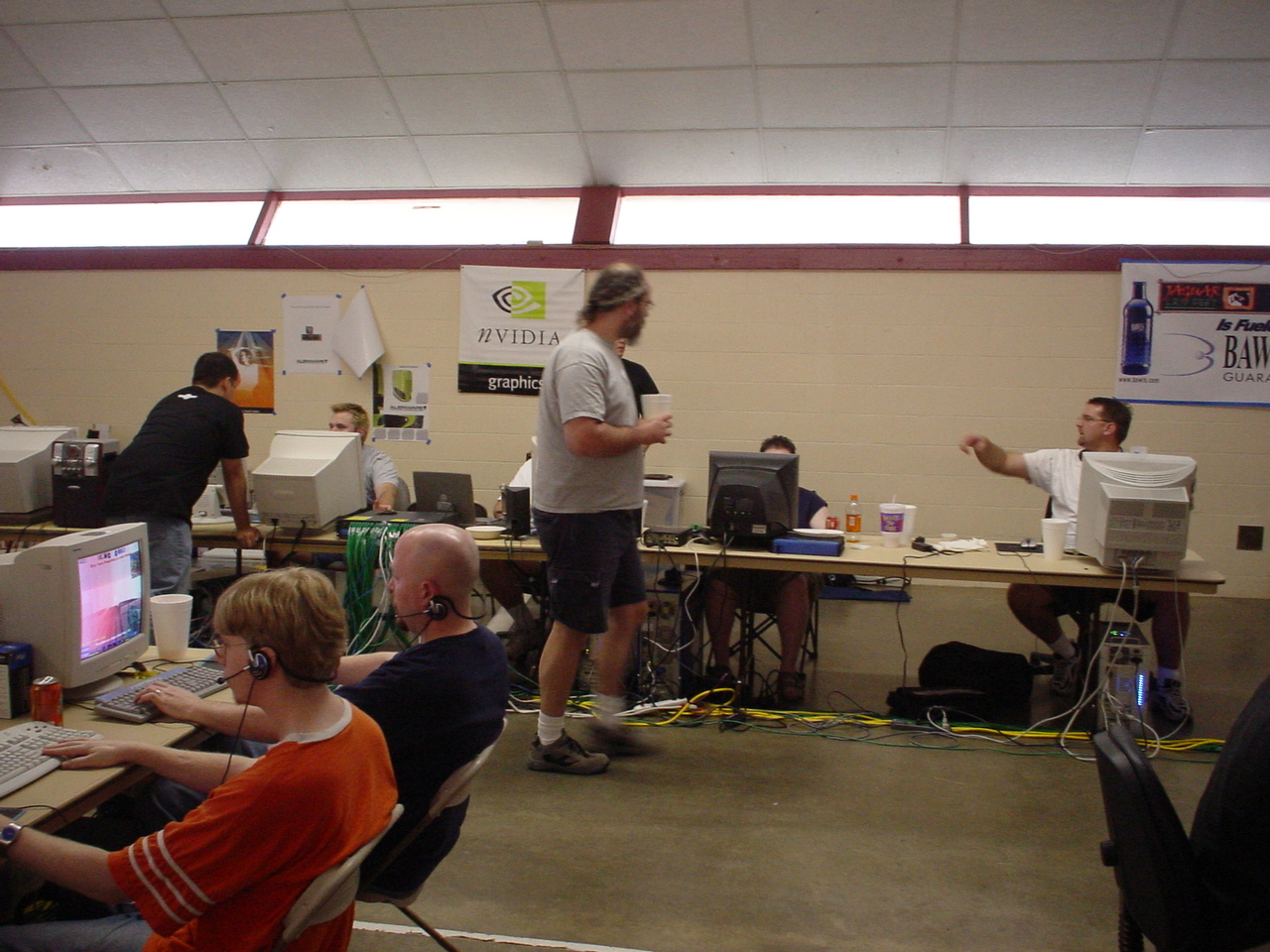 The LAN was an interesting and fun combination of familiar faces, new faces, and people I hadn’t seen since last year. Although there were no tournaments or anything, there were plenty of people in the few popular games that were played. As the LAN went on, you could see that the people who stayed up all night were fading fast. Toward the end, most people looked like zombies. Around 6pm, they did the raffle drawings. They gave away a Pentium 4 Extreme Edition, a power supply, and a few mouse pads. They then announced the winners of the Tag line contest. This caught me and many others by surprise, as we hadn’t heard much about this contest. I had read briefly about it, but assumed it was something that was going on at the LAN. I guess it was our fault for not reading the details on the main page thoroughly enough, but you would think that considering they were giving away almost $3000 worth of prizes (Three P4 3.2EE’s) in that contest they would have hyped it up a little bit more. After the contests were over, lots of people (most tired from being up all night) left, including my brother and I.