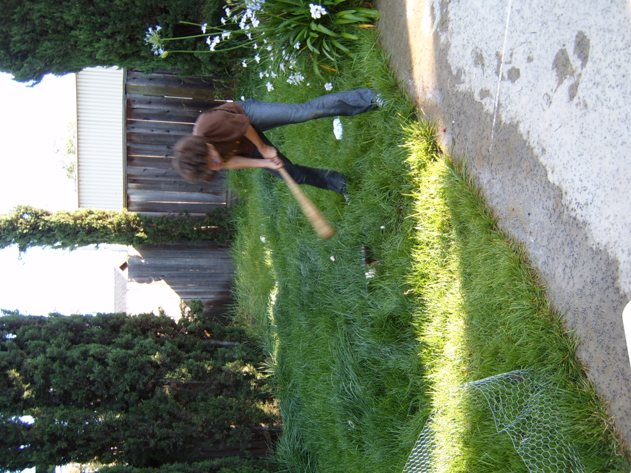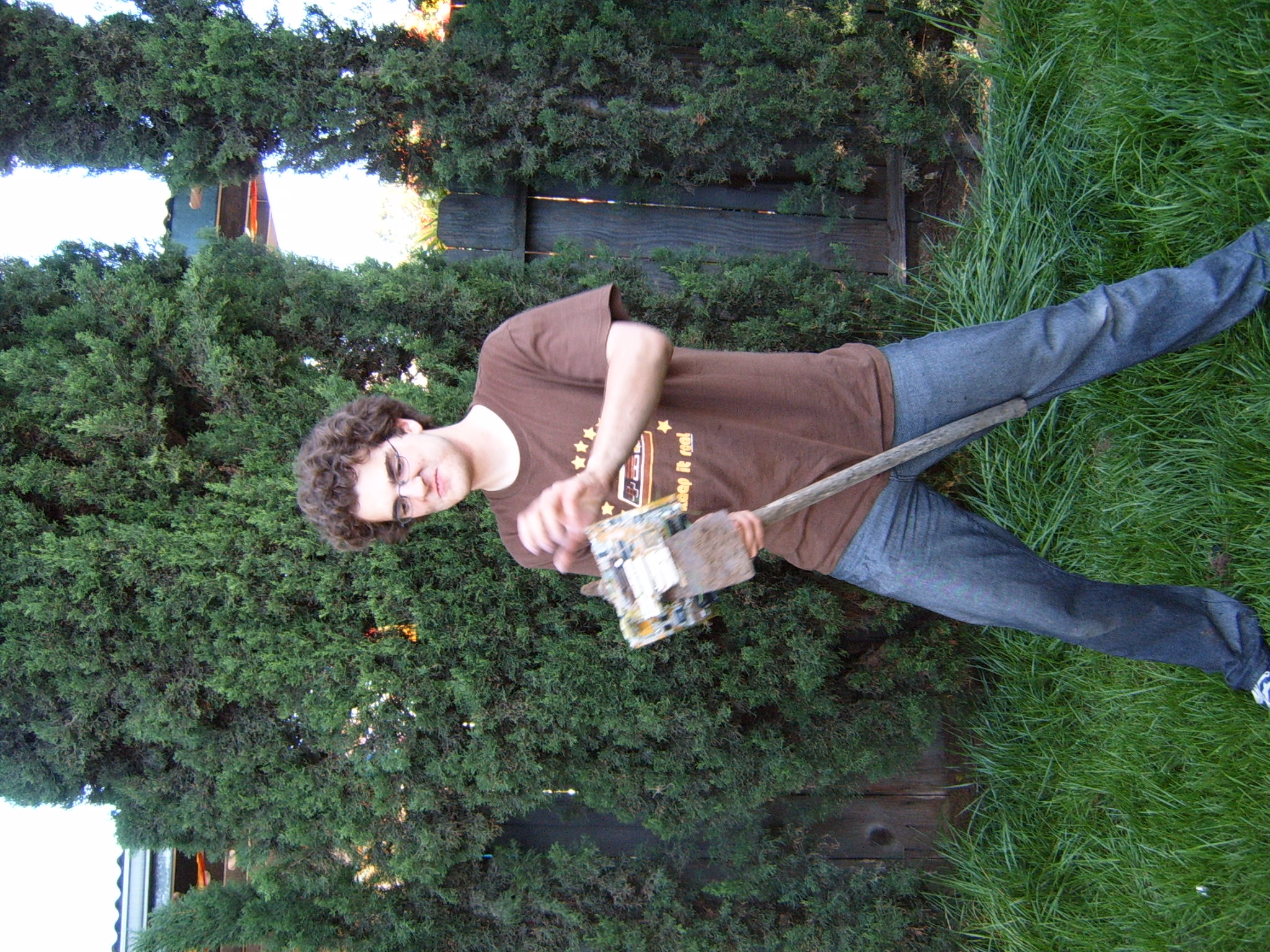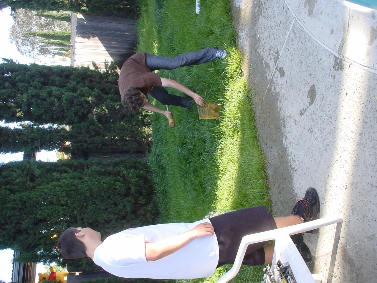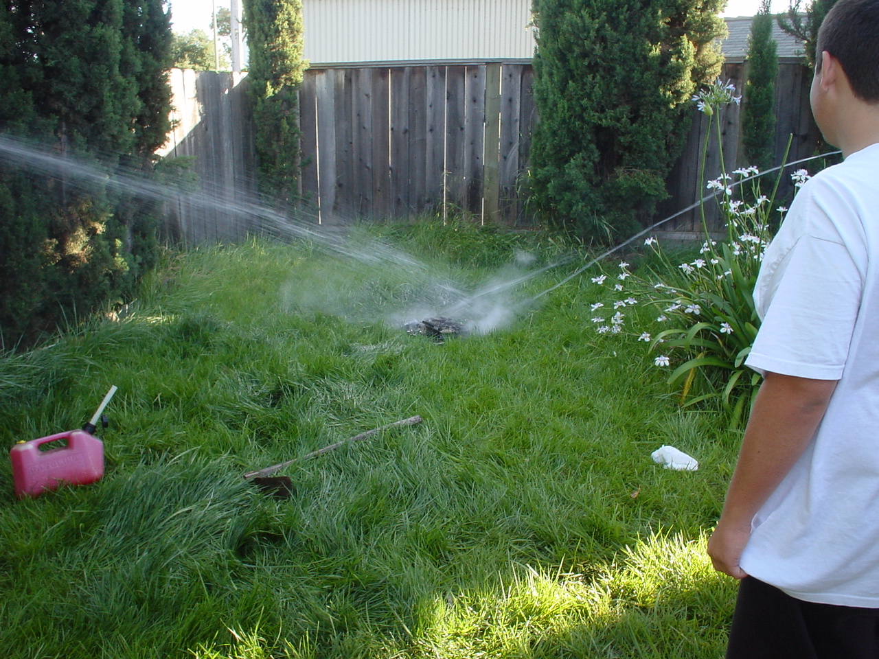 The prolonged periods of chilling and leisurely activities ended up having the effect of raising the testosterone levels at the party to dangerous levels. Kraz came in and promptly rushed out to the backyard, grabbed a baseball bat and went to town on the scrapped computer components sitting by the pool. It seemed that his broken car had driven him to insanity. As the Mariachi music played, he unleashed his fury, until there were several smashed motherboards at the bottom of the pool. At this point, the testosterone levels rose to an even higher critical level, and the rest of us were compelled to go outside and smash, destroy and burn. Several LANers joined in on the carnage, and soon there was nothing but a pile of un-recognizable computer parts in the middle of the backyard grass. We all stood around looking at this pile, at a loss as to what to do next, when someone shouted “hey, let’s burn it!!” This, of course, seemed like a splendid idea, so after an abortive attempt with lighter fluid, a big can of gasoline appeared. Soon, the entire pile was drenched in gasoline. Mameman dropped some matches on it, and up in flames it went! This wasn’t enough; of course, as Mameman felt the flames were not big enough. In a sheer stroke of genius, he poured gasoline directly on the open flame. Even all of us testosterone induced guys knew this was an extremely bad idea, but surprisingly, no one was killed/ and or hurt.