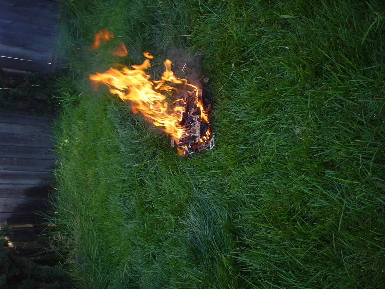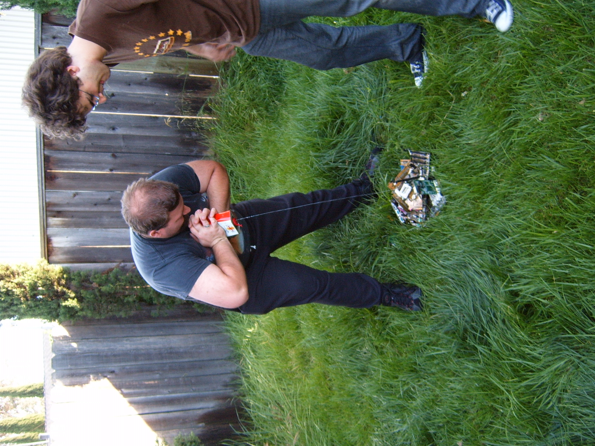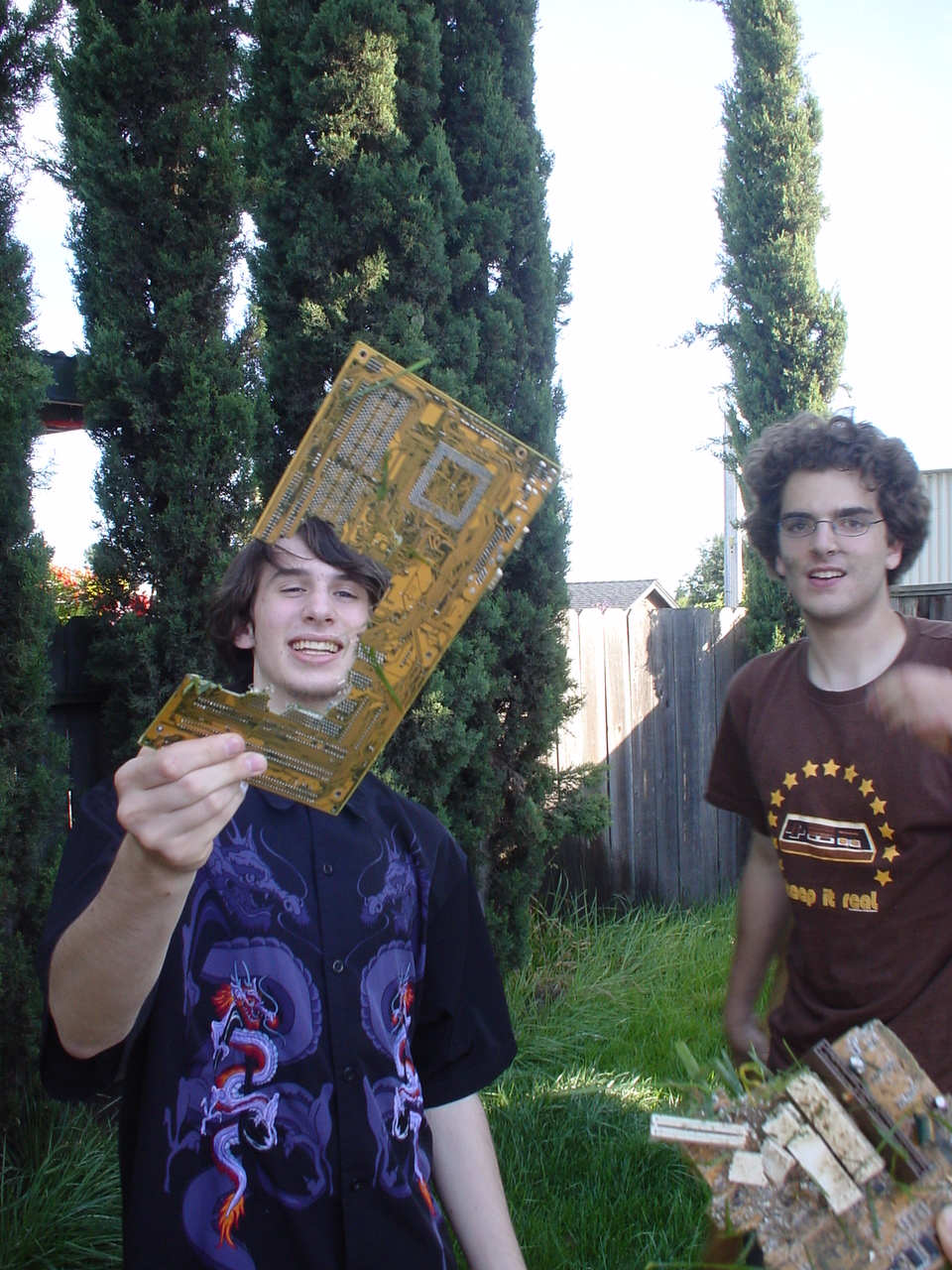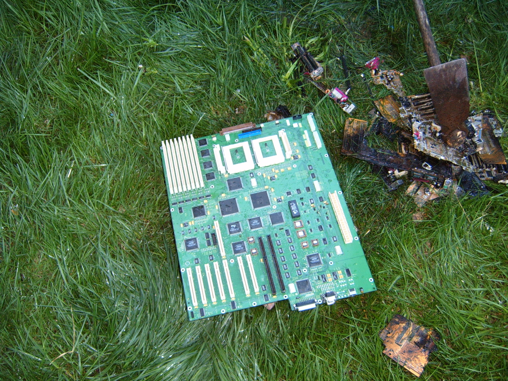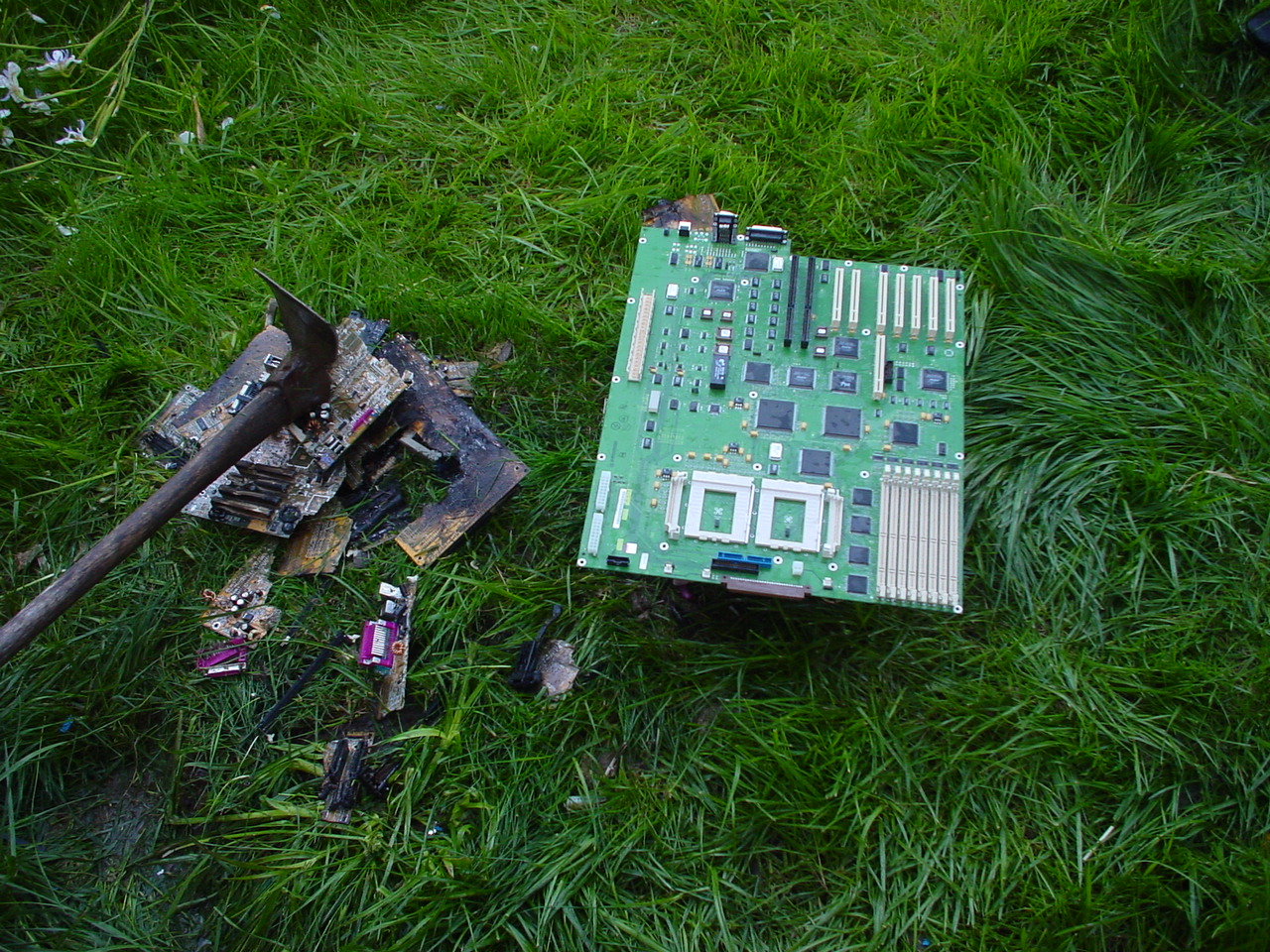 A cloud of noxious fumes rose from the burning mess, and Metalslug commented that he heard “chemical fires were really hard to put out.” Just about that time, the capacitors on the boards began to explode and pop, and for a few seconds, it was just like the 4th of July back home. While some of us retreated from the clouds of fumes, others poured water on the burning wreckage. After the fumes had blown away, and the fire was out, we all stood around the charred heap, feeling a huge sense of satisfaction and accomplishment. The fun didn’t stop there though. Mameman, as if by magic, conjured up a particularly huge and particularly ancient looking server board. We all examined it, and decided that it, in fact, must be burned as well. On went the gas, and up went the flames, as we once again reveled in the ecstasy of pure testosterone overload. Once that was over, we all took pictures of our achievements, and went back inside to play more games.