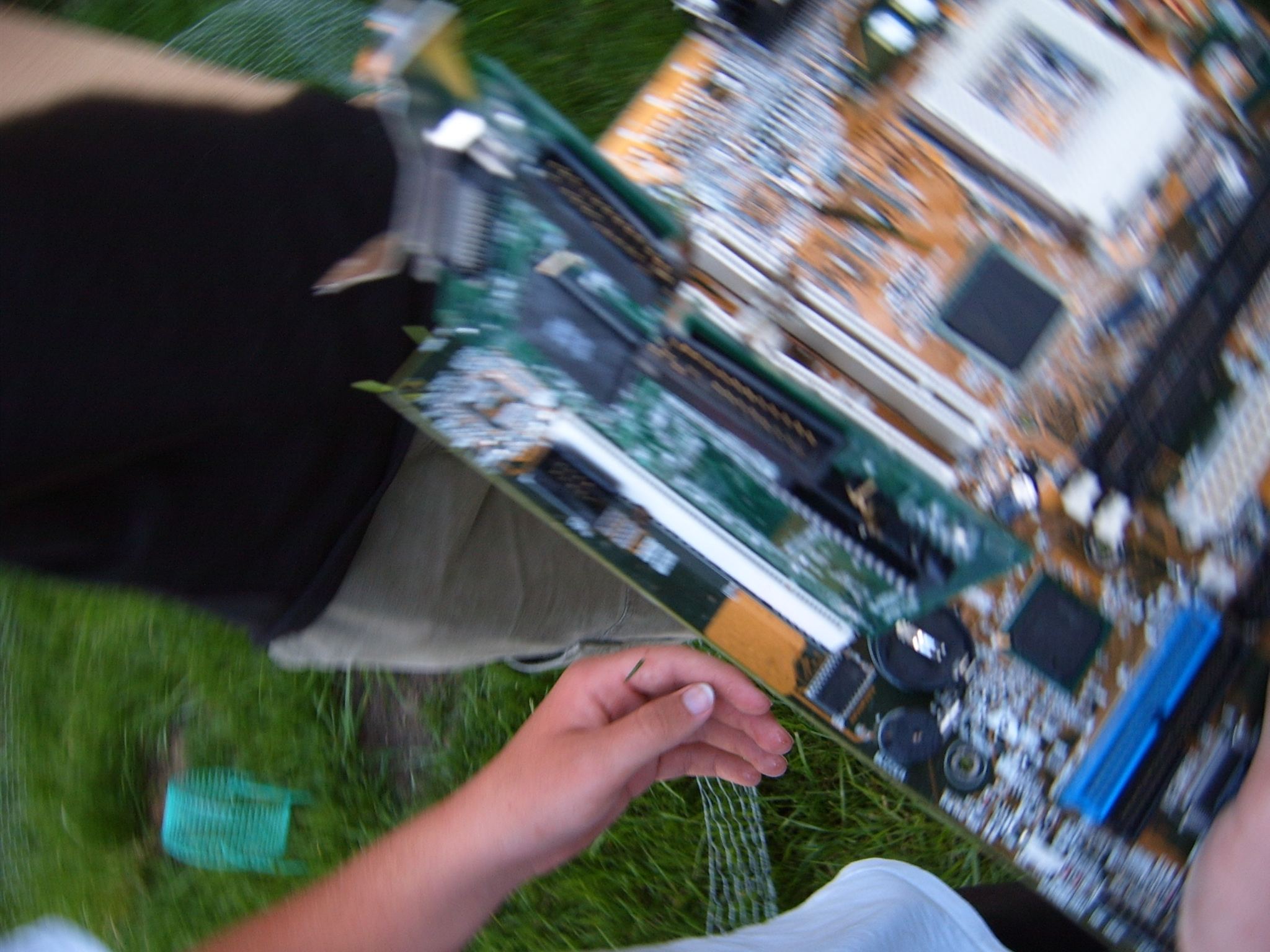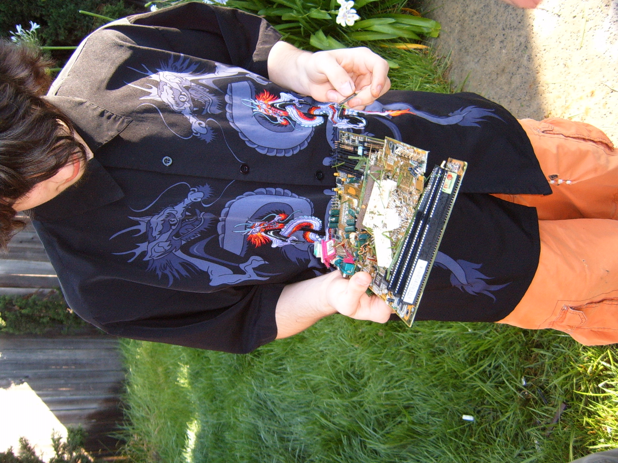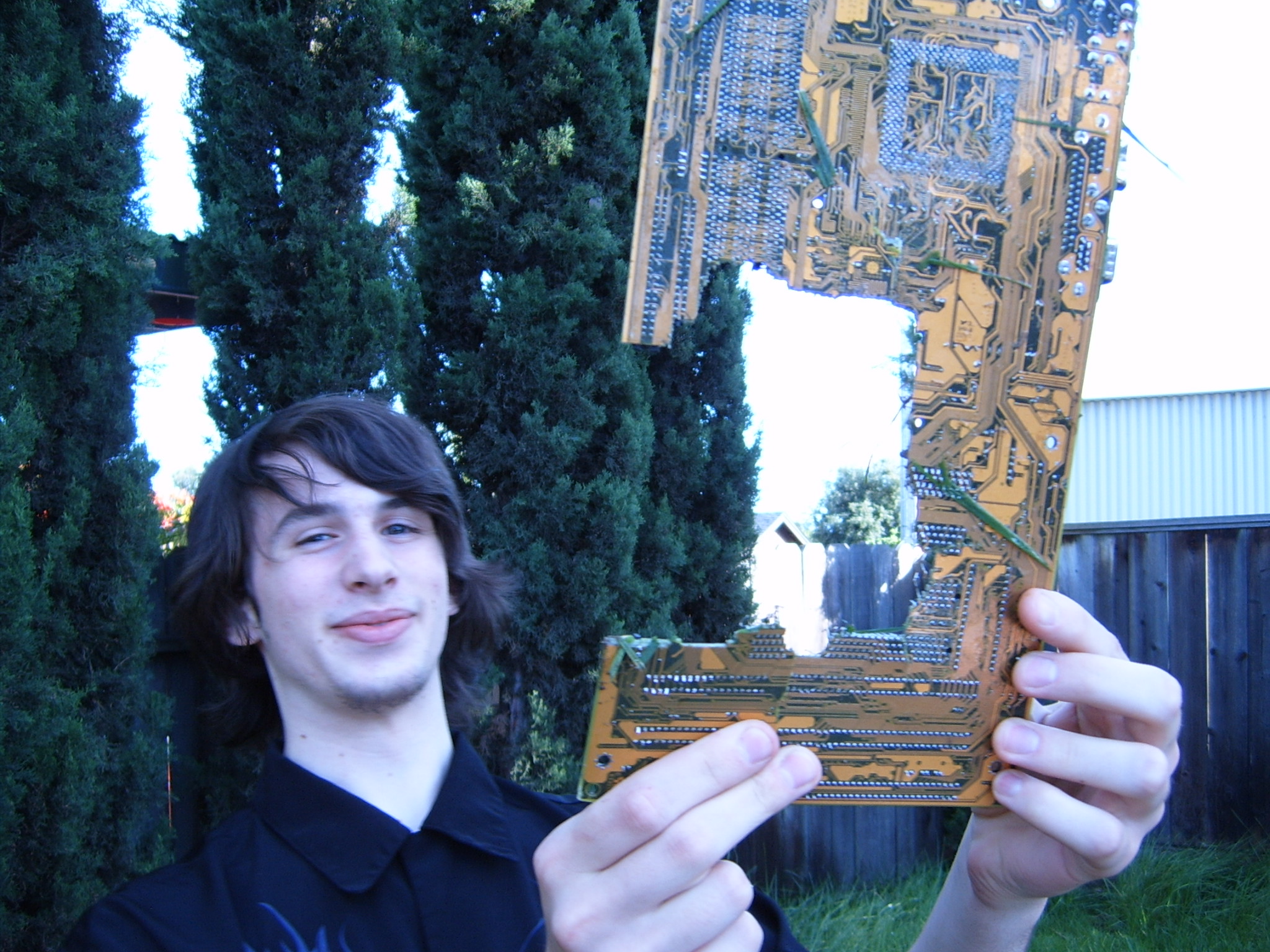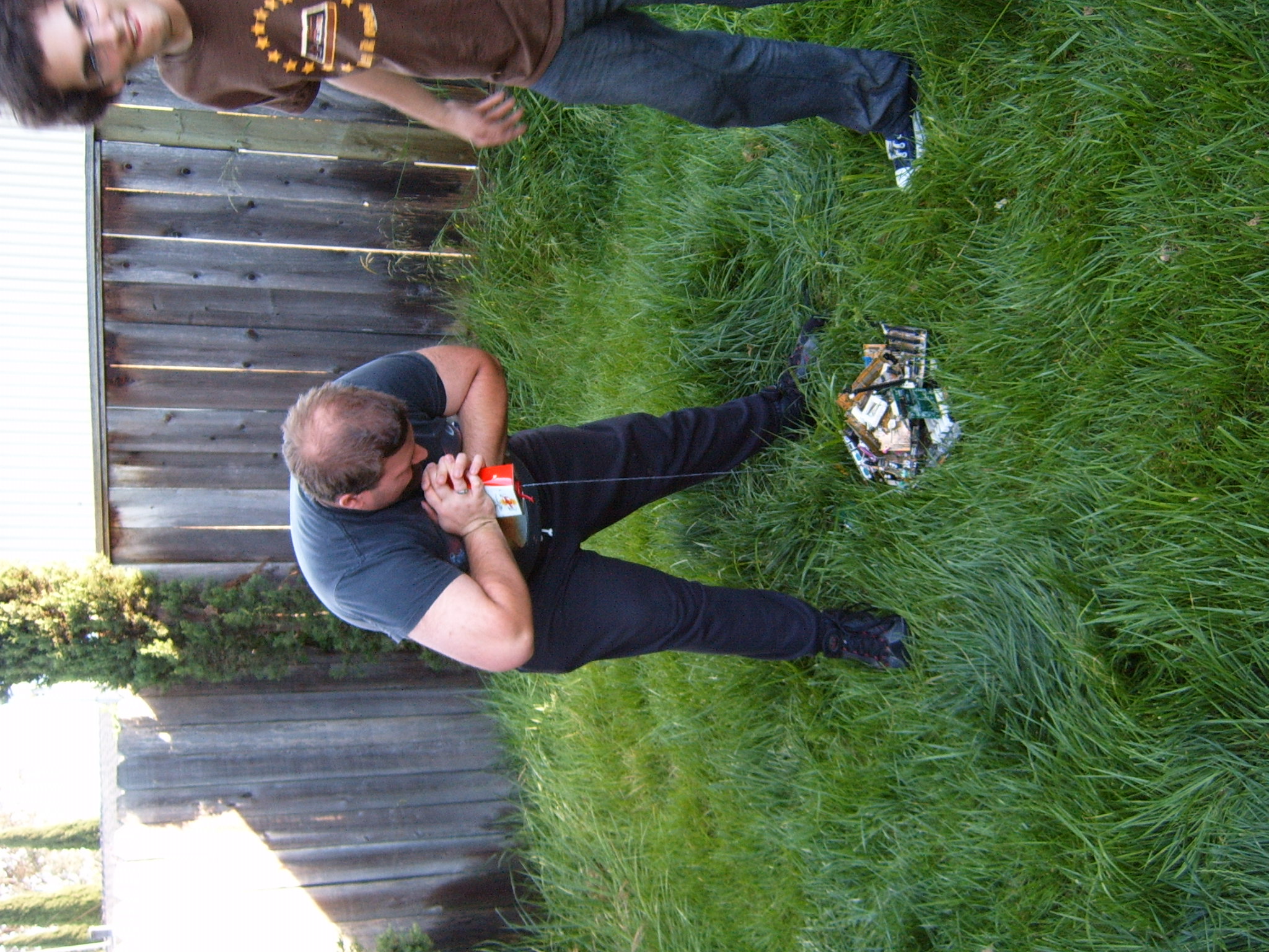 A cloud of noxious fumes rose from the burning mess, and Metalslug commented that he heard “chemical fires were really hard to put out.” Just about that time, the capacitors on the boards began to explode and pop, and for a few seconds, it was just like the 4th of July back home. While some of us retreated from the clouds of fumes, others poured water on the burning wreckage. After the fumes had blown away, and the fire was out, we all stood around the charred heap, feeling a huge sense of satisfaction and accomplishment. The fun didn’t stop there though. Mameman, as if by magic, conjured up a particularly huge and particularly ancient looking server board. We all examined it, and decided that it, in fact, must be burned as well. On went the gas, and up went the flames, as we once again reveled in the ecstasy of pure testosterone overload. Once that was over, we all took pictures of our achievements, and went back inside to play more games.