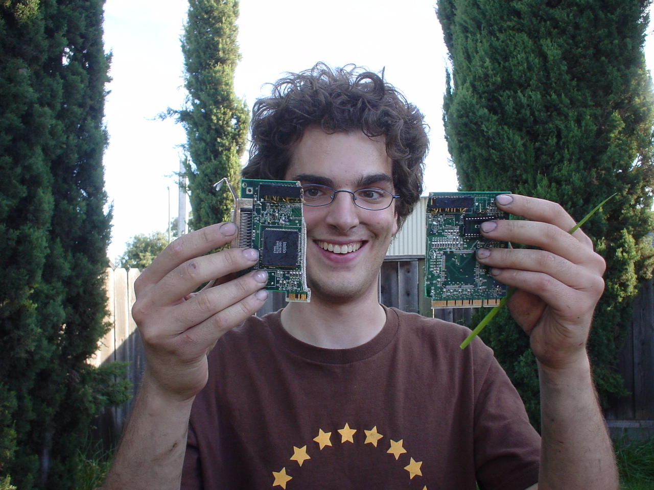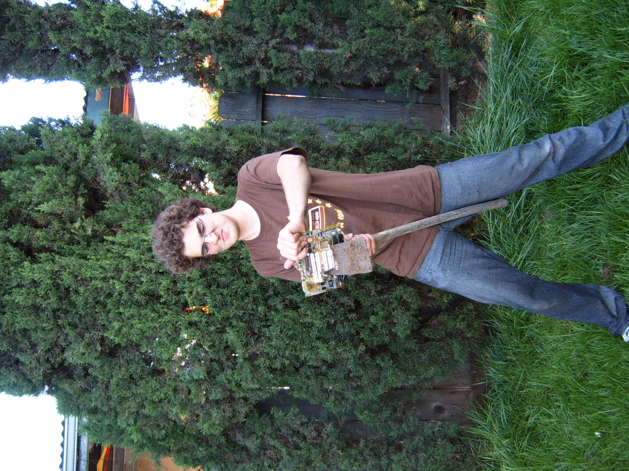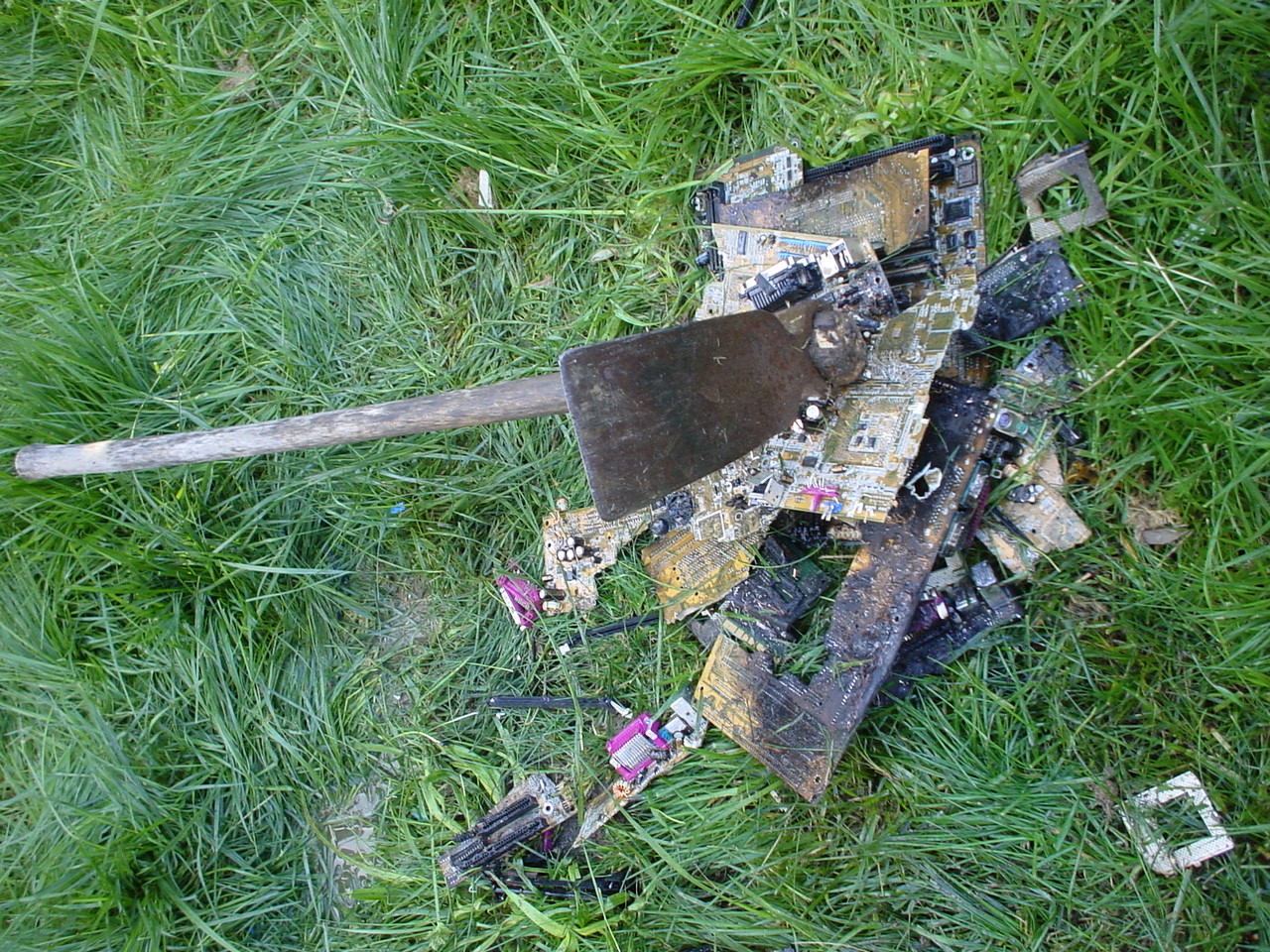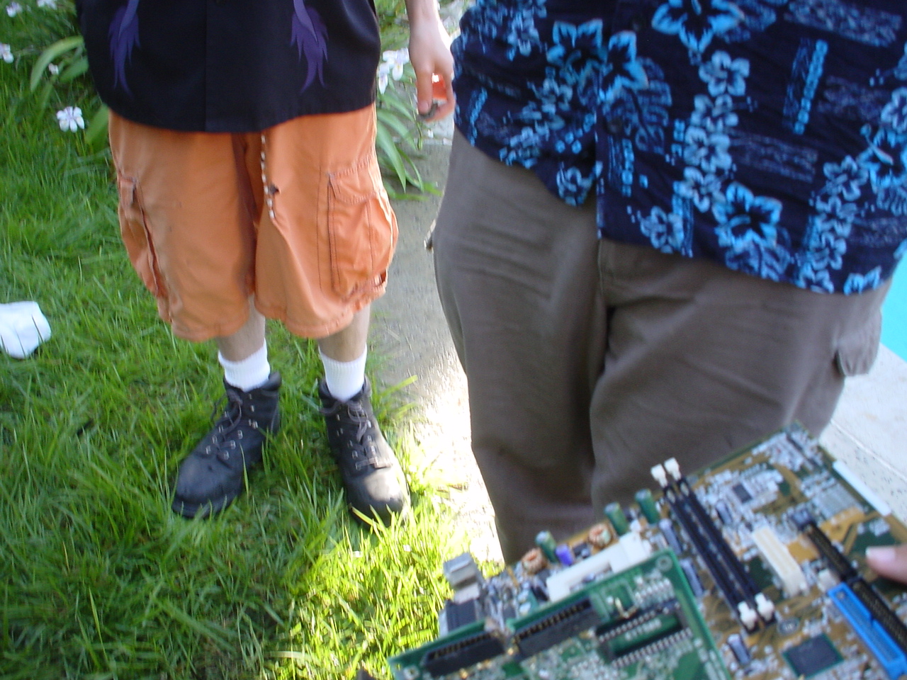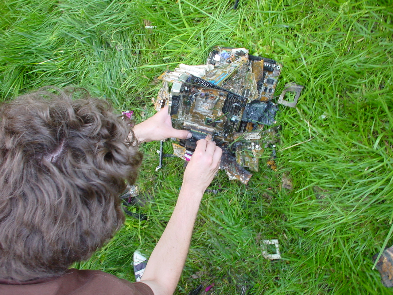 A cloud of noxious fumes rose from the burning mess, and Metalslug commented that he heard “chemical fires were really hard to put out.” Just about that time, the capacitors on the boards began to explode and pop, and for a few seconds, it was just like the 4th of July back home. While some of us retreated from the clouds of fumes, others poured water on the burning wreckage. After the fumes had blown away, and the fire was out, we all stood around the charred heap, feeling a huge sense of satisfaction and accomplishment. The fun didn’t stop there though. Mameman, as if by magic, conjured up a particularly huge and particularly ancient looking server board. We all examined it, and decided that it, in fact, must be burned as well. On went the gas, and up went the flames, as we once again reveled in the ecstasy of pure testosterone overload. Once that was over, we all took pictures of our achievements, and went back inside to play more games.