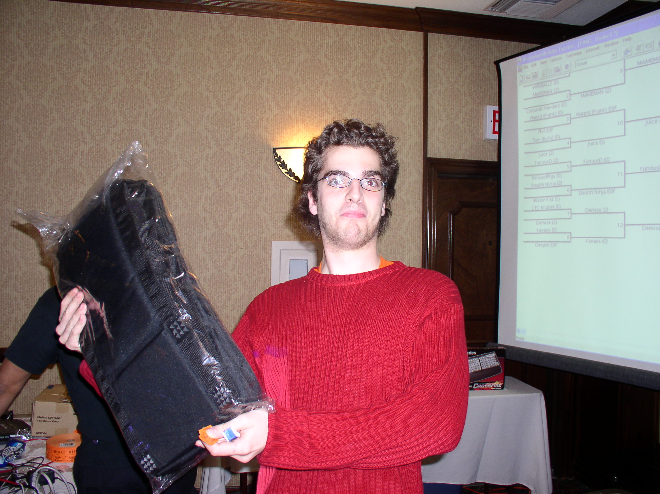 Last of the tournaments was a one on one Quake 3 tournament. We were pretty much expecting our Master Q3 player Demise to have it in the bag with little or no challenge at all. As it turns out there were a few exceptional Quake 3 players in attendance. One round I observed, Demise was down by 5 points and I remember thinking “wow, I guess Demise might not win this after all” but Demise ended up pulling through with 8 kills in a row to secure the victory. It was very impressive to say the least. Before long Demise began attracting an audience. One of the semi final rounds was also particularly intense when Demise went up against an eos clan member called Kaxos. Demise was at the pinnacle of concentration and focus, and didn’t even notice till the round was that he was surrounded by an audience of several people. Meanwhile, Mameman was working his way up the other end of the latter, defeating all opponents, and even overcoming seemingly unfair circumstances. In the end, it came down to two TMC members when Demise and Mameman faced off in the finals. Demise, being a more experienced player ended up dominating the match, but gave Mameman a few free kills as he went after him with the gauntlet. The final score was close, but Demise came out with the gold, and Mameman the silver, securing the first and second place prizes in Q3 in the name of TMC!