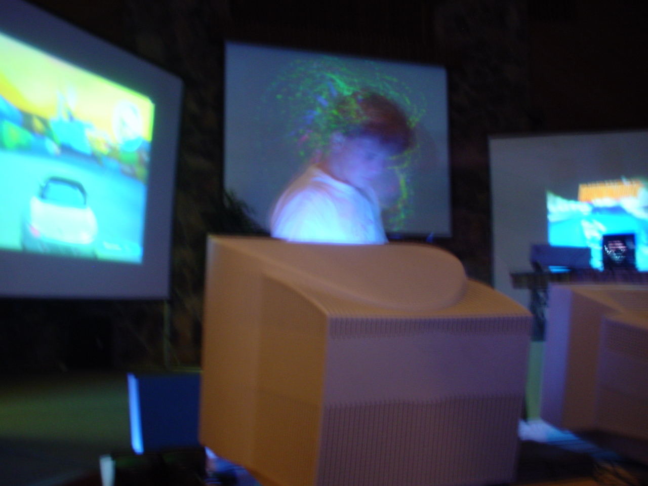 There were three large projector screens set up on the stage. Two were projecting popular console games (every console currently on the market was available for play), and the center screen was projecting visualization for the techno music that was pumping through the place. The music added a lot to the party atmosphere and at one point there was even a live DJ spinning records, which was EXTRA cool.
