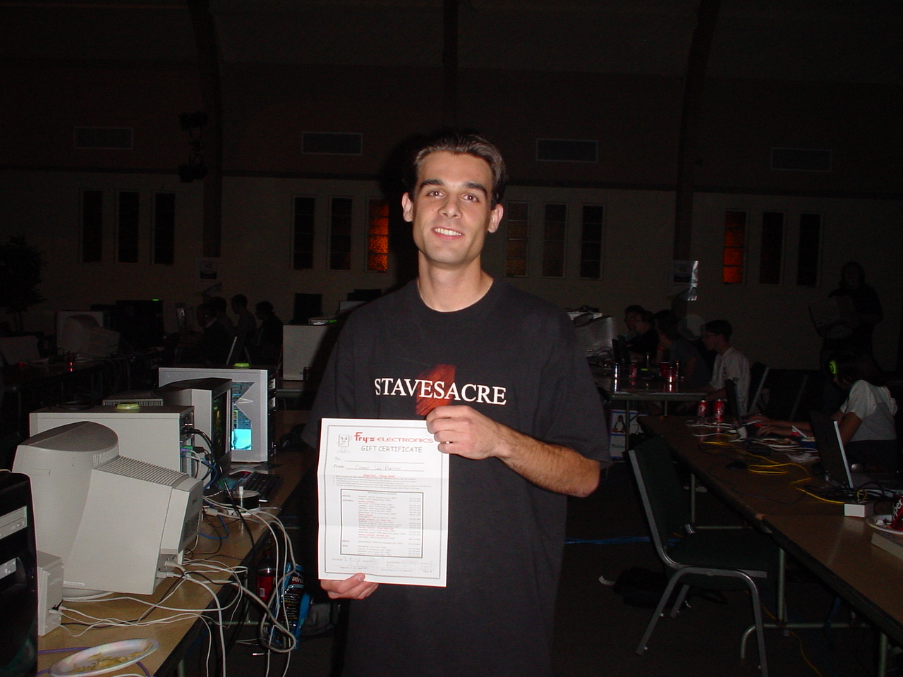 QueMine, Raven and I were in attendance, representing the Mowers Clan. We set up our rigs on one table and began fragging. QueMine and Raven's pimped out water-cooled rigs got a bit of attention from some of the other party goers and there were more than a few pics taken of their rigs. The primary games that were played were Medal of Honor, Jedi Knight 2 and Counterstrike. While we didn't do so well at CS, our clan members were always in at least the top three of the Jedi Knight 2 and MOH servers. There was a free-for-all MOH tournament held, in which the person with the most frags after 30 mins of play gets a $50 gift certificate to Frys. I came away the victor of that tournament with 176 kills. The second place player had 119 and QueMine came in third with 109.