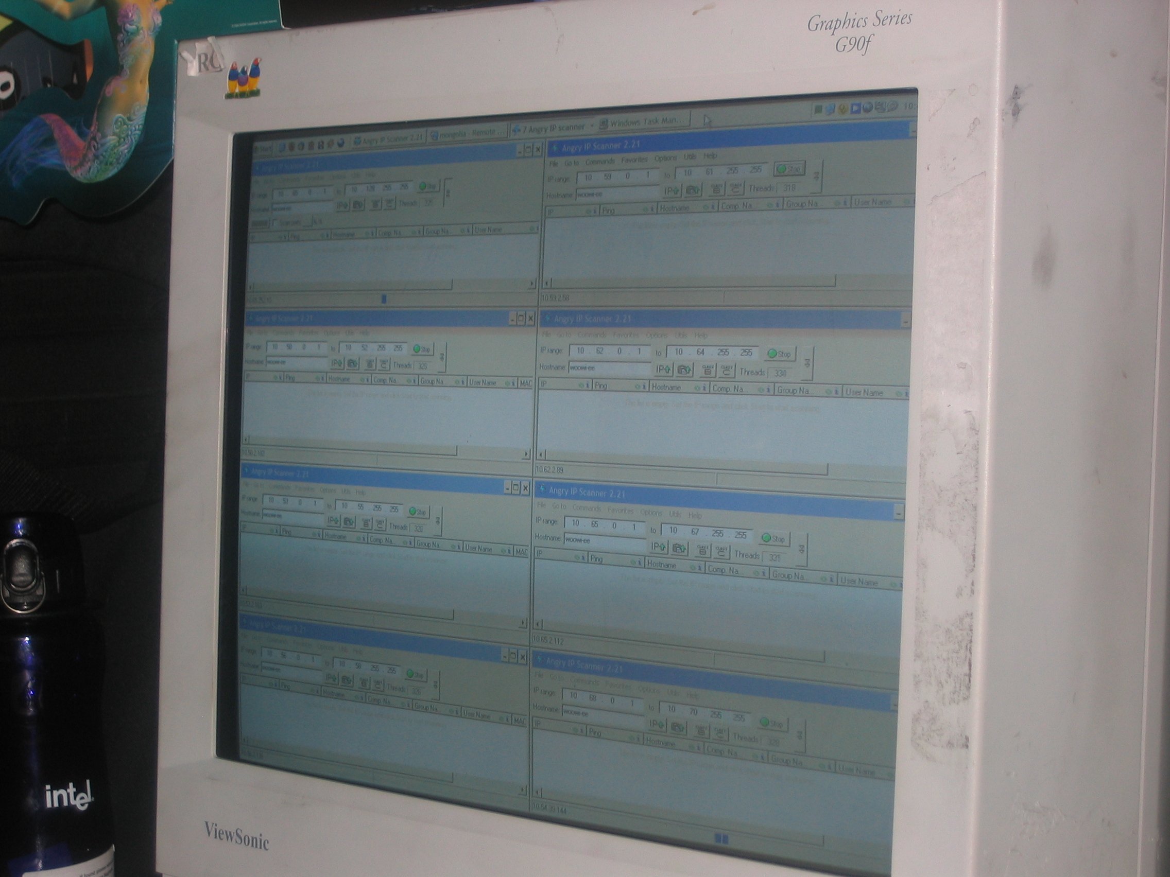 At one point Kaffine went back to the hotel to sleep, and Kraz had the brilliant idea to make use of the full power of Kaffine’s PC while he was away and not using it. Kraz put his computer to work and had it scan IP’s as fast as it could go. At this rate, it looked like we would be on track to find the gateway in much less time. Unfortunately, Kraz totally spaced out when he set up the scan and included the broadcast range as part of the scan. That meant he was sending broadcast packets out to the ENTIRE network several thousand times a second, essentially it was like we were launching a Denial Of Service attack on the network.