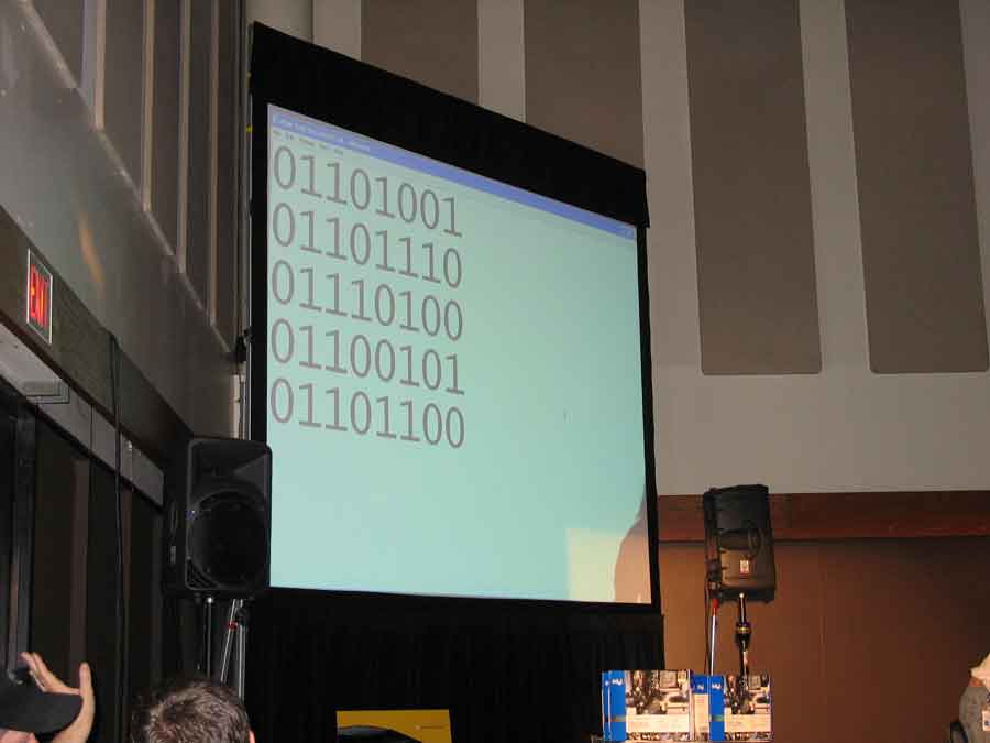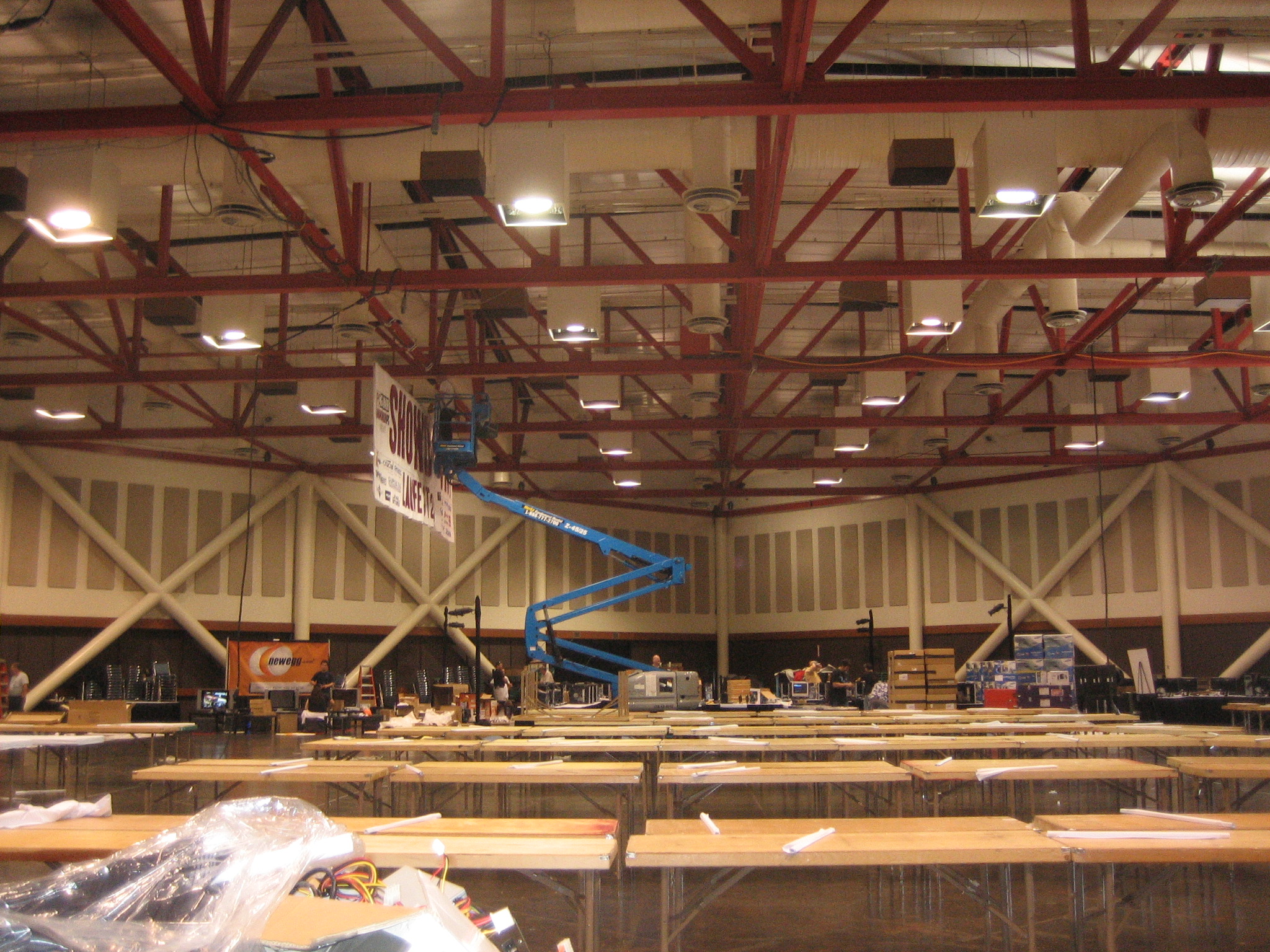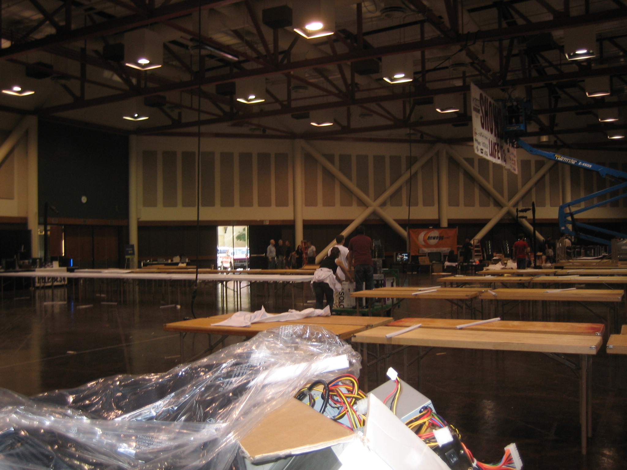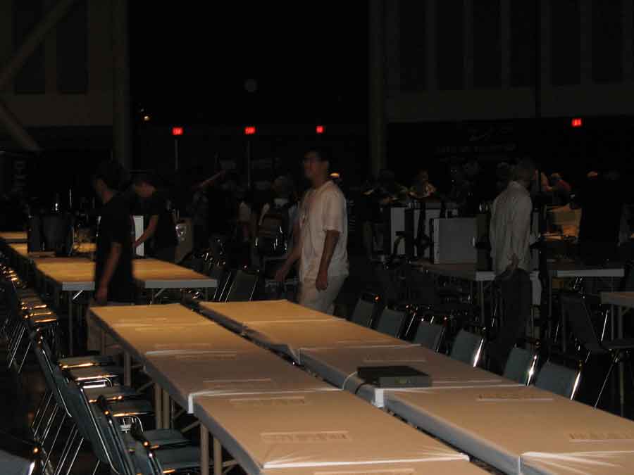 Not too long after we came back, Antec held a musical chairs contest that JonDoms Mcee'd and we saw some really cool action of Hypertheading on my file server. The Friday night late night crew had no internet but what we lacked in connectivity we made up for in refrigerated exhibition hall. I was not able to connect to the TECH wifi connection, but Gat3keeper was. Gat3keeper also had uber leet pwn you in the butt Trackmania maps. That JonDoms was able to put on the Trackmania server, after he brought us some breakfast. Pancakes/eggs/hav/beacon/potatoes.